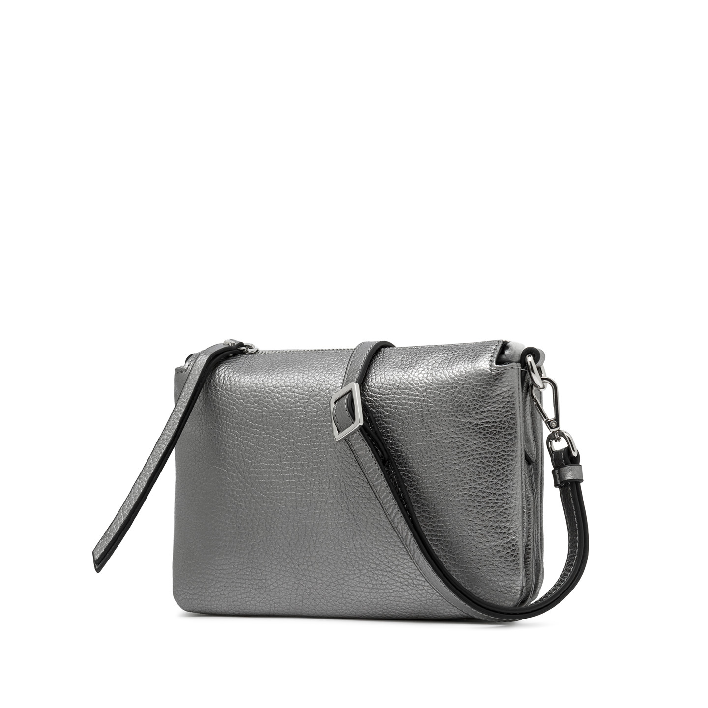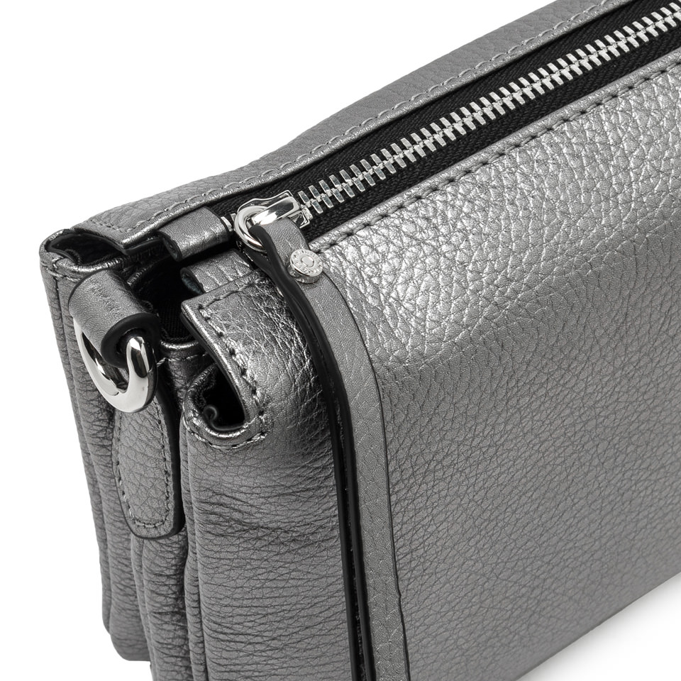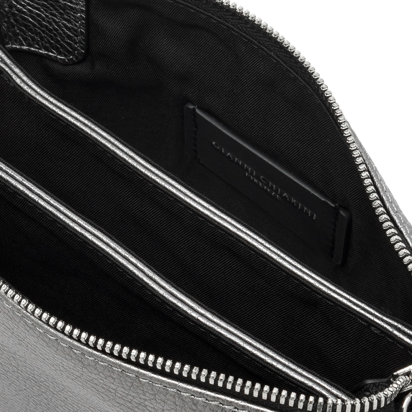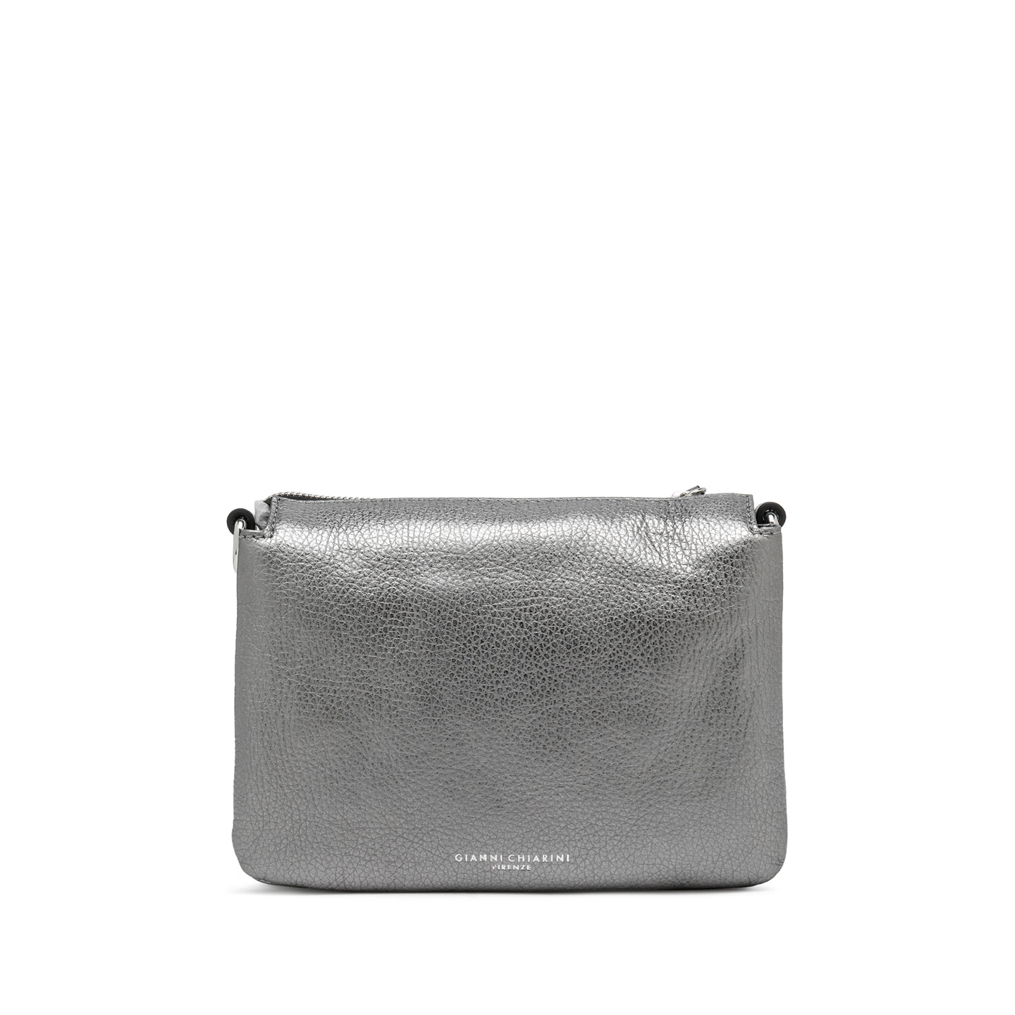 Zum Tragen in der Hand oder mit dem schmalen Trageriemen aus Leder, die Tasche Three by Gianni Chiarini Firenze ist aus edlem laminiertem, genarbtem Leder gefertigt. Sie ist jung und witzig und hat ein innovatives Design mit kontrastierenden Reißverschlüssen an der Oberseite. Perfekt für lockere Outfits, aber auch für elegante Abende geeignet. Maße: 21x15x6 cm.