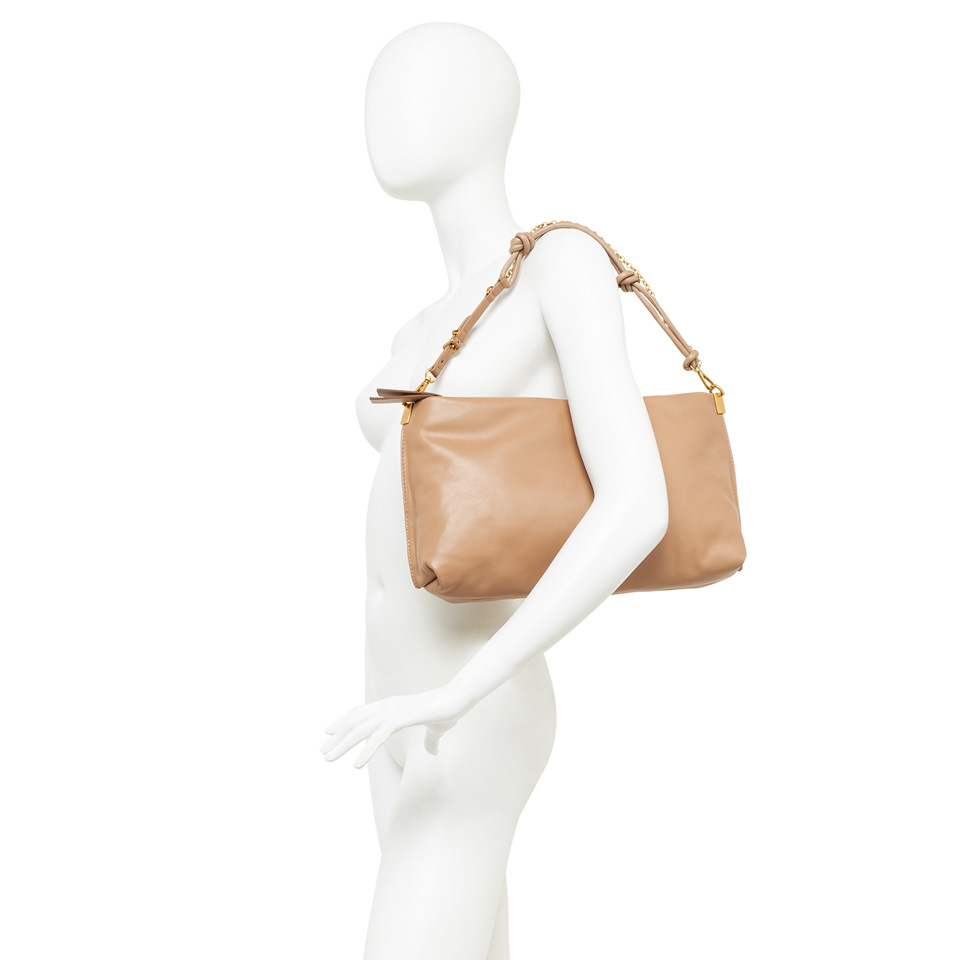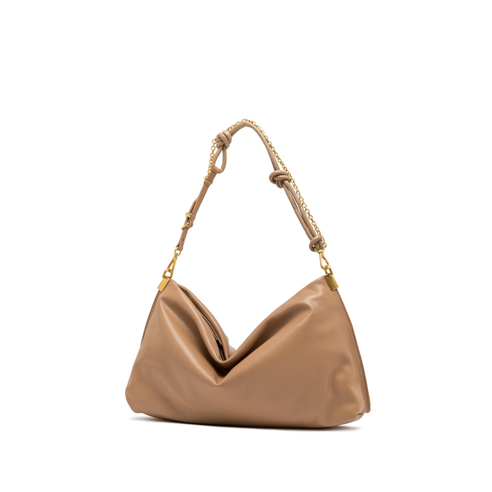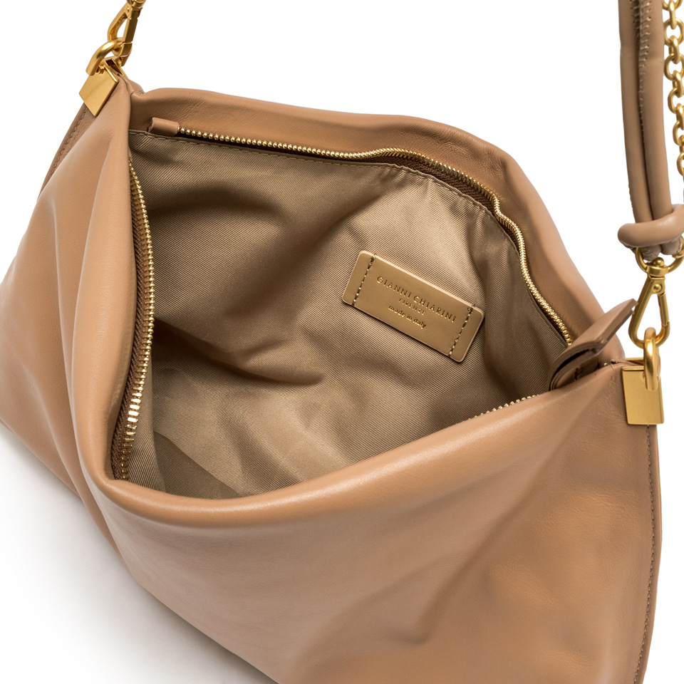 Fanny by Gianni Chiarini Firenze ist eine Tasche mit einer weichen, länglichen Silhouette, die unbestreitbar feminin und modern ist, perfekt auch für die Abendgarderobe. Sie ist aus Leder gefertigt und hat einen Reißverschluss an der Oberseite. Die doppelte Tragbarkeit erlaubt es, sie dank des Henkels mit goldener Kette über der Schulter oder mit dem Trageriemen aus Leder als Crossbody zu tragen. Die Details in Form von Knoten und Elementen aus Metall verleihen ihr einen Hauch von Lebendigkeit und Glanz und machen sie für jede Gelegenheit geeignet. Maße: 35,5x21x9 cm.