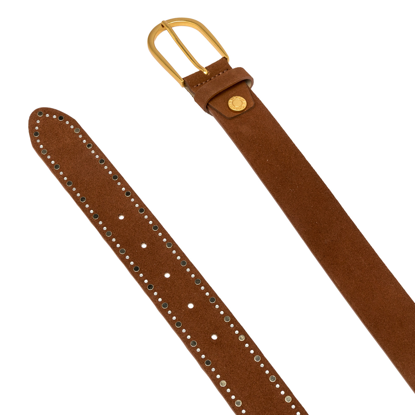 Belt with minimalist lines, perfect for completing casual or elegant looks. Made from suede, it stands out with a mix of studs and a metal logo buckle, adding a bold, confident edge.