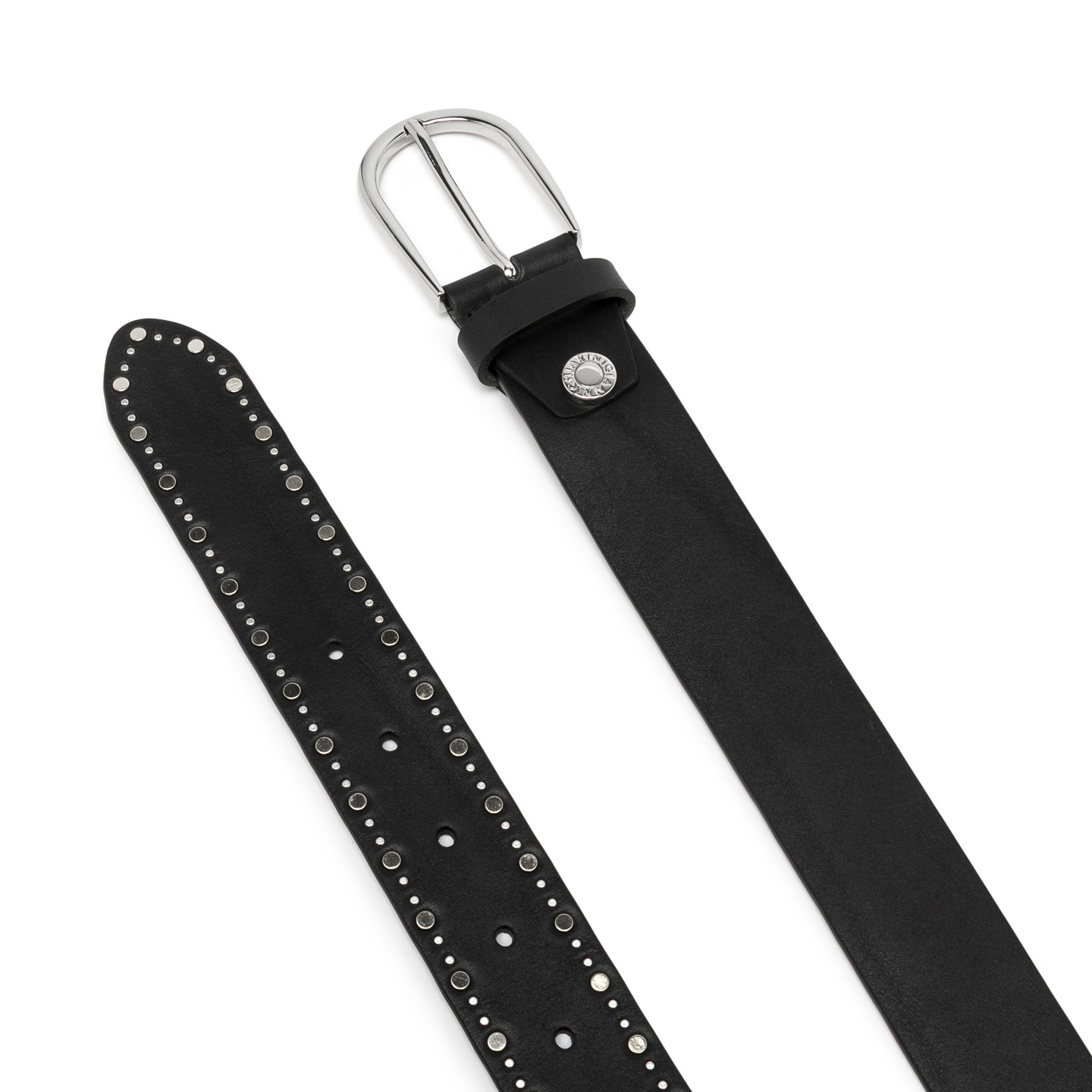 Belt with minimalist lines, designed for completing casual or elegant looks. Made from smooth leather, it stands out with a mix of studs and a metal logo buckle, adding a bold, confident edge.