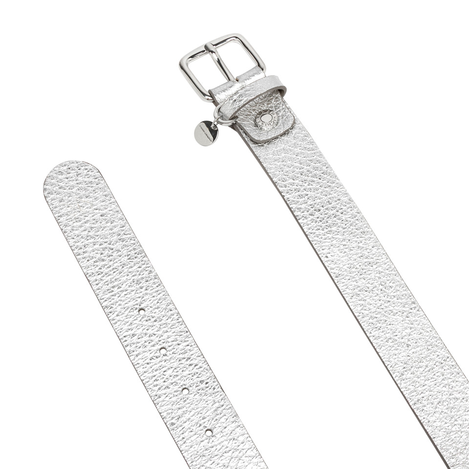 Flat belt with refined, minimalist lines, ideal for completing both casual and elegant outfits. Made from maxi-grain leather, it is enriched with a logoed buckle adorned with a charming logoed pendant.