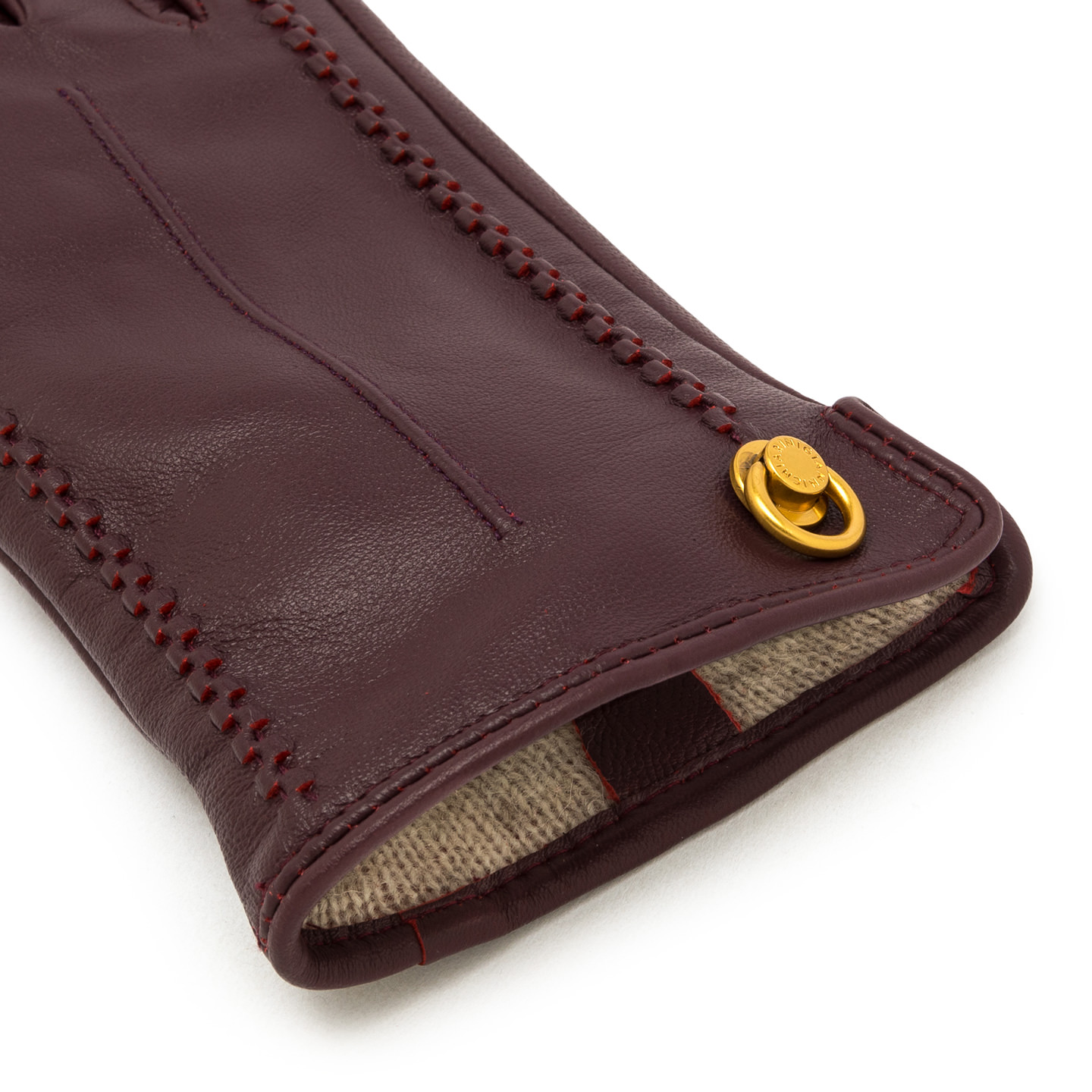 Soft napa leather gloves, lined with cozy wool for enveloping comfort. The gold-tone ring and logo-embossed rivet enhance the design, adding timeless elegance. An accessory that embodies style and sophistication.
