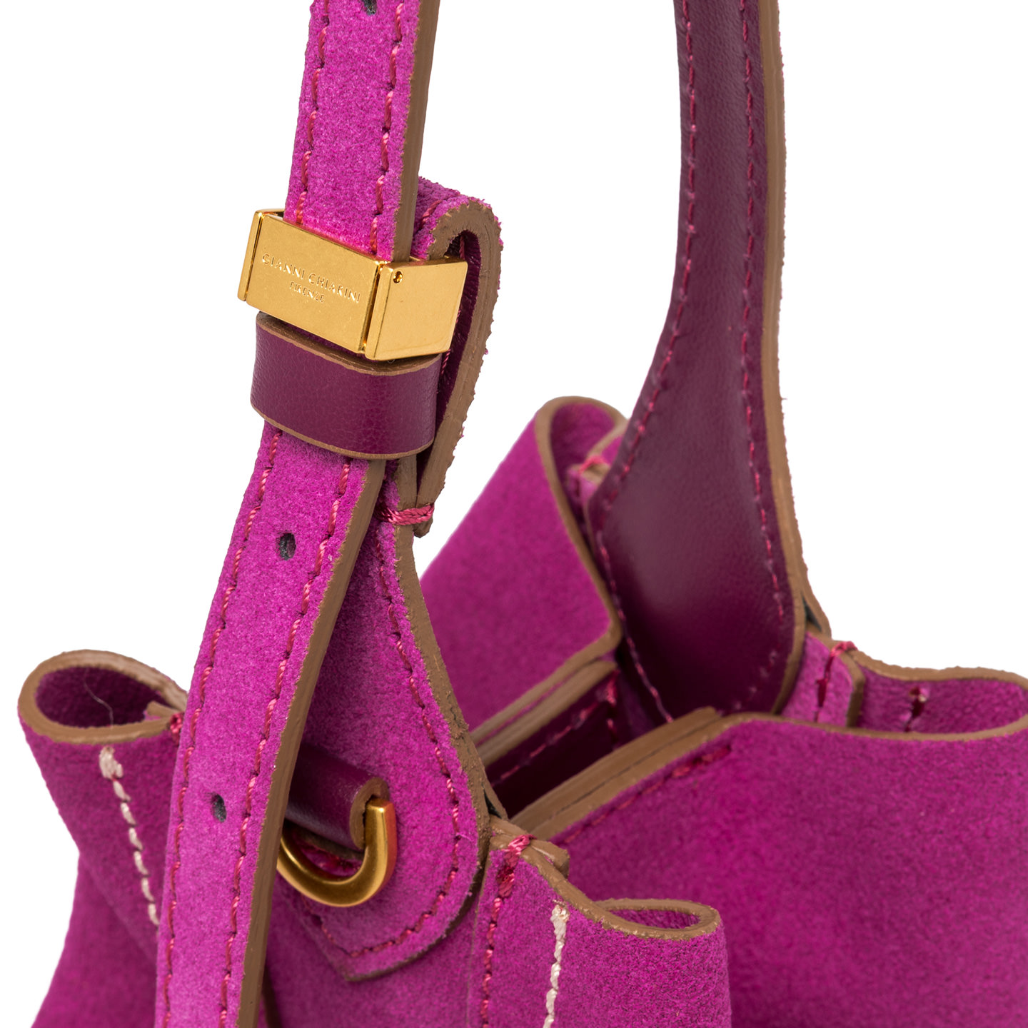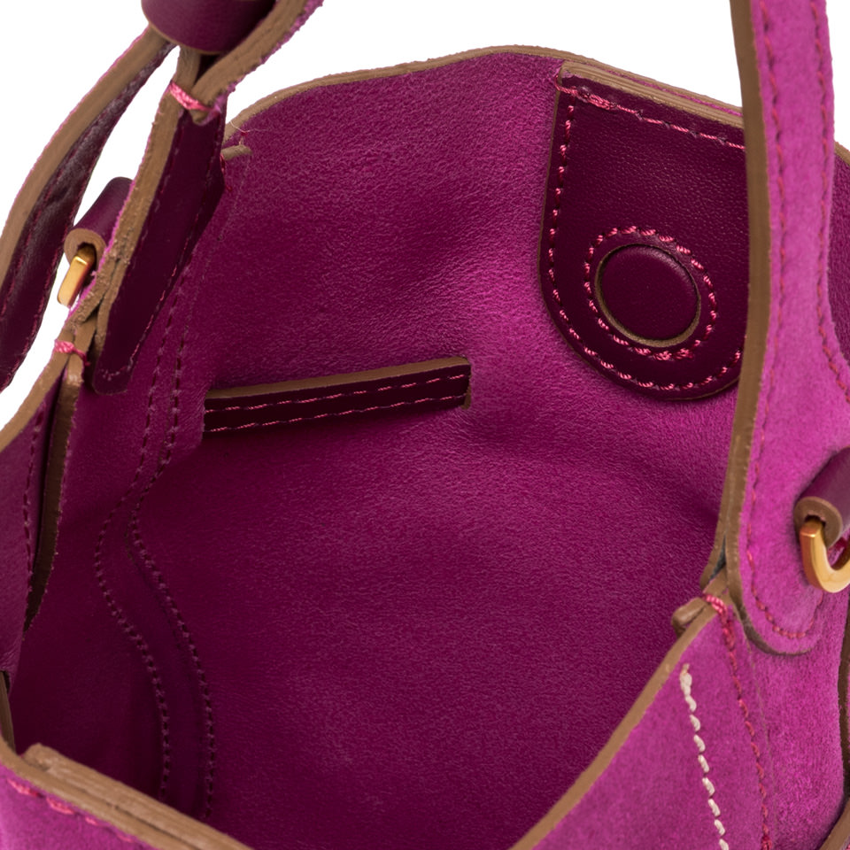 Sienna is the new line by Gianni Chiarini Firenze, defined by its soft yet feminine shape, perfect for a casual-chic look. Crafted from suede, it features contrast topstitching that highlights its silhouette. Equipped with a single compartment and magnetic clasp closure, it's enhanced with iconic metallic details like the double-loop logoed charm and metallic tips. Wear it by hand or on the shoulder with the included adjustable strap. Size: 15x20x8 cm.
