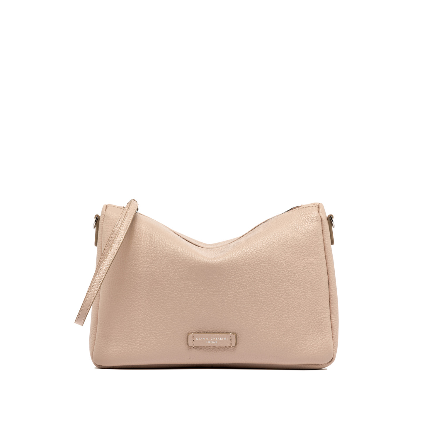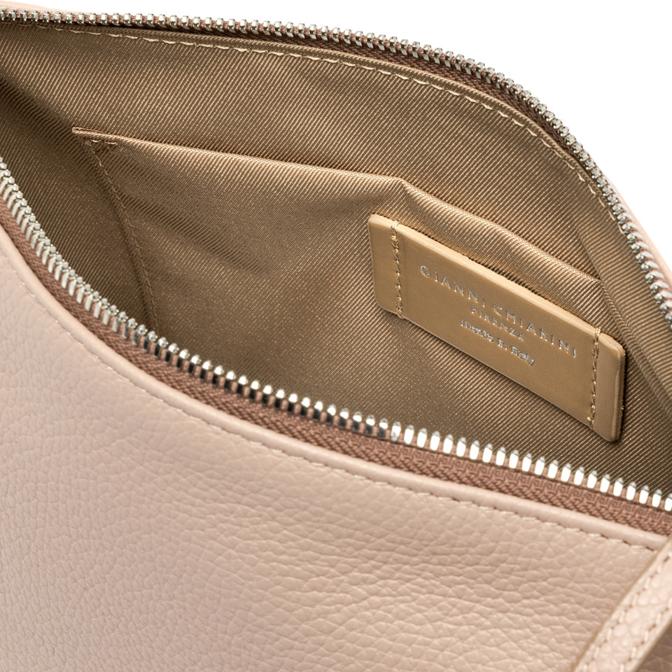 Nora Pouch by Gianni Chiarini Firenze is made of hammered leather. It features a leather strap to wear it at the wrist, in addition to an adjustable and removable shoulder strap in leather. Zipper closure. Size: 28x21x9 cm.