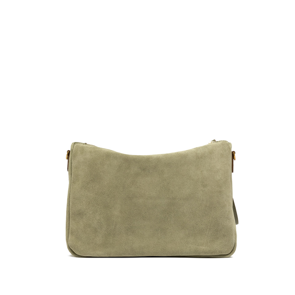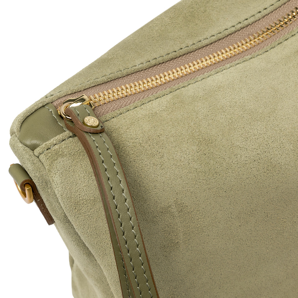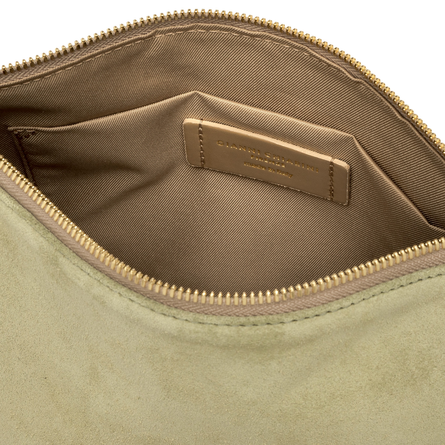 Nora Pouch by Gianni Chiarini Firenze is made of soft suede. It features a leather strap to wear it at the wrist, in addition to an adjustable shoulder strap in leather, both removable. Zipper closure. Size: 28x21x9 cm.