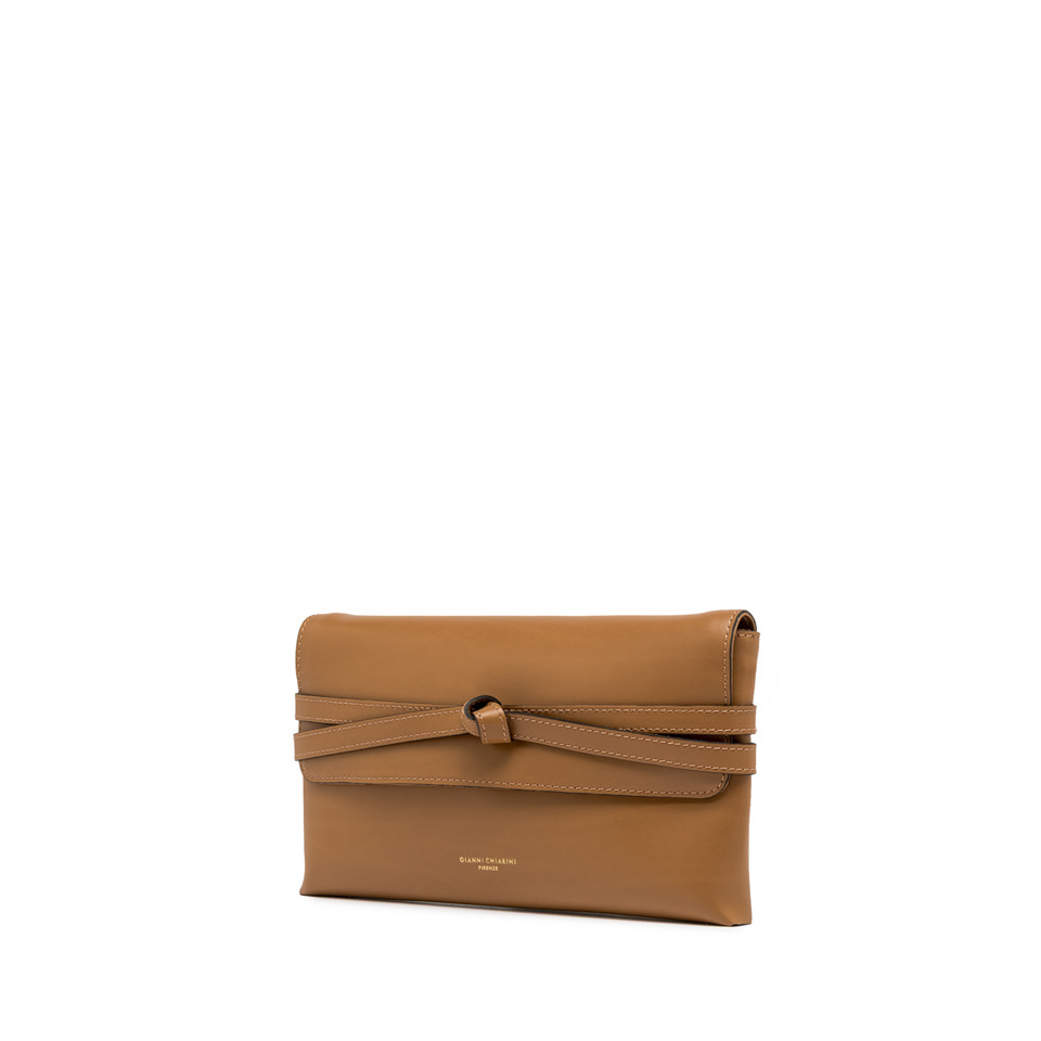 Belty is the new clutch bag by Gianni Chiarini Firenze, made of smooth leather and enriched with leather details. Its standout feature is the strap that wraps around the bag like a belt, creating an elegant decorative knot on the front. The shoulder strap makes it perfect to wear also cross-body.