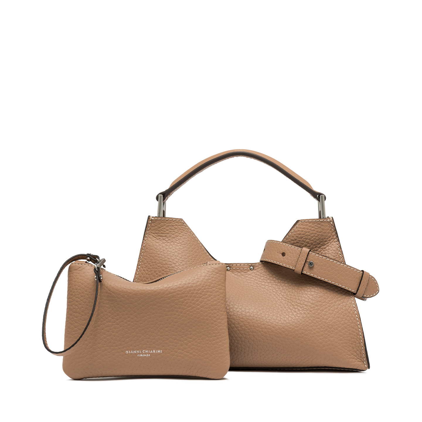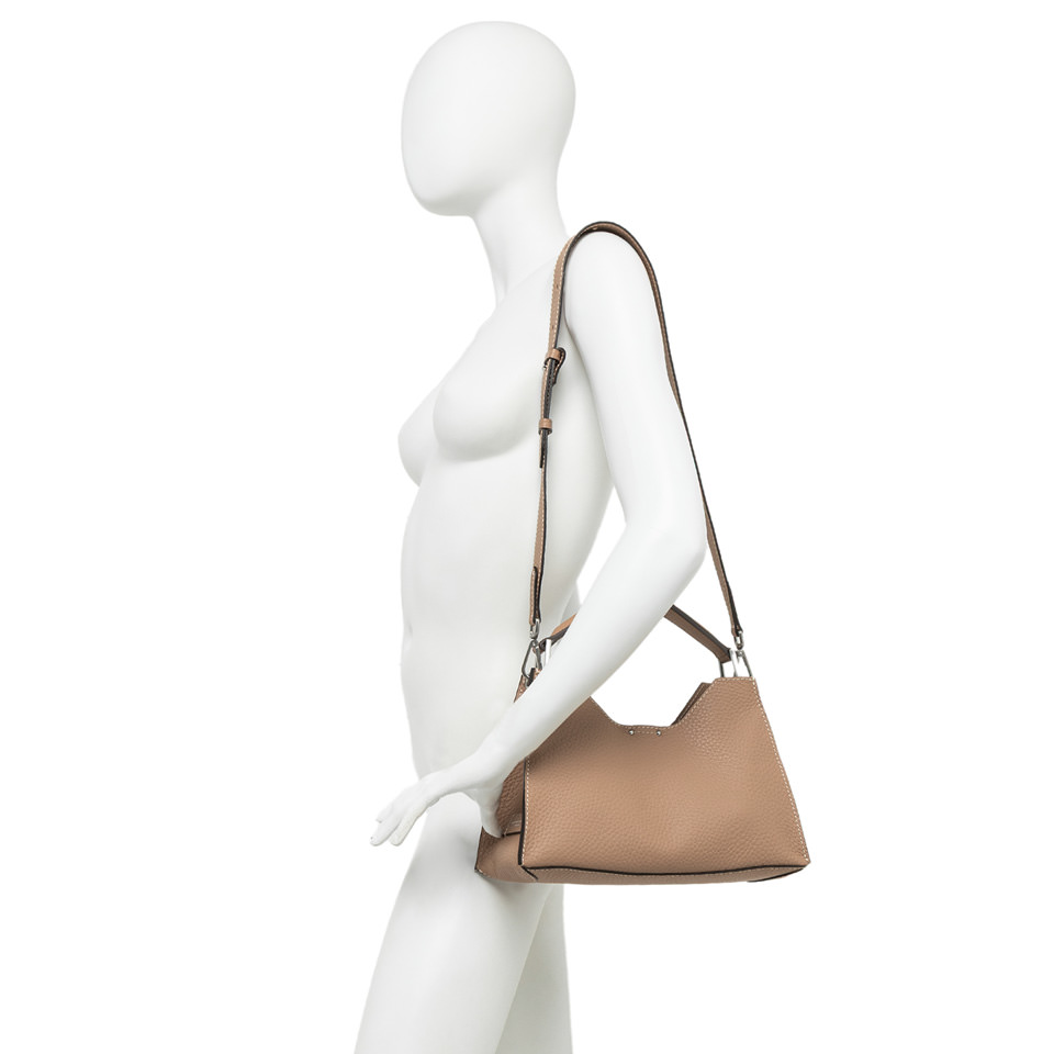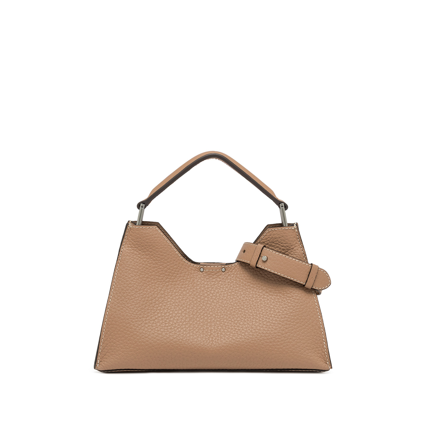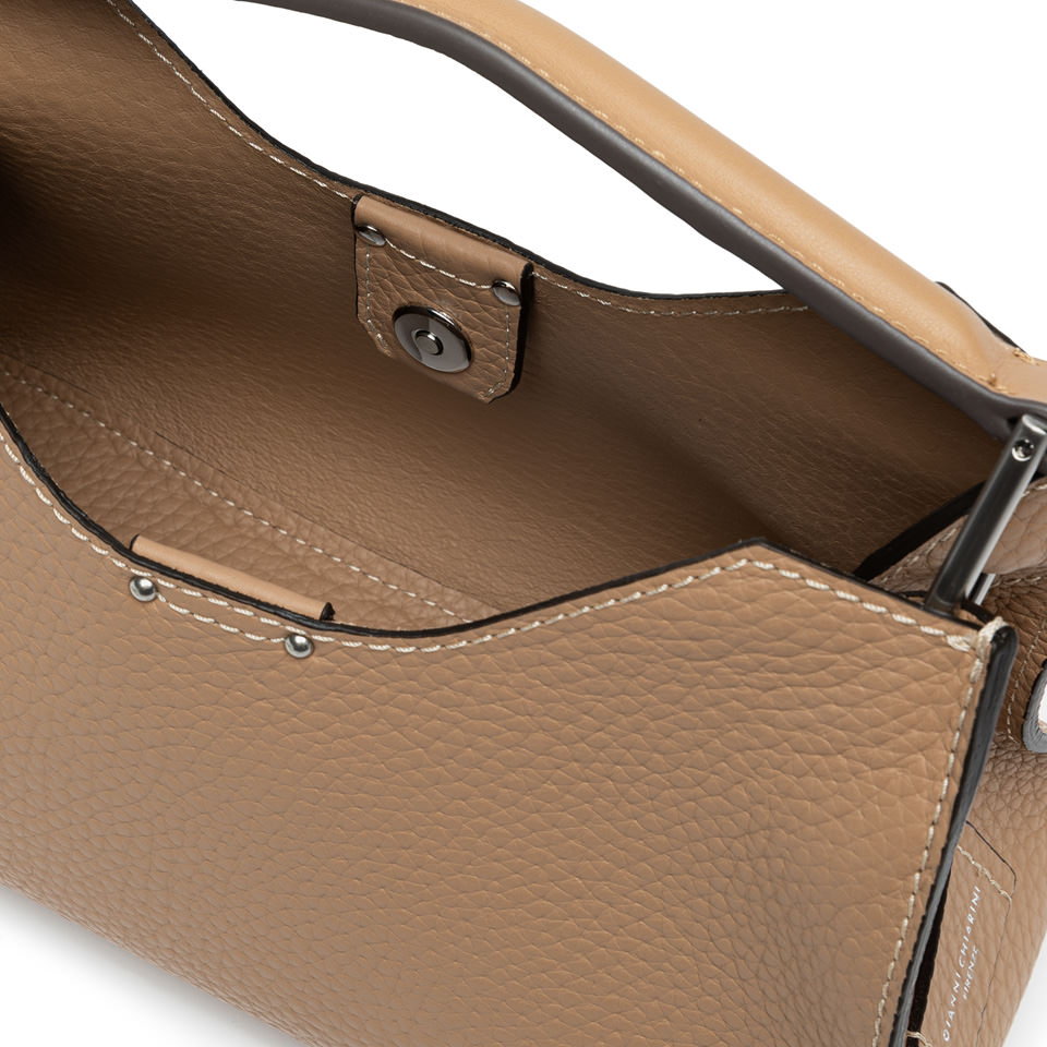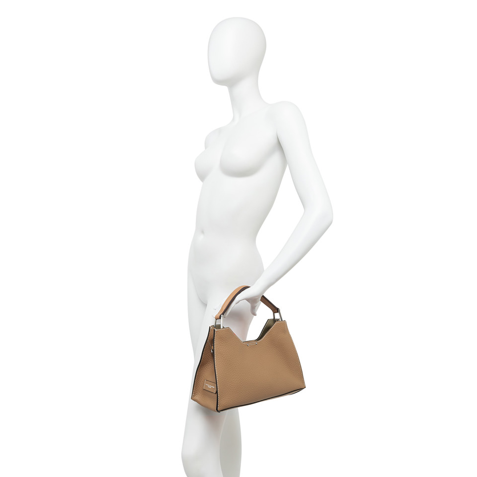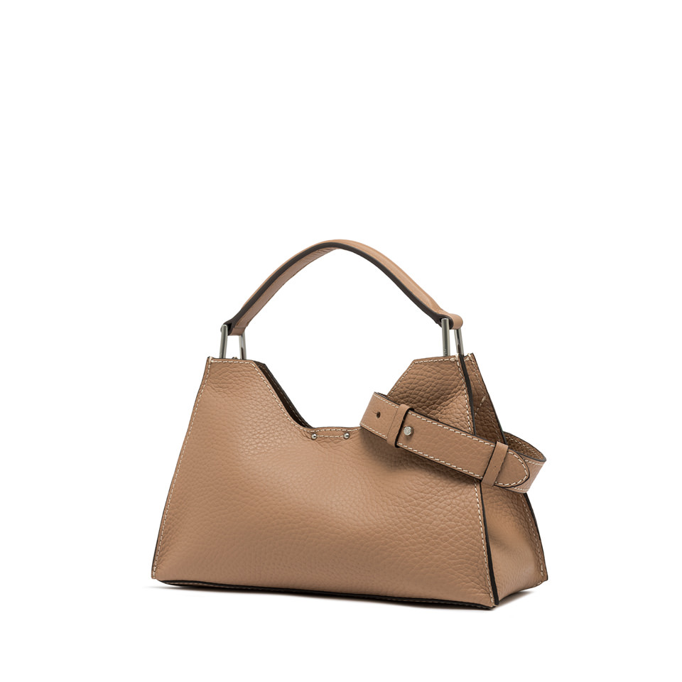 Aurora by Gianni Chiarini Firenze stands out with its trapeze shape, a perfect blend of contemporary elegance. Made from maxi-grain hammered leather, it's enriched with metal accents and contrast stitching that highlight its design. It includes a removable and adjustable leather strap for two-way wear. Finished with a practical zip pouch and a magnetic clasp top closure, for added security and convenience. Size: 32x22x11 cm.
