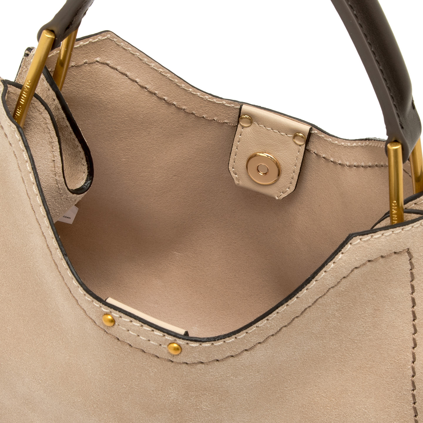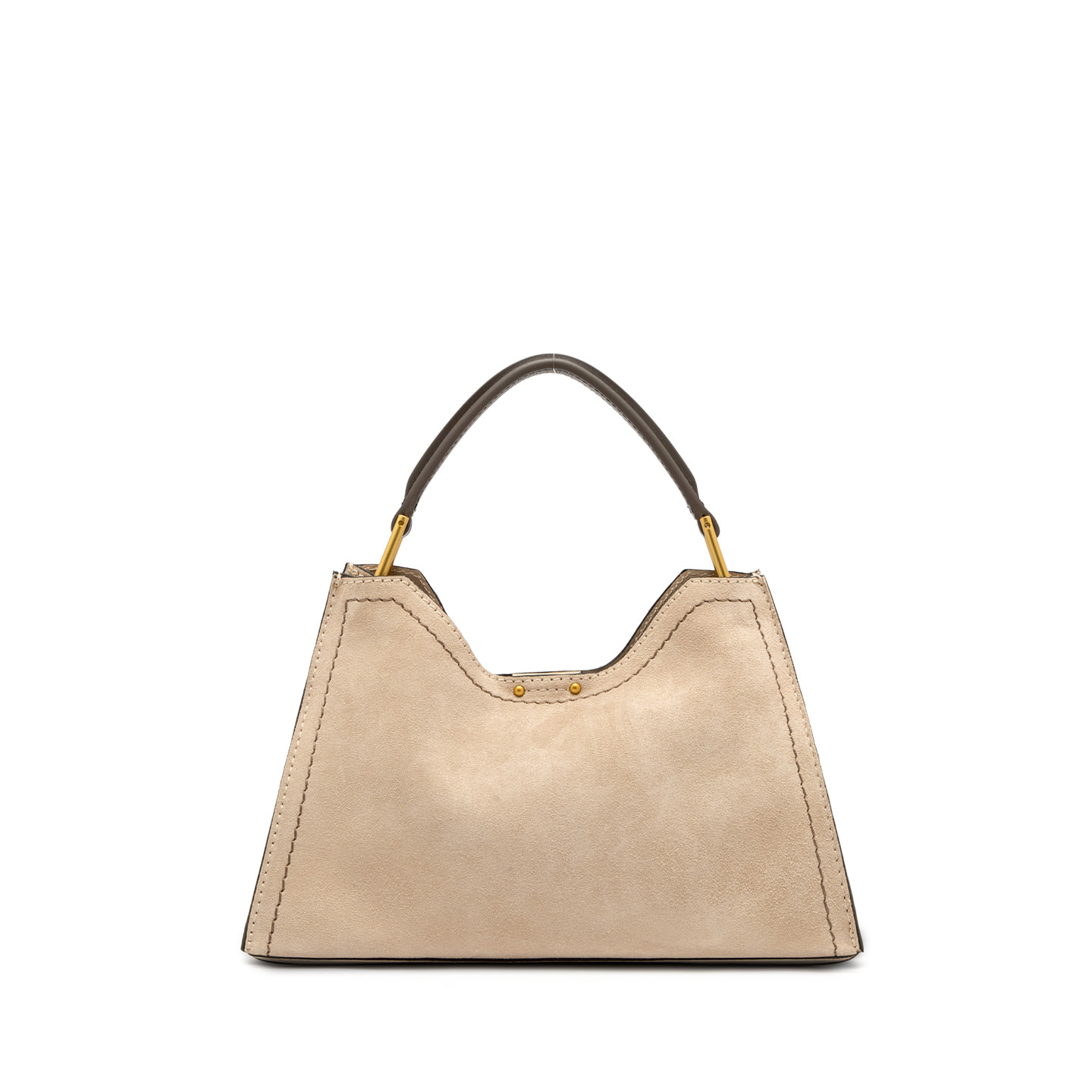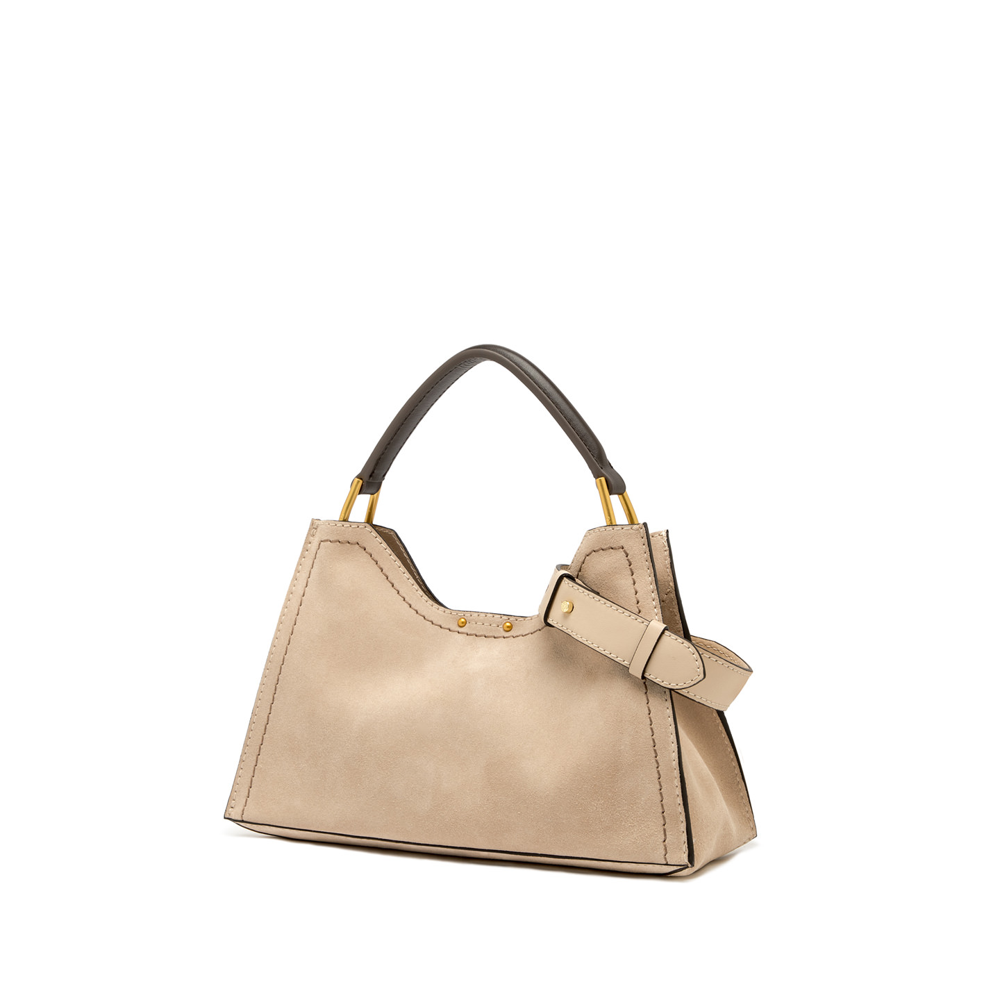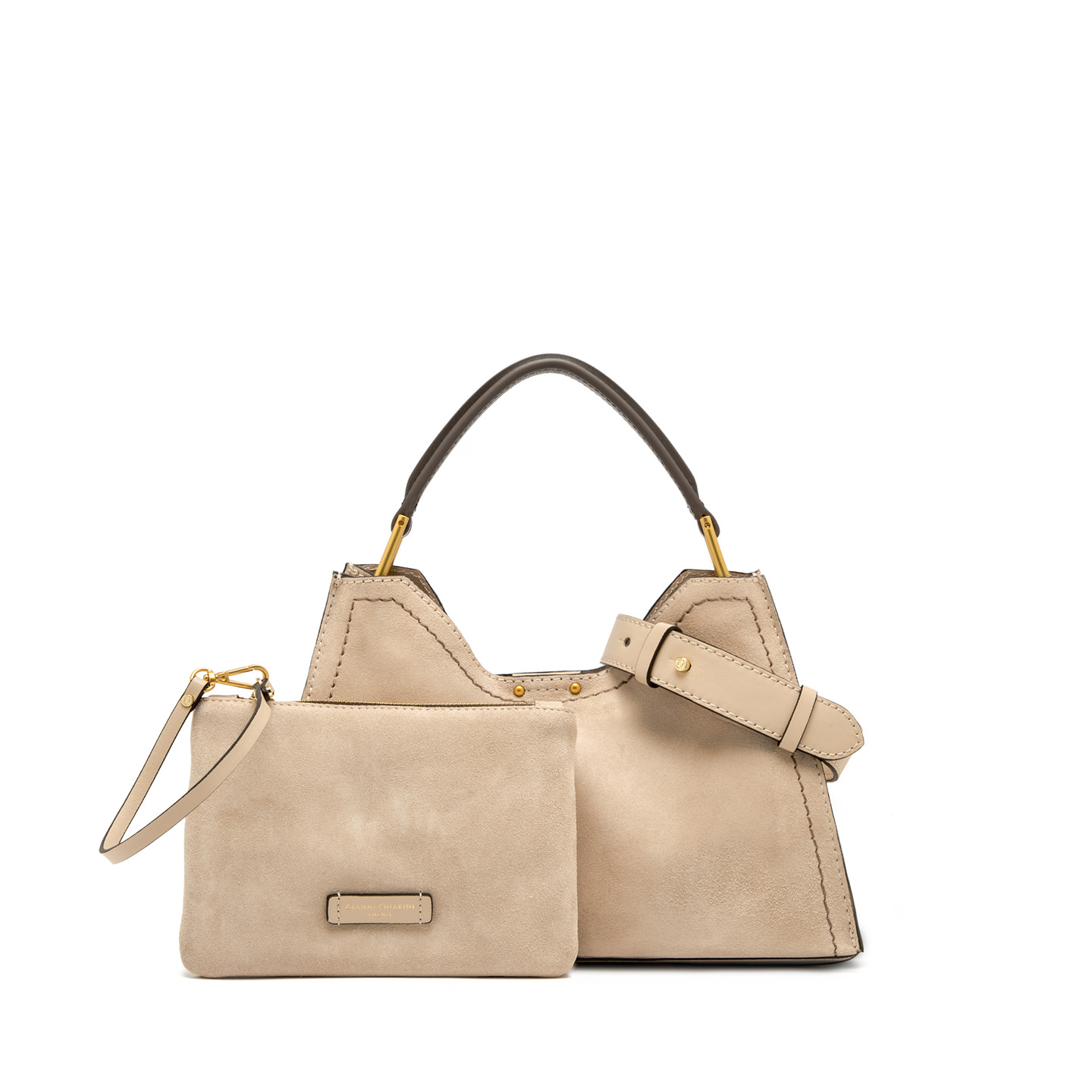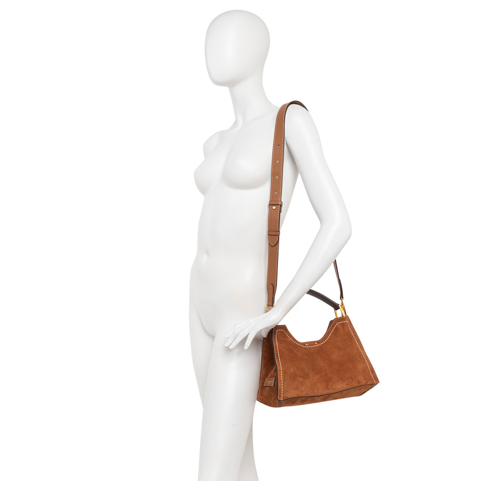 Aurora by Gianni Chiarini Firenze stands out with its trapeze shape, a perfect blend of contemporary elegance. Made from soft suede, it's enriched with metal accents and contrast stitching that highlight its design. It includes a removable and adjustable leather strap for two-way wear. Finished with a practical zip pouch and a magnetic clasp top closure, for added security and convenience. Size: 32x22x11 cm.