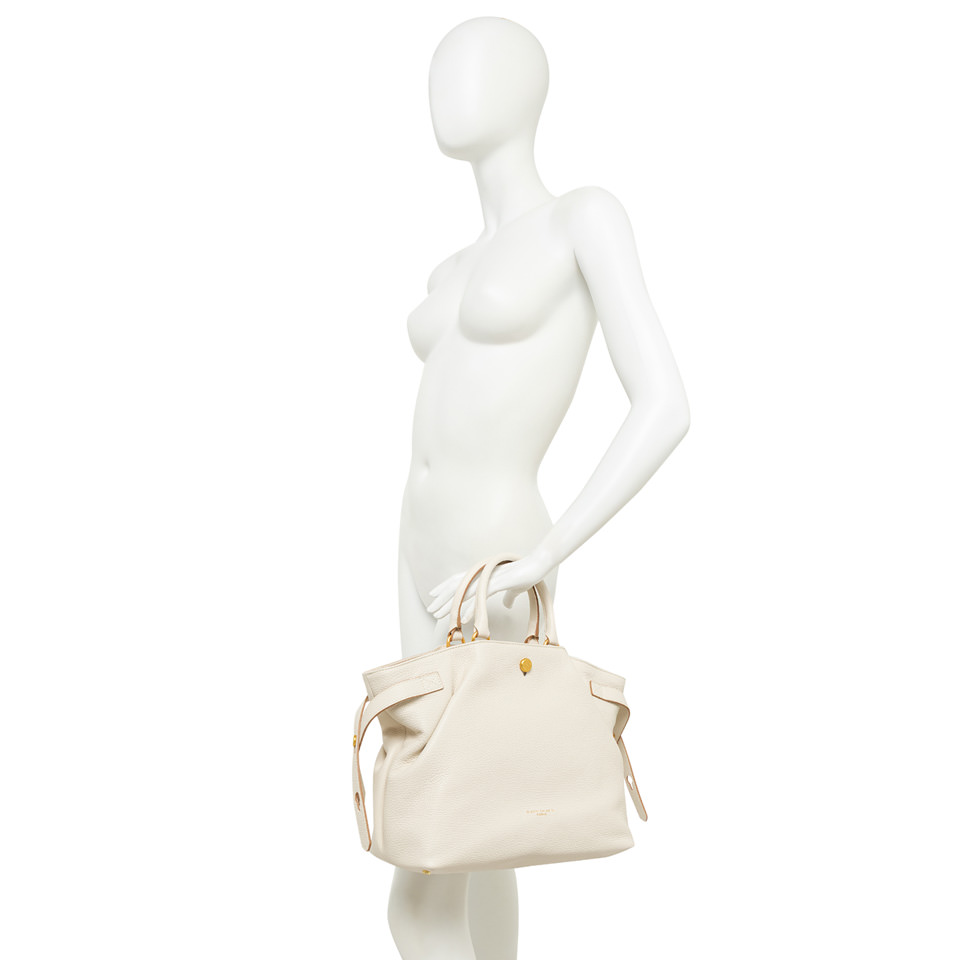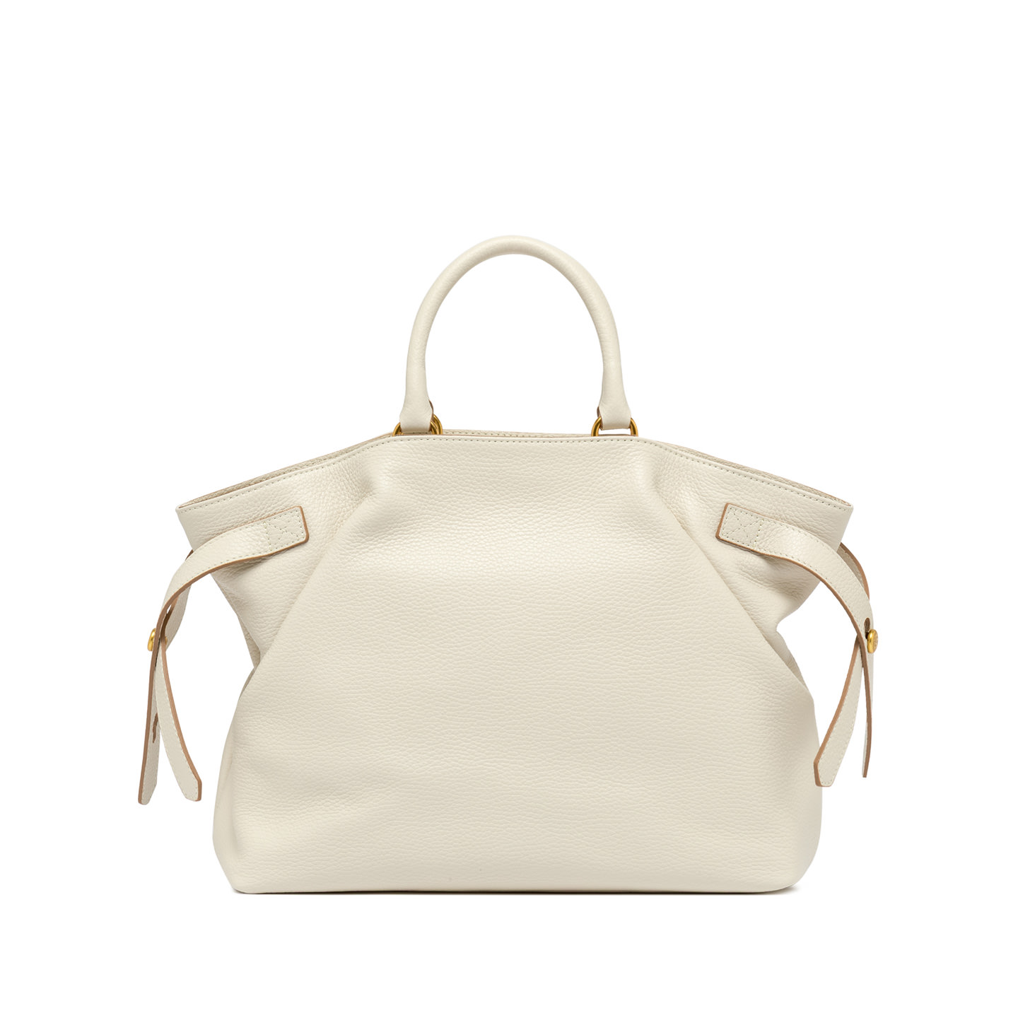 Claudette is an elegant, versatile bag crafted from hammered leather. Metal details and signature logo cufflinks add distinctive flair, while the side ties lend fluidity to the silhouette. It offers two carrying options: by the leather handles or cross-body with the adjustable strap. Size: 33x24x14 cm.