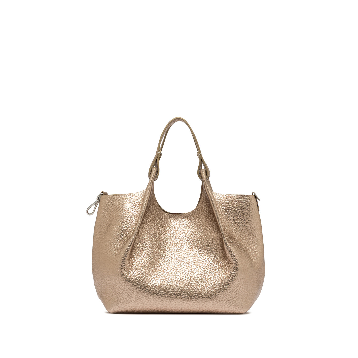 The iconic Dua bag, crafted from double bubble leather, stands out for its unique texture. It features an unlined single compartment, top profiles in hammered leather and color matching double handles. Practical and essential, it is perfect to stylishly enhance any look. It can be carried as a handbag at the shoulder. Size: 24x27x12 cm.