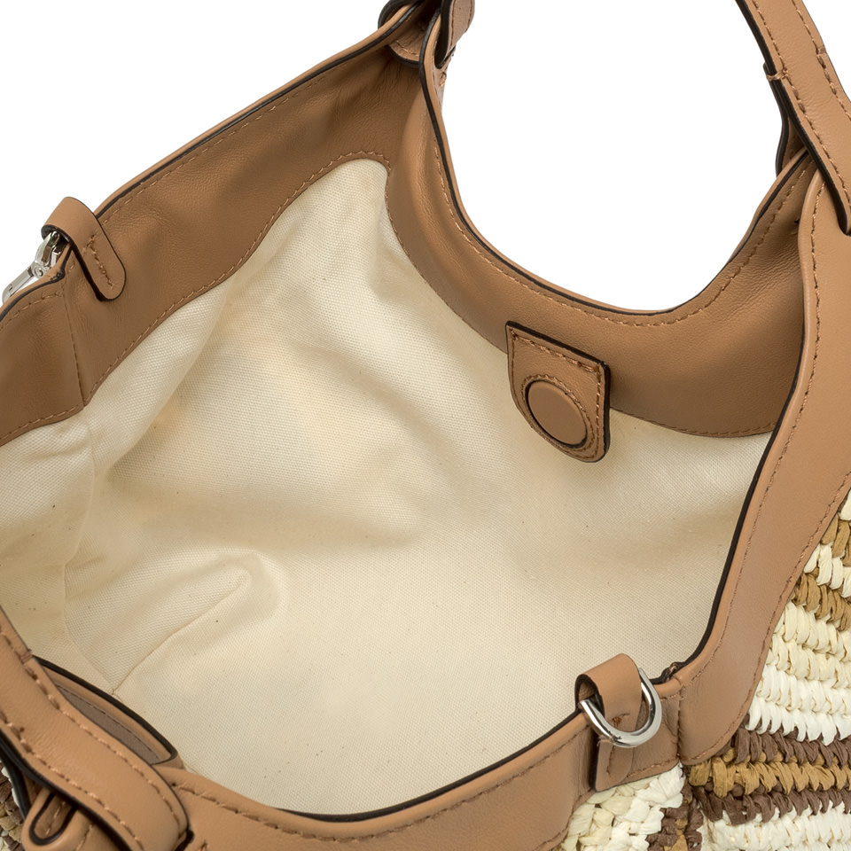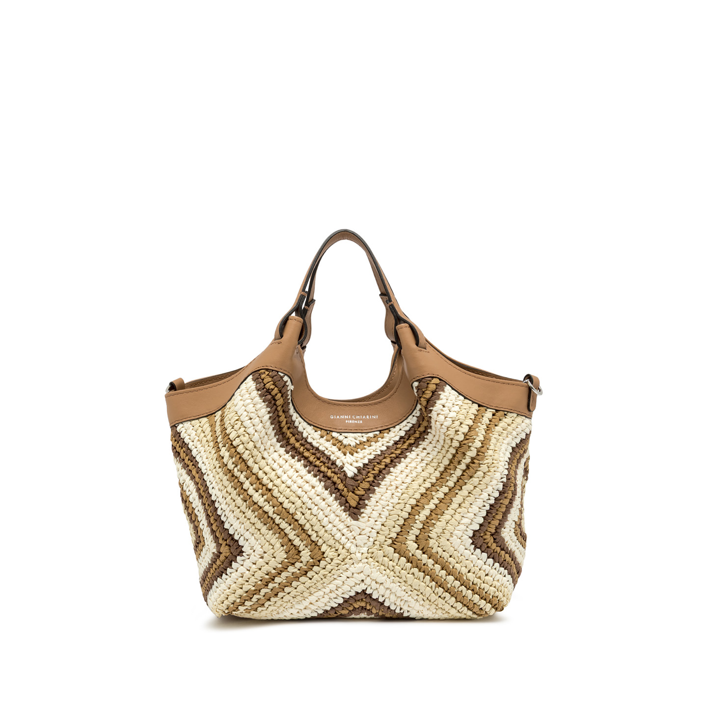 The iconic Dua bag, crafted from woven straw, stands out for its unique texture. It features an unlined single compartment, top profiles in leather and color matching double handles. Practical and essential, it is perfect to stylishly enhance any look. It can be carried as a handbag at the shoulder. Equipped with a practical clutch with zip closure. Size: 24x27x12 cm.