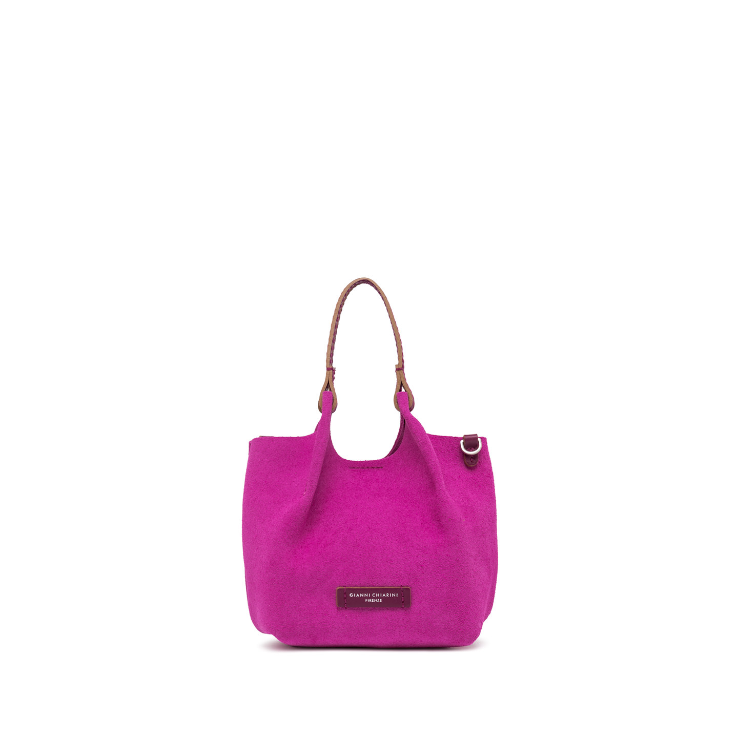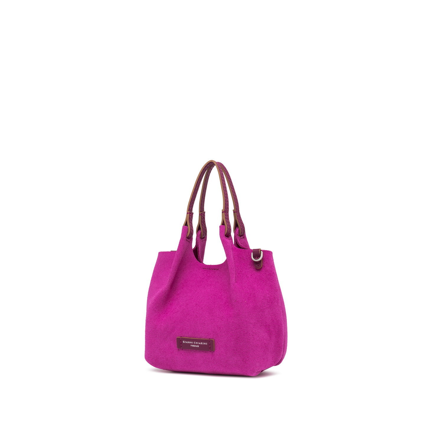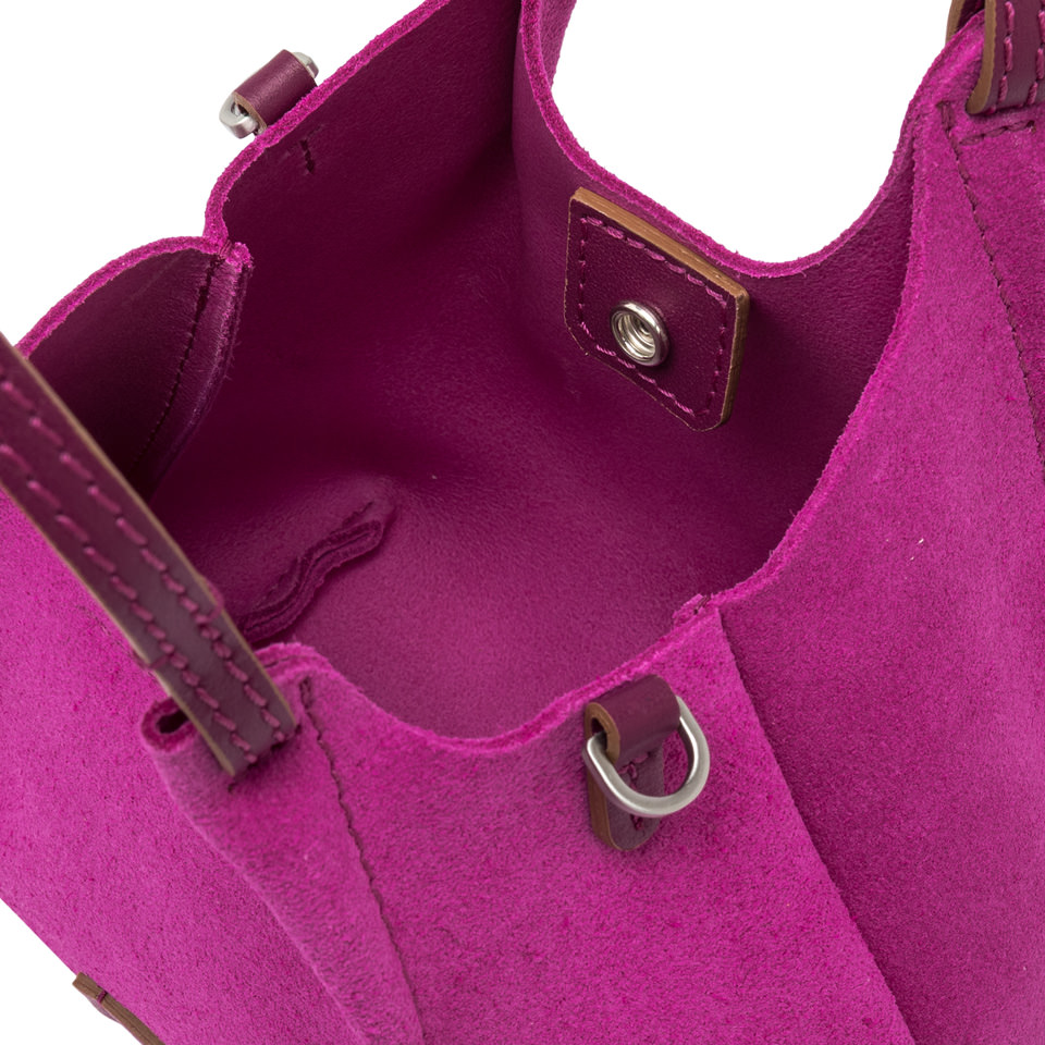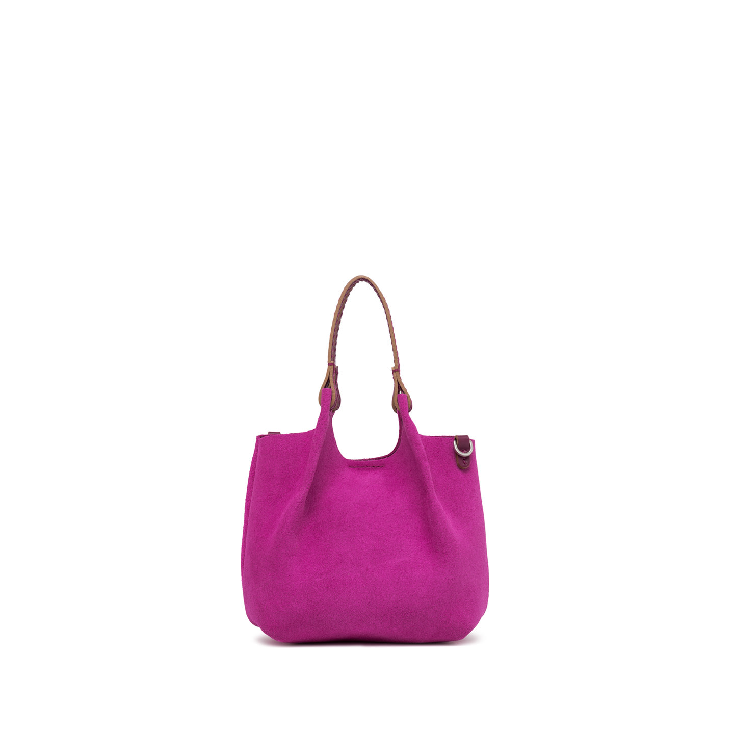 The iconic Dua bag, crafted from suede, stands out for its unique texture. It features an unlined single compartment, top profiles in leather and color matching double handles. Practical and essential, it is perfect to stylishly enhance any look. It can be carried as a handbag at the shoulder. Size: 19x20x8 cm.