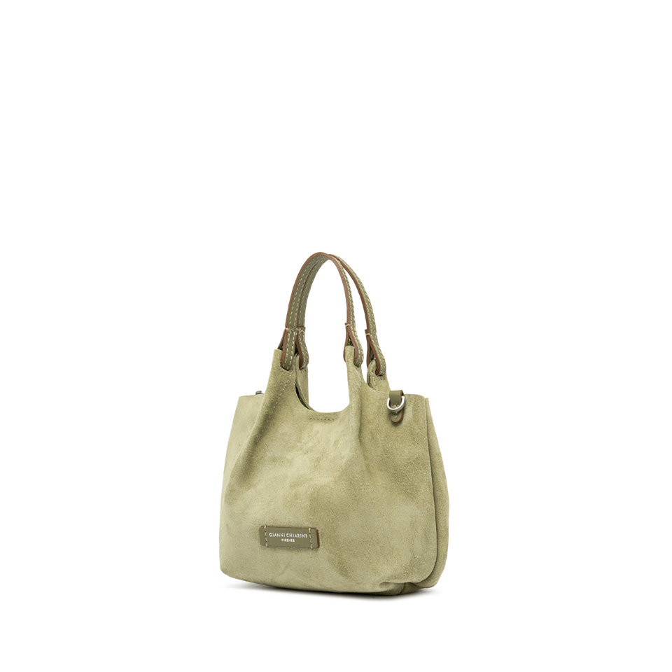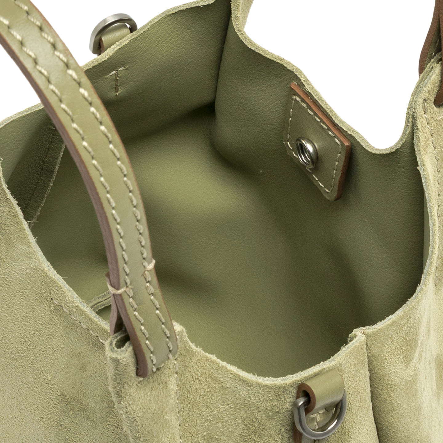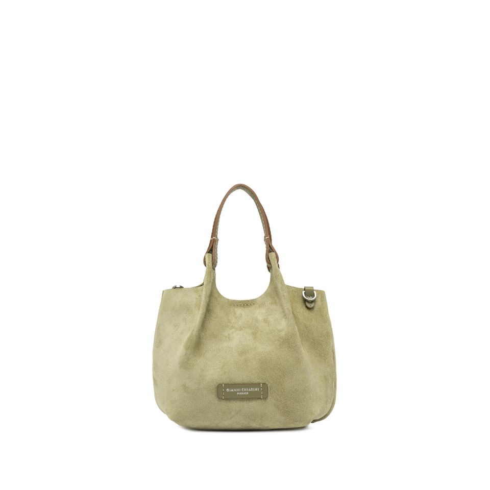 The iconic Dua bag, crafted from suede, stands out for its unique texture. It features an unlined single compartment, top profiles in leather and color matching double handles. Practical and essential, it is perfect to stylishly enhance any look. It can be carried as a handbag at the shoulder. Size: 19x20x8 cm.