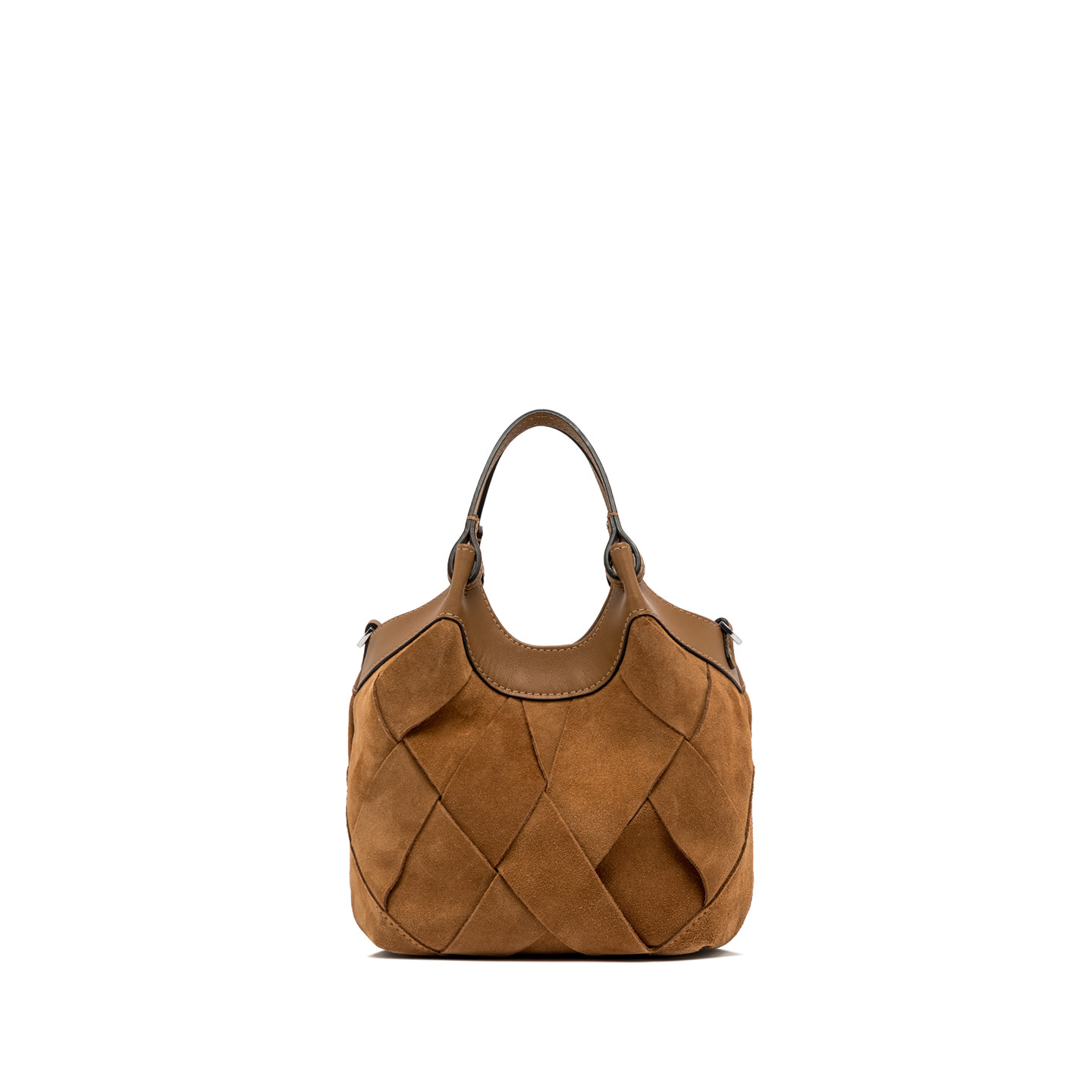 The brand icon DUA stands out for its simple yet contemporary design. Made of chamois with a geometric weave pattern for a signature country-chic style, this bag stands out as a must-have accessory for the season. Leather trim enhances its natural tones, while the textured weave adds both character and refinement. Includes a single compartment and matching double handles with snap-button closure. Carry it by hand or cross-body thanks to the included strap. Size: 19x20x8 cm.