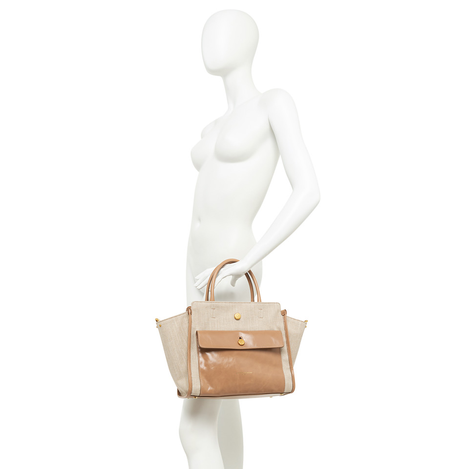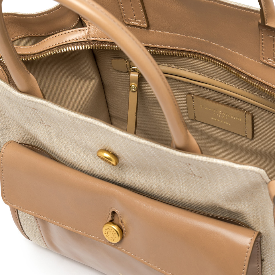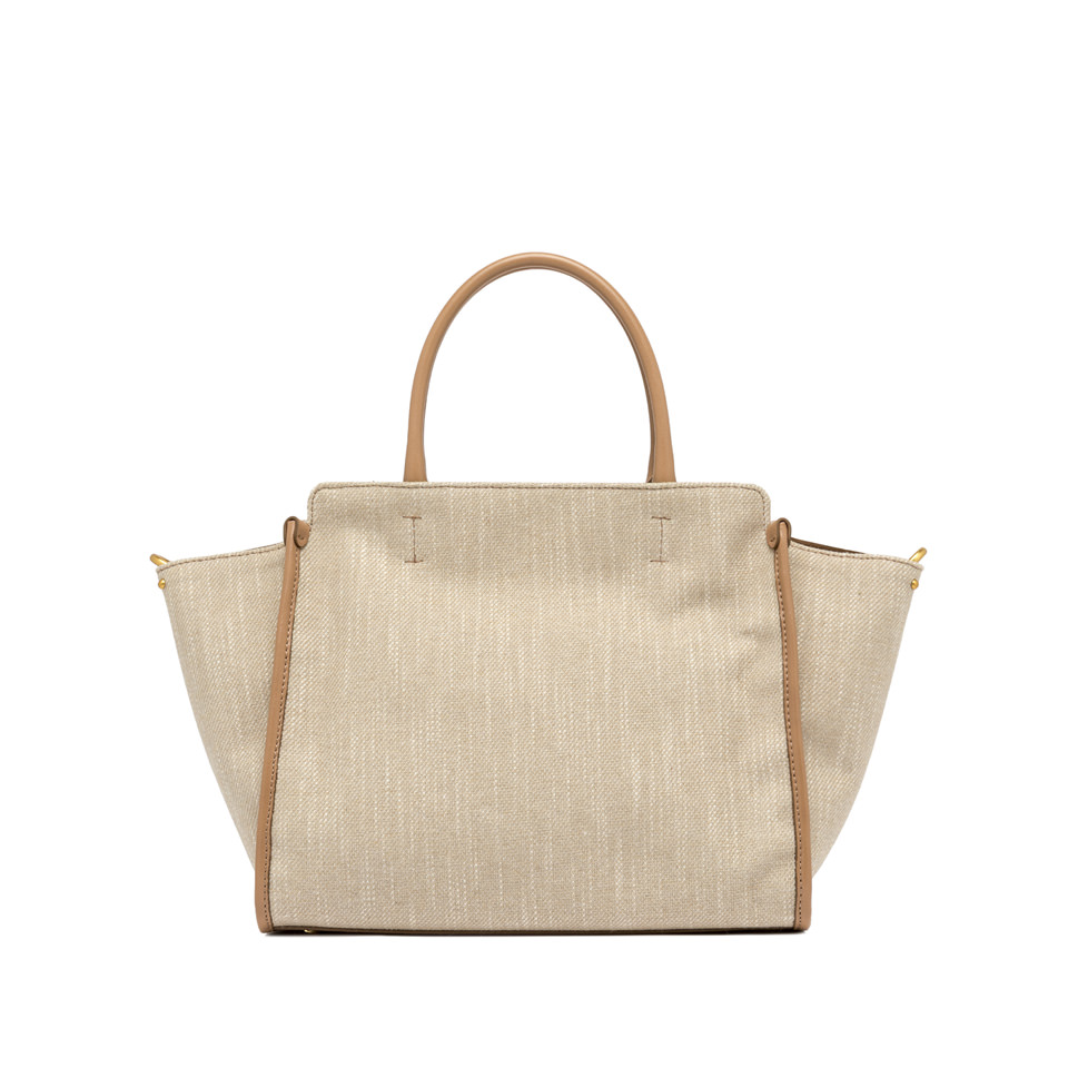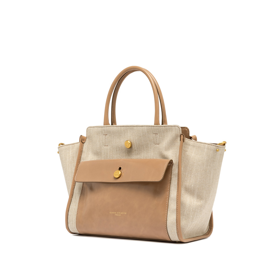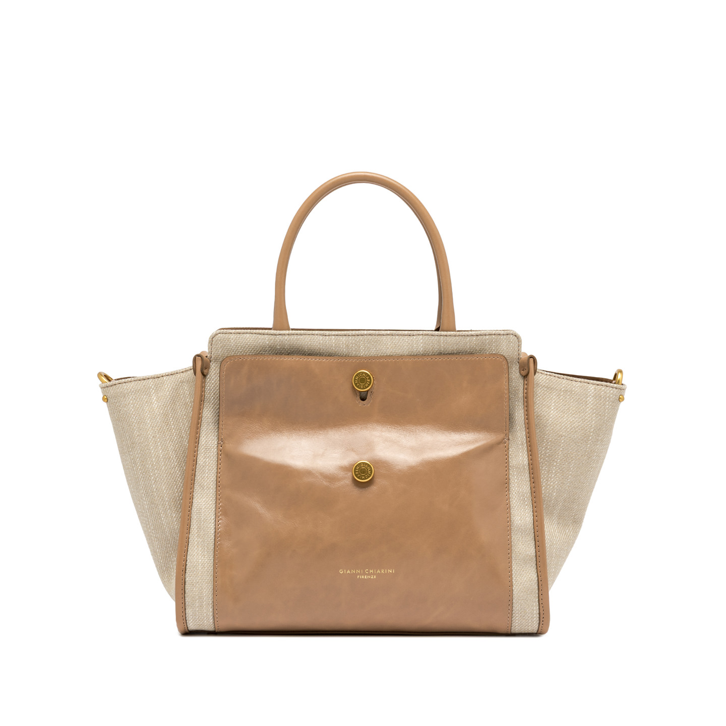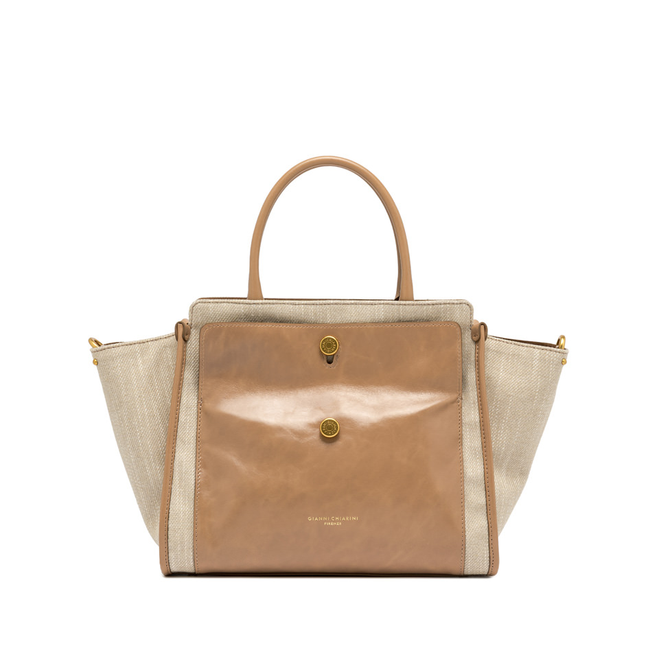 Cher by Gianni Chiarini Firenze is modern and versatile, perfect for bold, on-the-go women thanks to its roomy design and functionality. Made from durable, lightweight denim-effect fabric, enriched with metallic details for added personality. It features two leather handles for hand carry and an adjustable, removable strap for cross-body wear. Size: 29x24x13 cm.