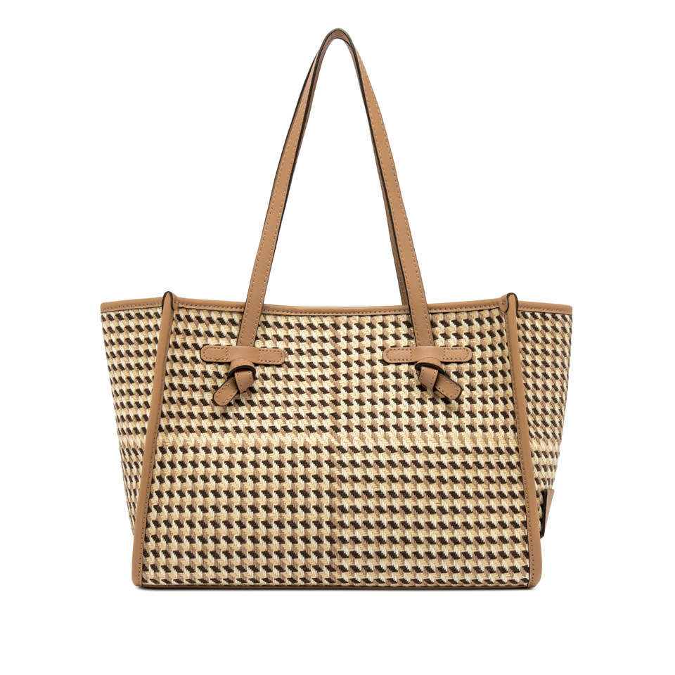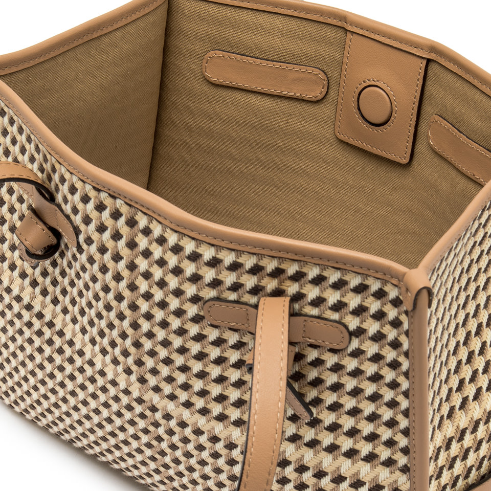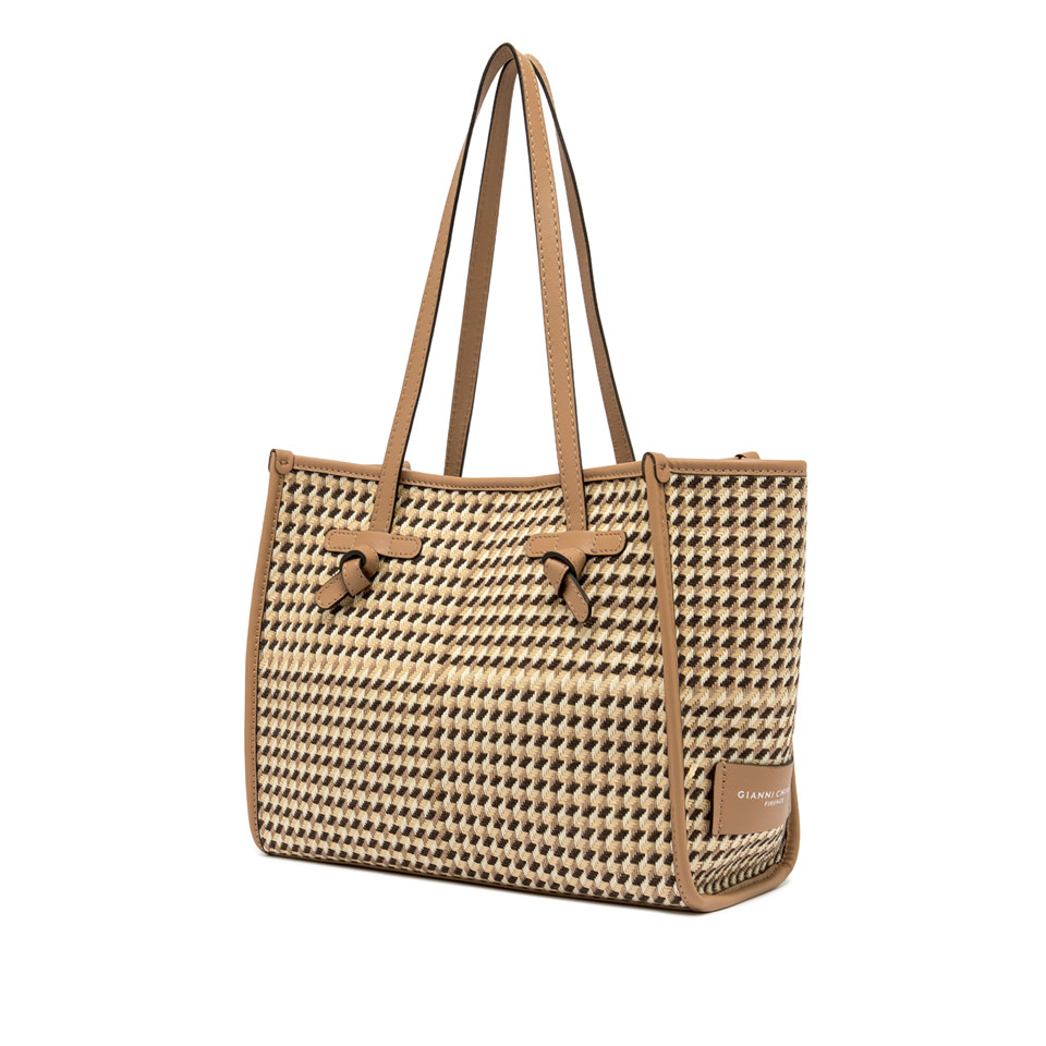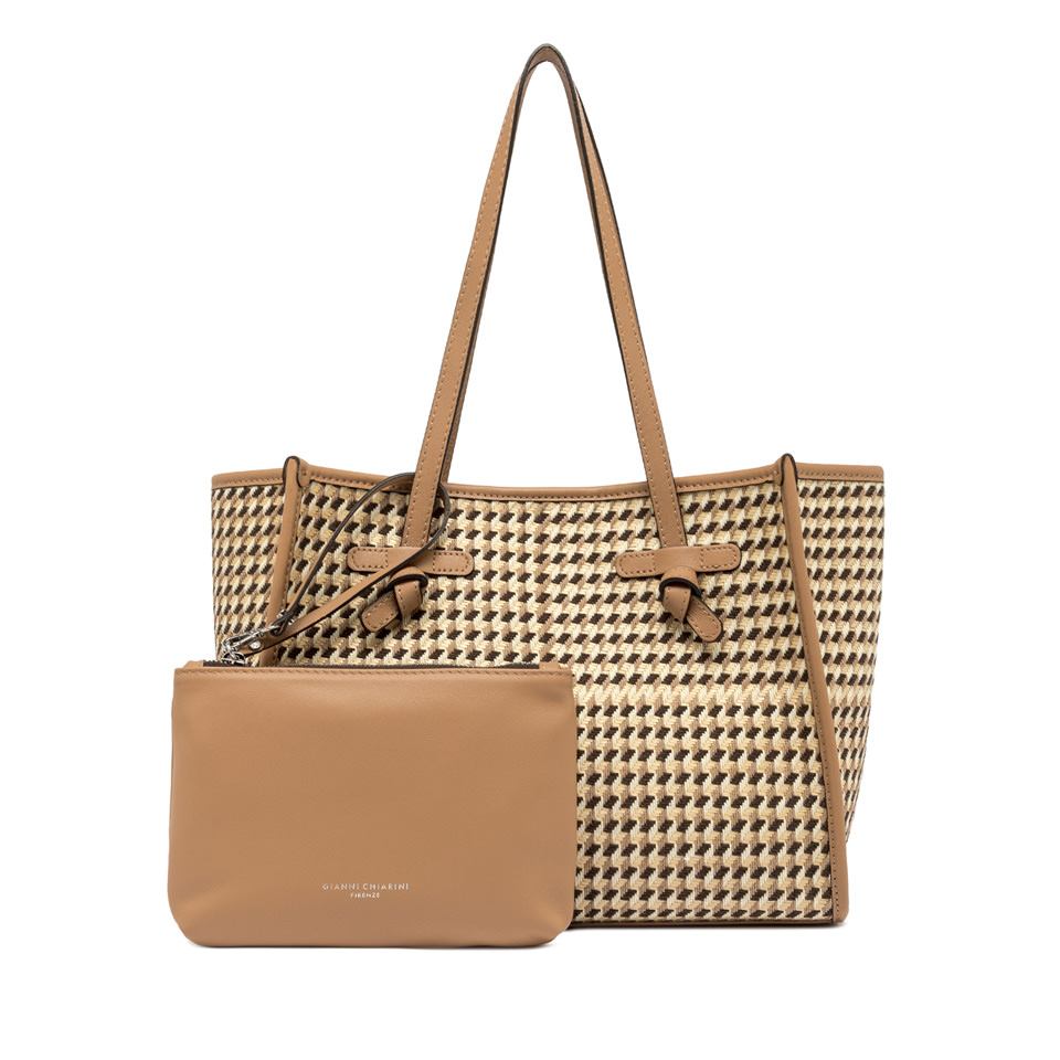 Marcella shopping bag by Gianni Chiarini Firenze reinterprets a classic with a bold, contemporary spirit. It comes in Houndstooth print fabric enriched by leather profiles and color matching handles. Featuring a practical magnetic clasp closure and a matching denim pouch, it’s a versatile accessory that completes everyday looks with a personal touch. Size: 33x25x13 cm.