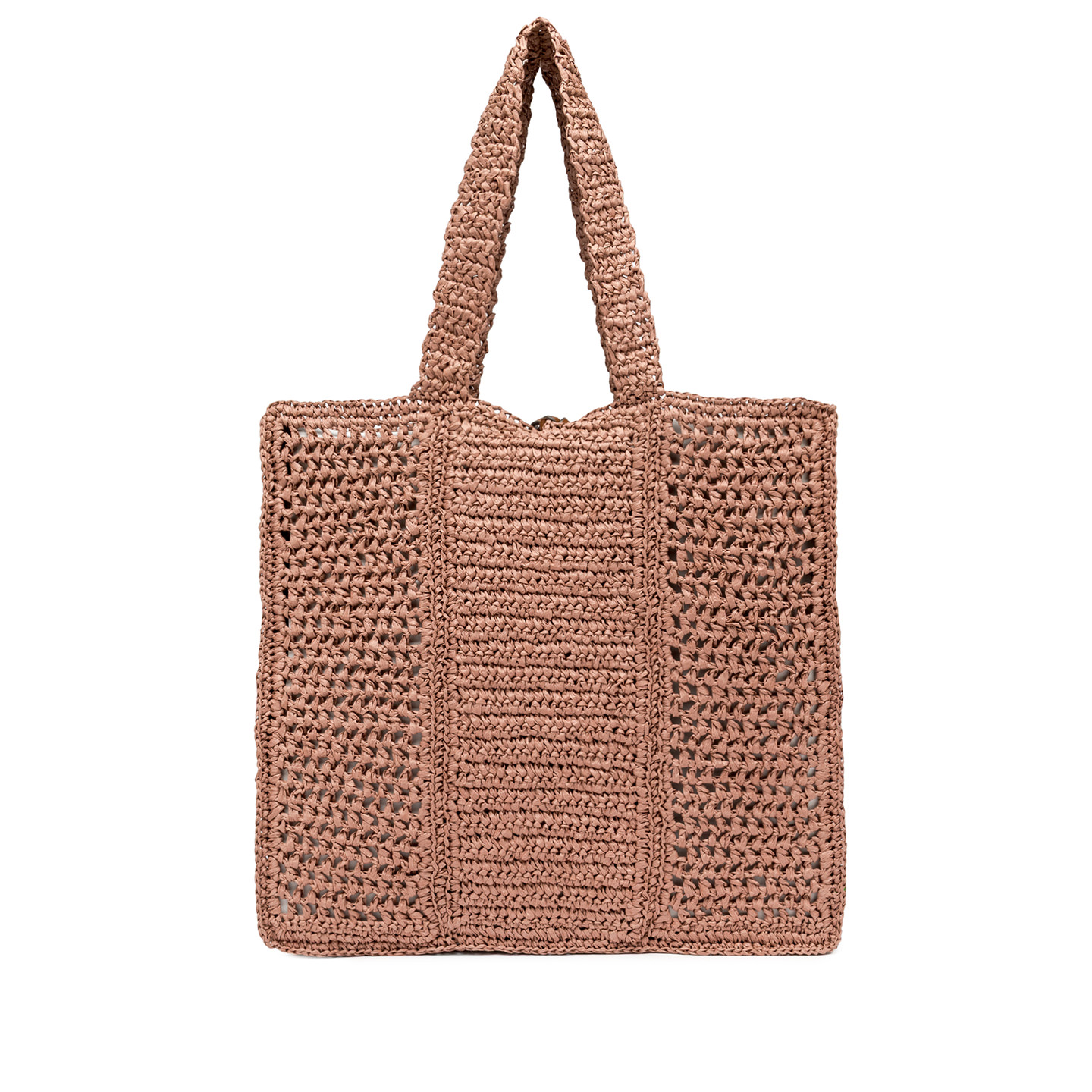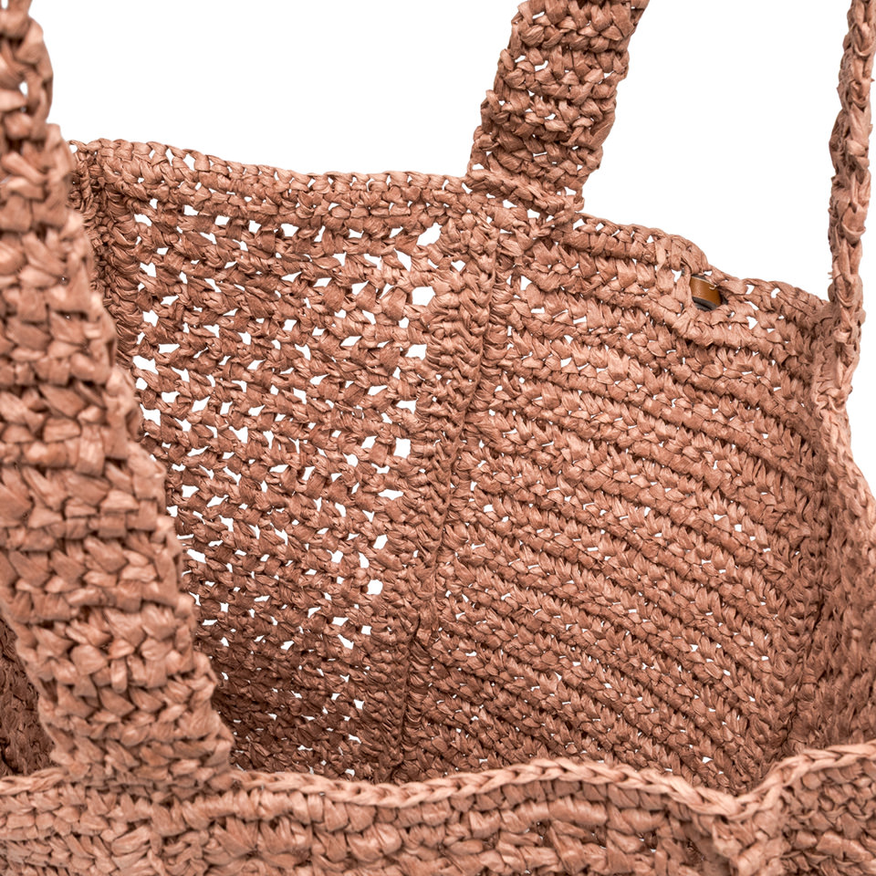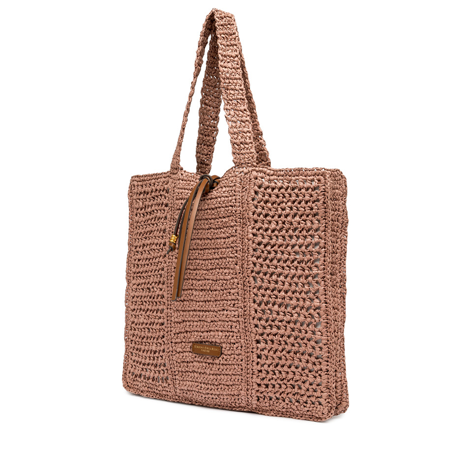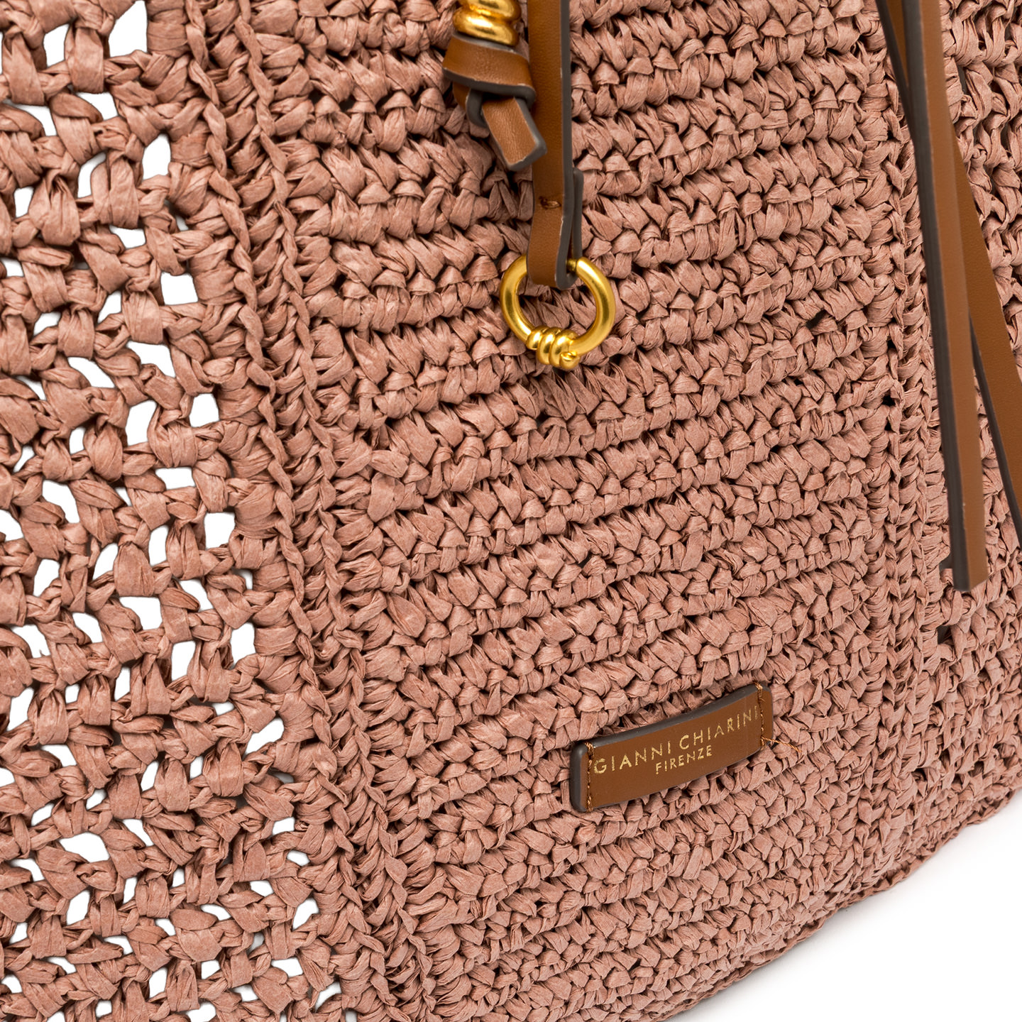 Nefeli is the new shopper bag by Gianni Chiarini Firenze, made of crochet straw, perfect for breezy, stylish summer days. Features a drawstring closure and metal details that add a luminous touch to the design. Size: 33x37x5 cm.