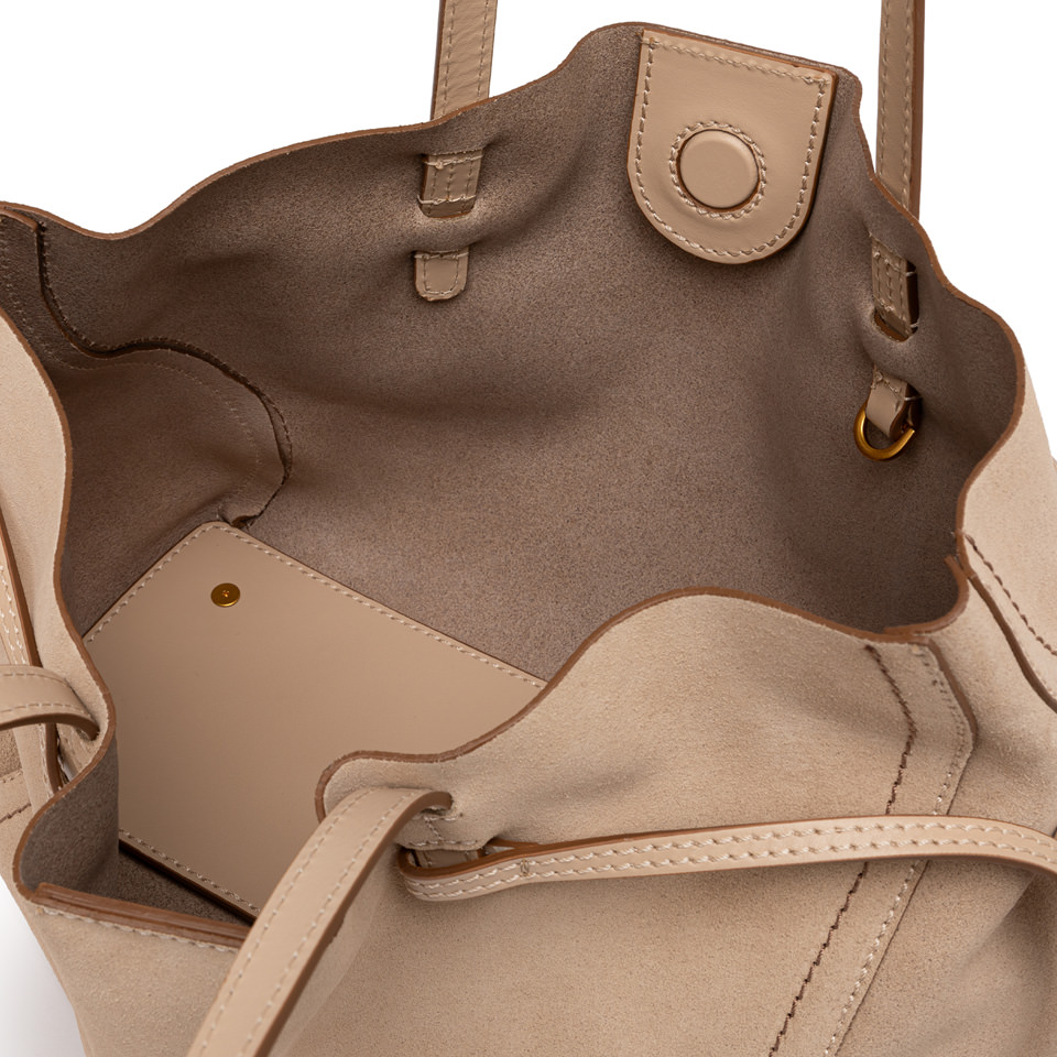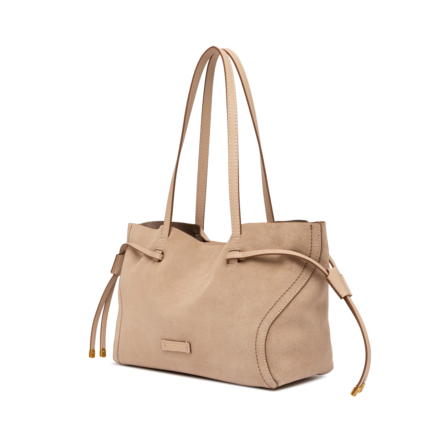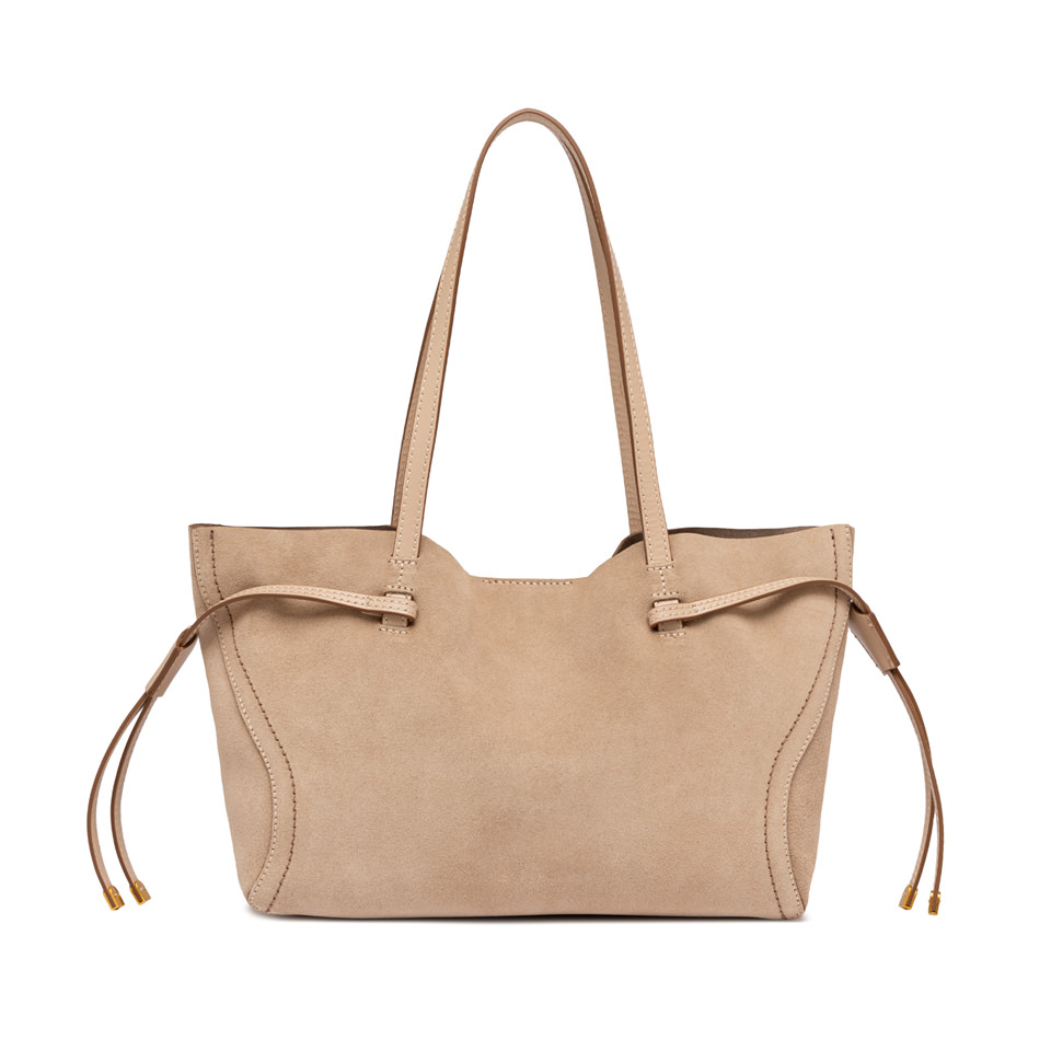 Violette by Gianni Chiarini Firenze is a bag with bold sophistication, crafted from suede. Defined by contrast stitching, decorative ties with metallic tips, and a removable zip pouch, it blends practicality with elegance. Shoulder-ready and versatile, it adds a modern edge to any look. Size: 31x24x14 cm.