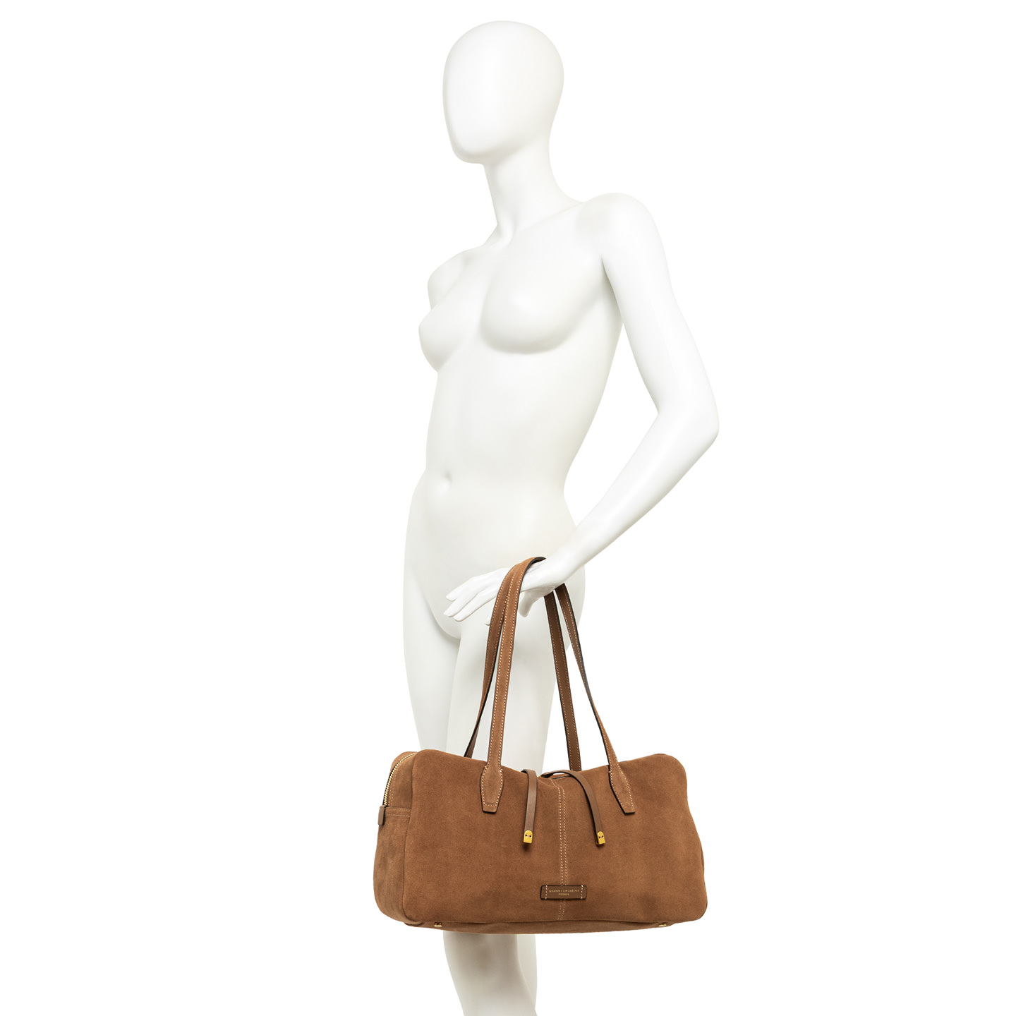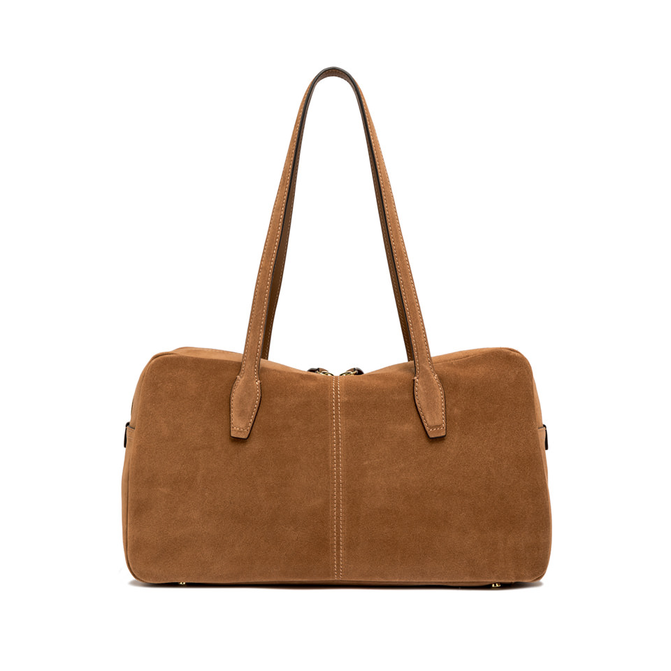Aryna is the bowling bag by Gianni Chiarini Firenze, made of suede. Ideal for a sporty and effortless woman who still values femininity. Equipped with double handles for hand carry, it features a main compartment with double-slider zipper and leather zip pulls with metal details. Logoed rivets complete the design with a distinctive touch. Size: 38x20x14 cm.