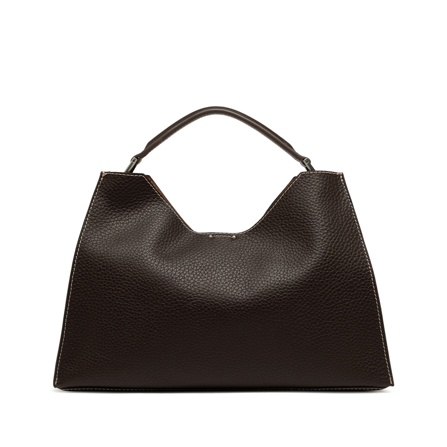 Aurora by Gianni Chiarini Firenze is characterized by a trapezoidal shape. A symbol of contemporary elegance, it is made from double maxi-grain leather and enriched with metal details. Equipped with a practical, adjustable, and removable strap for dual carrying options. Top magnetic clasp closure. Size: 42x30x10 cm.