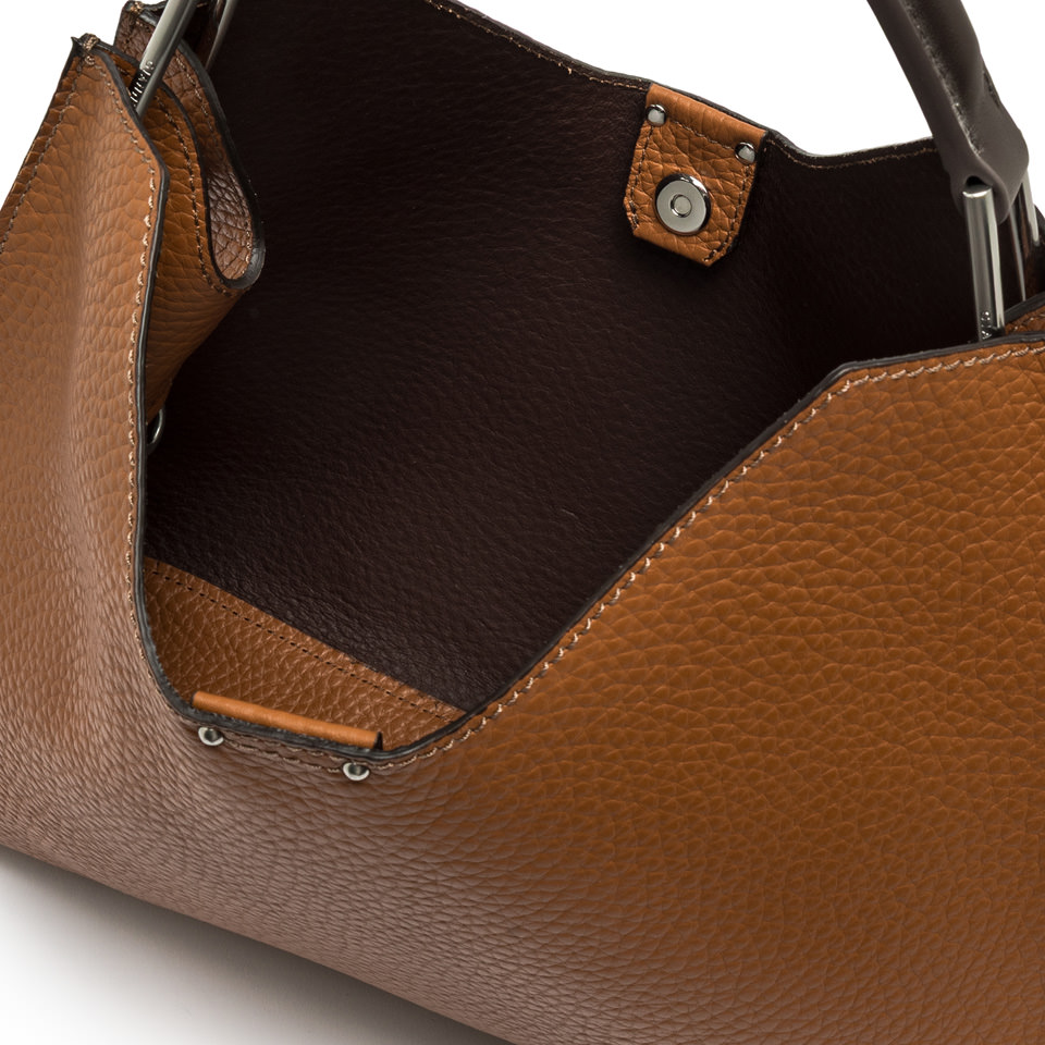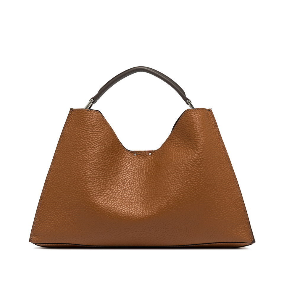 Aurora by Gianni Chiarini Firenze is characterized by a trapezoidal shape. A symbol of contemporary elegance, it is made from double maxi-grain leather and enriched with metal details. Equipped with a practical, adjustable, and removable strap for dual carrying options. Top magnetic clasp closure. Size: 42x30x10 cm.