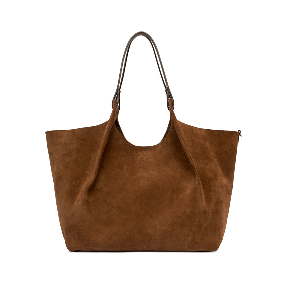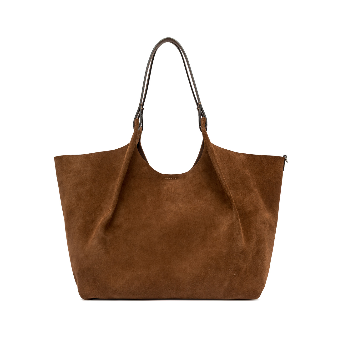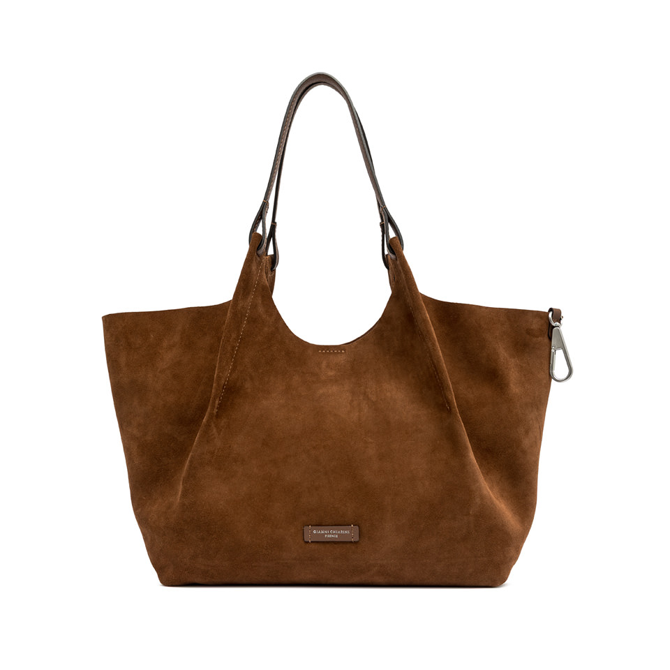 The brand icon DUA stands out for its simple yet contemporary design. Made of soft suede, it features an unlined single compartment, top profiles in hammered leather and color matching double handles. Practical and essential, it is perfect to complete any woman's look. It can be worn over the shoulder. Size: 34x38x16 cm.