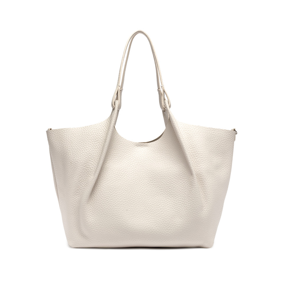 The iconic Dua bag, crafted from double bubble leather, stands out for its unique texture. It features an unlined single compartment, top profiles in hammered leather and color matching double handles. Practical and essential, it is perfect to stylishly enhance any look. It can be carried as a handbag at the shoulder. Size: 34x38x16 cm.