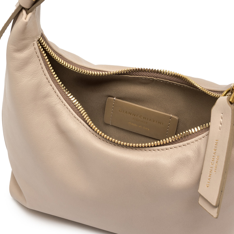Ella is the latest handbag by Gianni Chiarini Firenze, with a modern, sophisticated, and elegant allure, ideal for the glamorous, contemporary woman. Crafted from leather, it features a soft hobo silhouette and a top zip closure. Its distinctive top handle allows for multiple carrying options, blending functionality with refined style. Size: 21x22x7 cm.