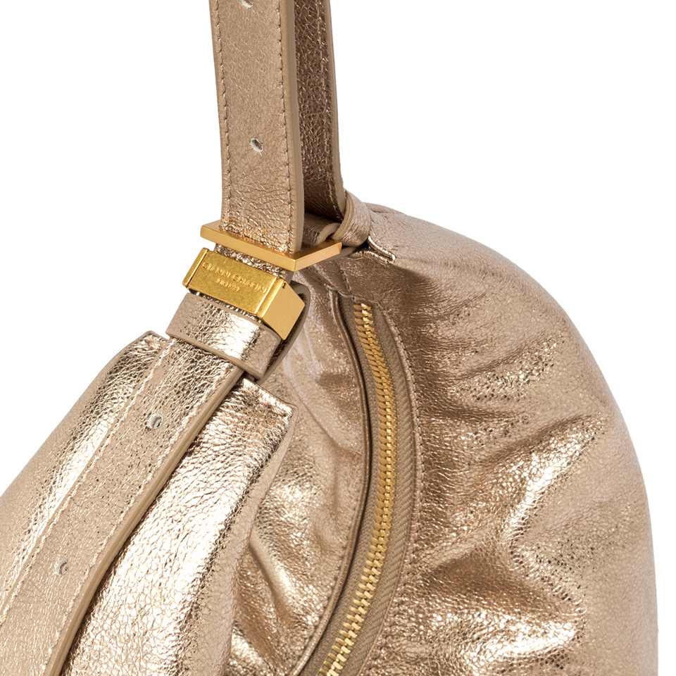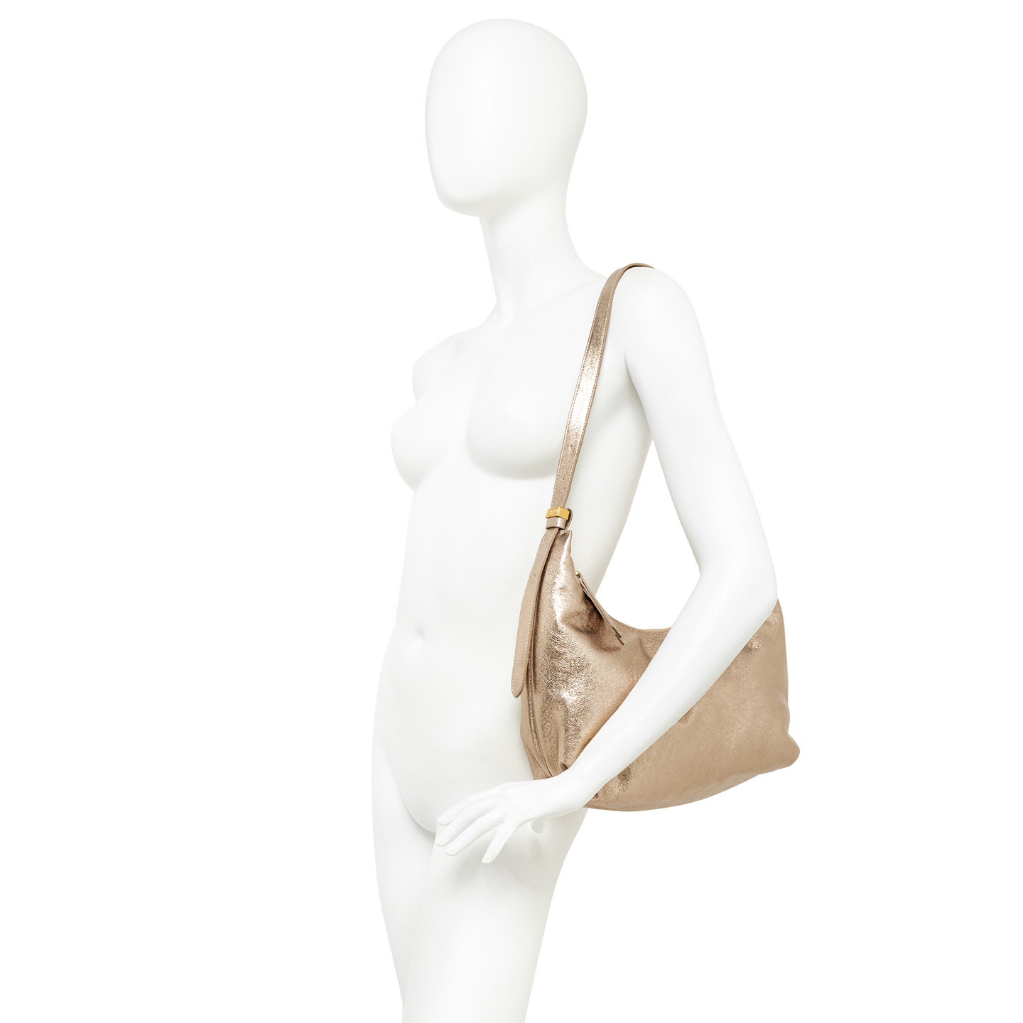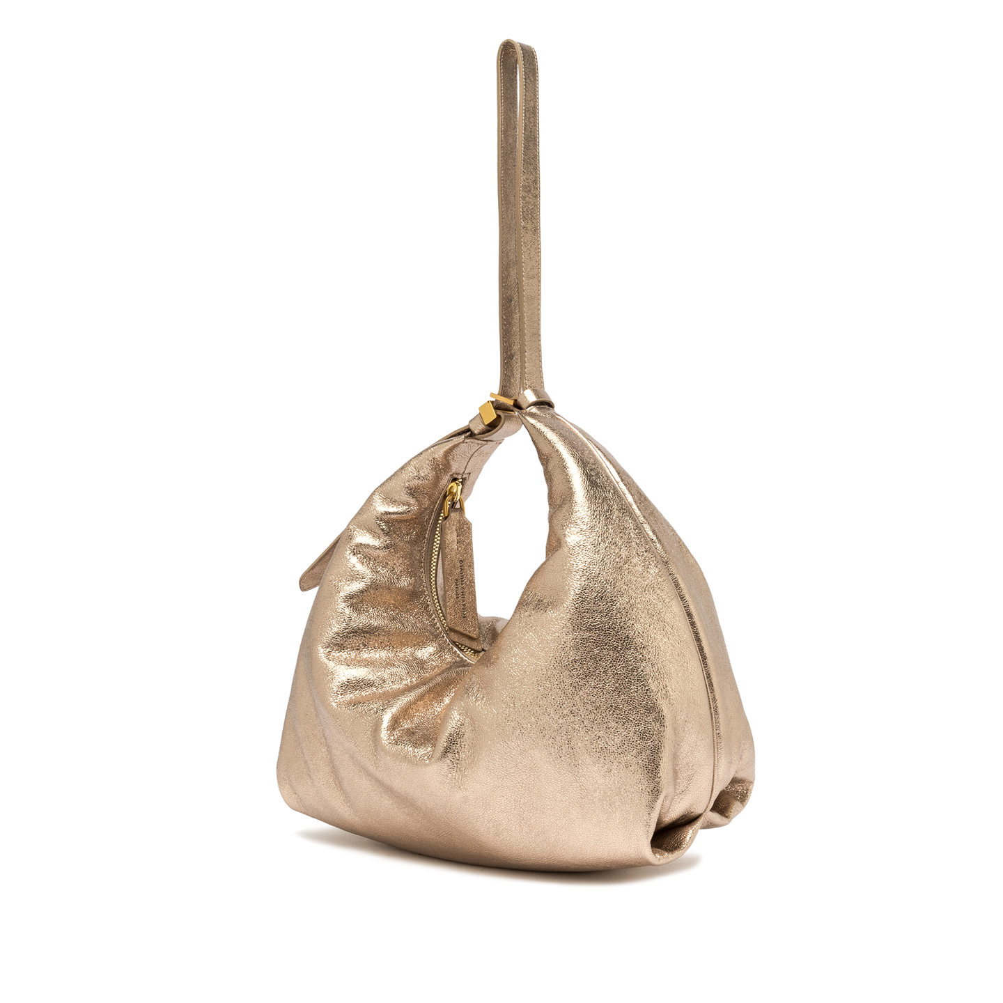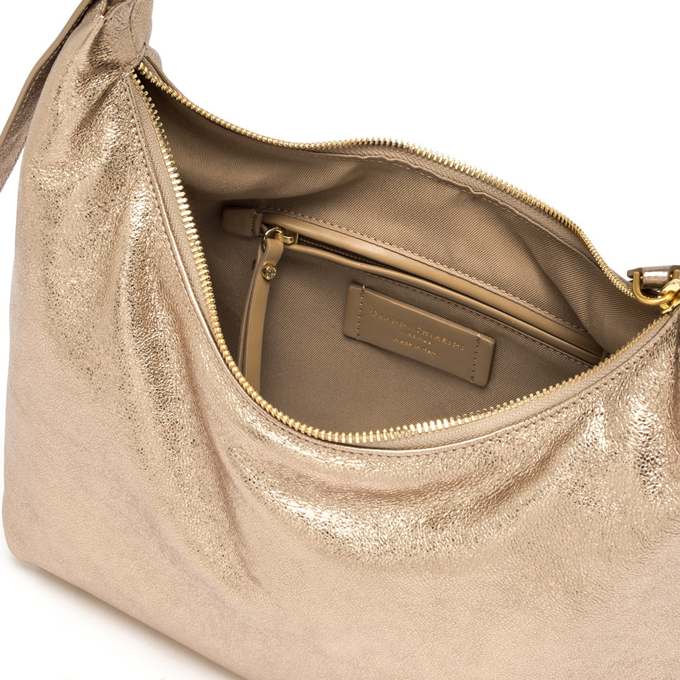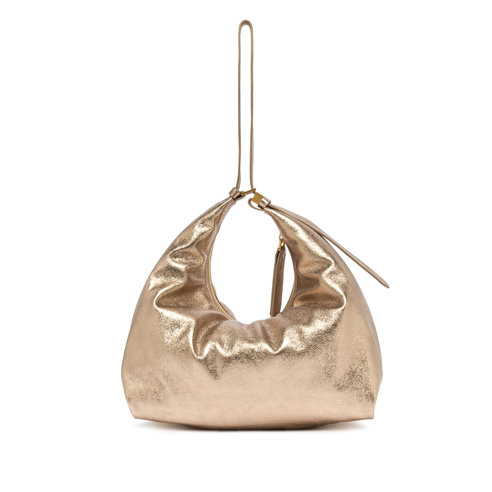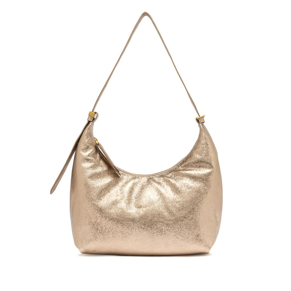 Ella is the latest handbag by Gianni Chiarini Firenze, with a modern, sophisticated, and elegant allure, ideal for the glamorous, contemporary woman. Crafted from suede with a metallic finish, it features a soft hobo silhouette and a top zip closure. Its distinctive top handle allows for multiple carrying options, blending functionality with refined style. Size: 26x25x12 cm.