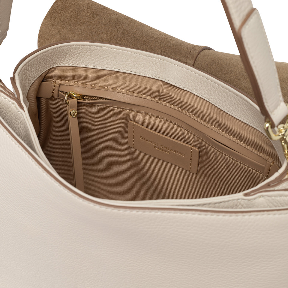 The iconic Helena Round by Gianni Chiarini Firenze, crafted from hammered leather, is distinguished by its structured design with a contemporary appeal. Versatile and functional, it features a strap for dual carrying options and offers impeccable organization with a double internal compartment and a hidden back pocket. Size: 33x24x9 cm.
