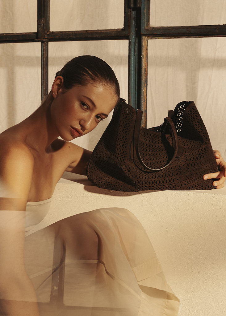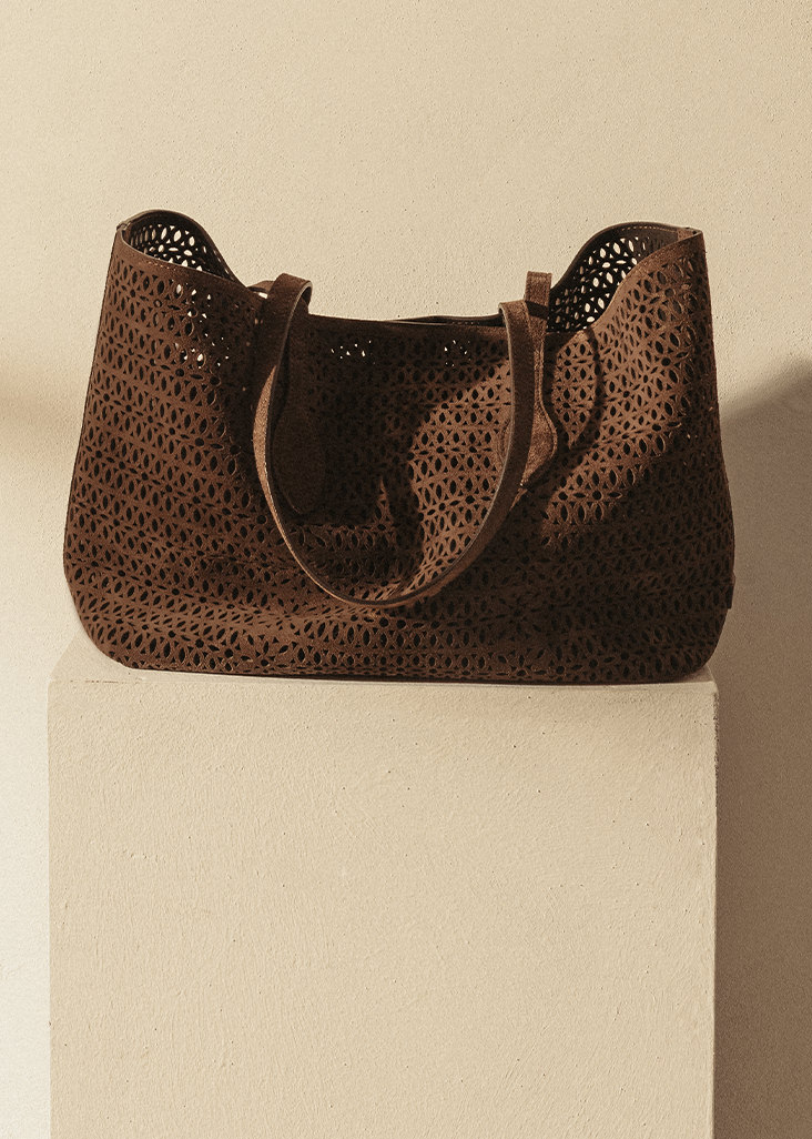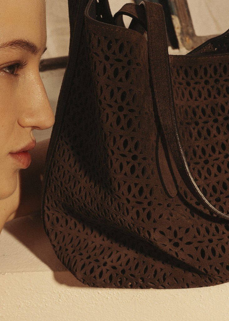 MASHUP, a tote with a modern and sophisticated character. The perforated suede lets light filter through, creating a delicate interplay of transparencies and reflections that enhance its unique style.