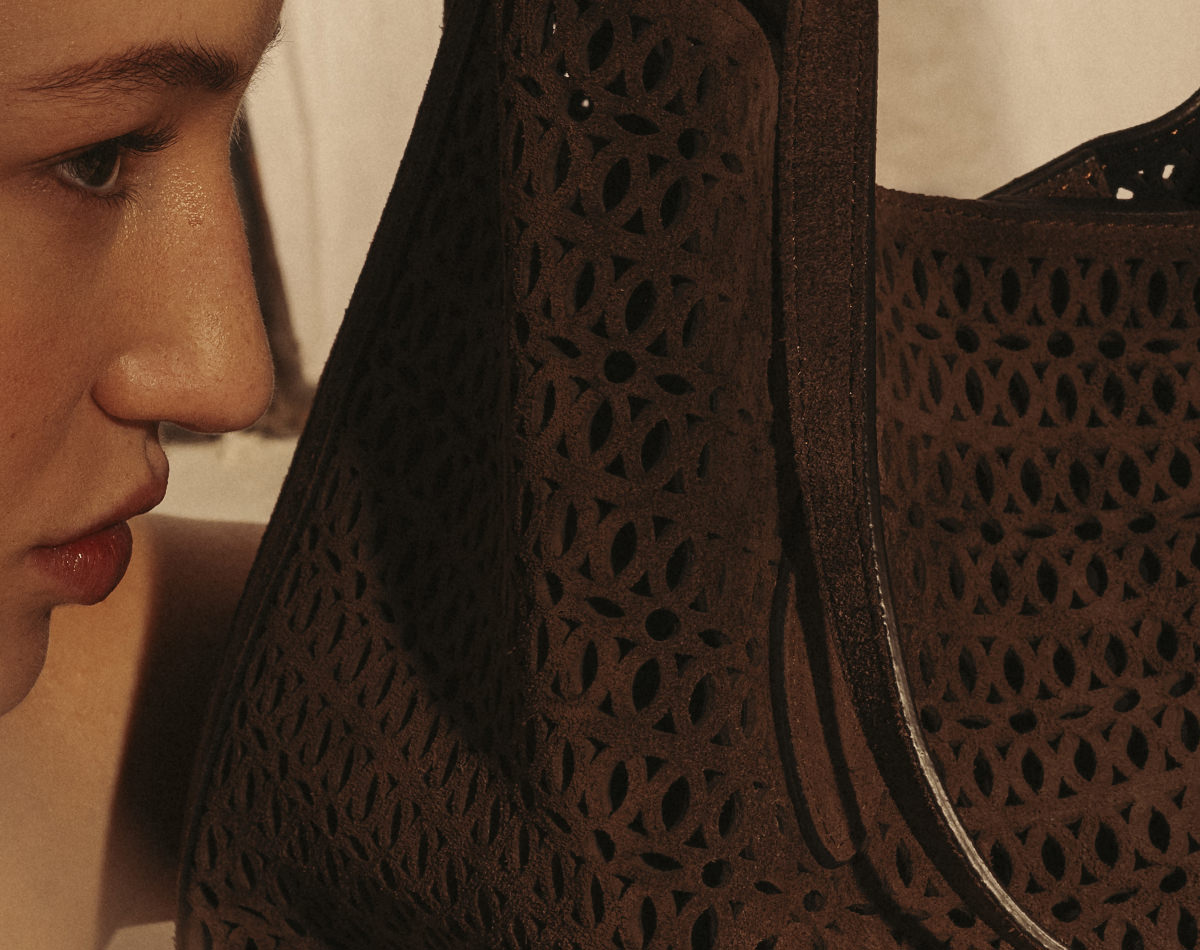 MASHUP, a tote with a modern and sophisticated character. The perforated suede lets light filter through, creating a delicate interplay of transparencies and reflections that enhance its unique style. An accessory that combines contemporary appeal and elegance, perfect for those who want to stand out with class.