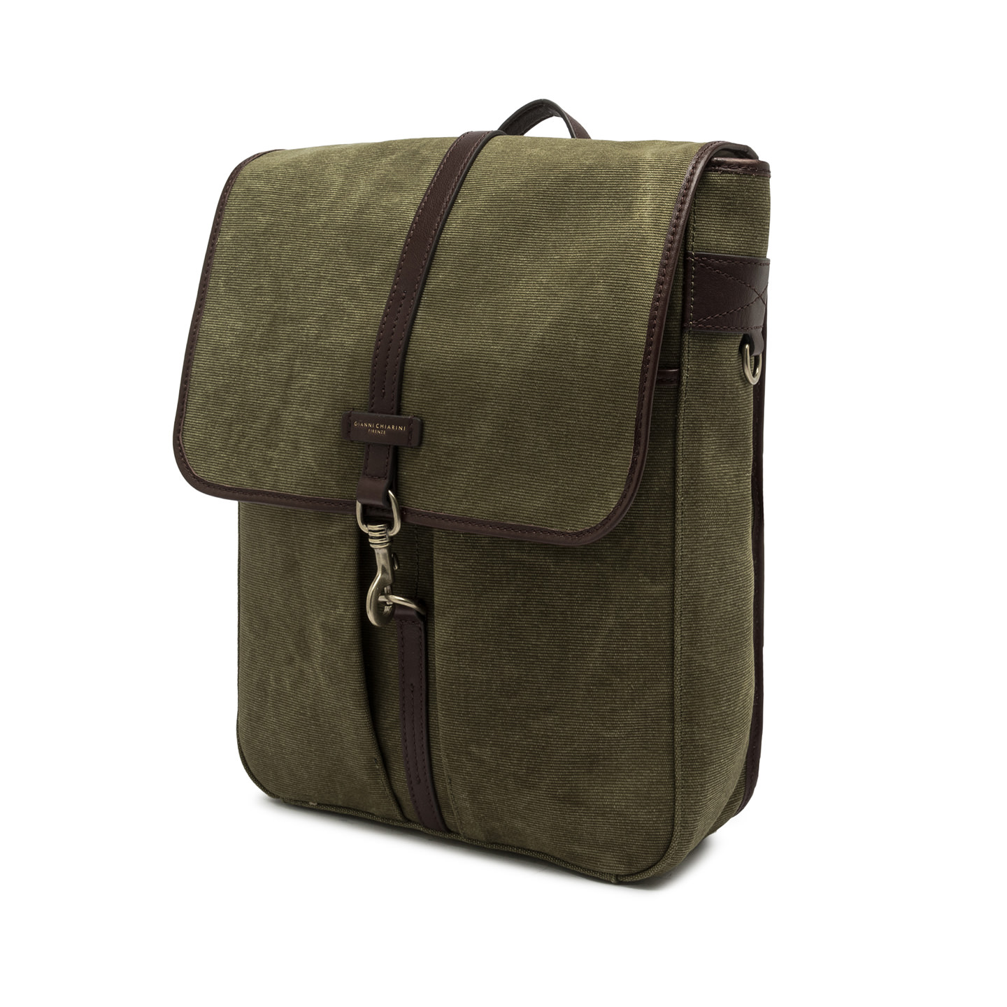 Sporty and refined, Berlino backpack by Gianni Chiarini Firenze is made from tie-dye canvas with leather trimming. Equipped with a practical flap and snap hook closure, it's the ideal accessory for a trendy look that doesn't compromise on functionality and practicality. The matching leather handles and shoulder straps complete the elegant and practical design. Size: 443x32.5x10 cm.