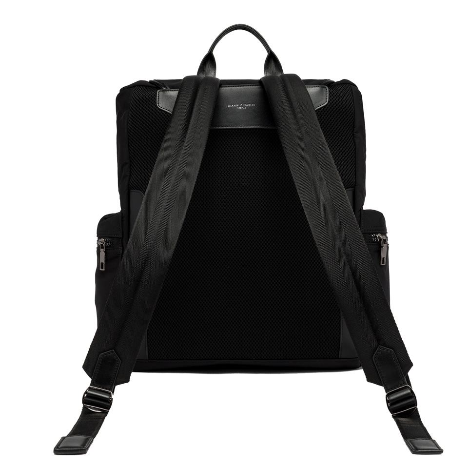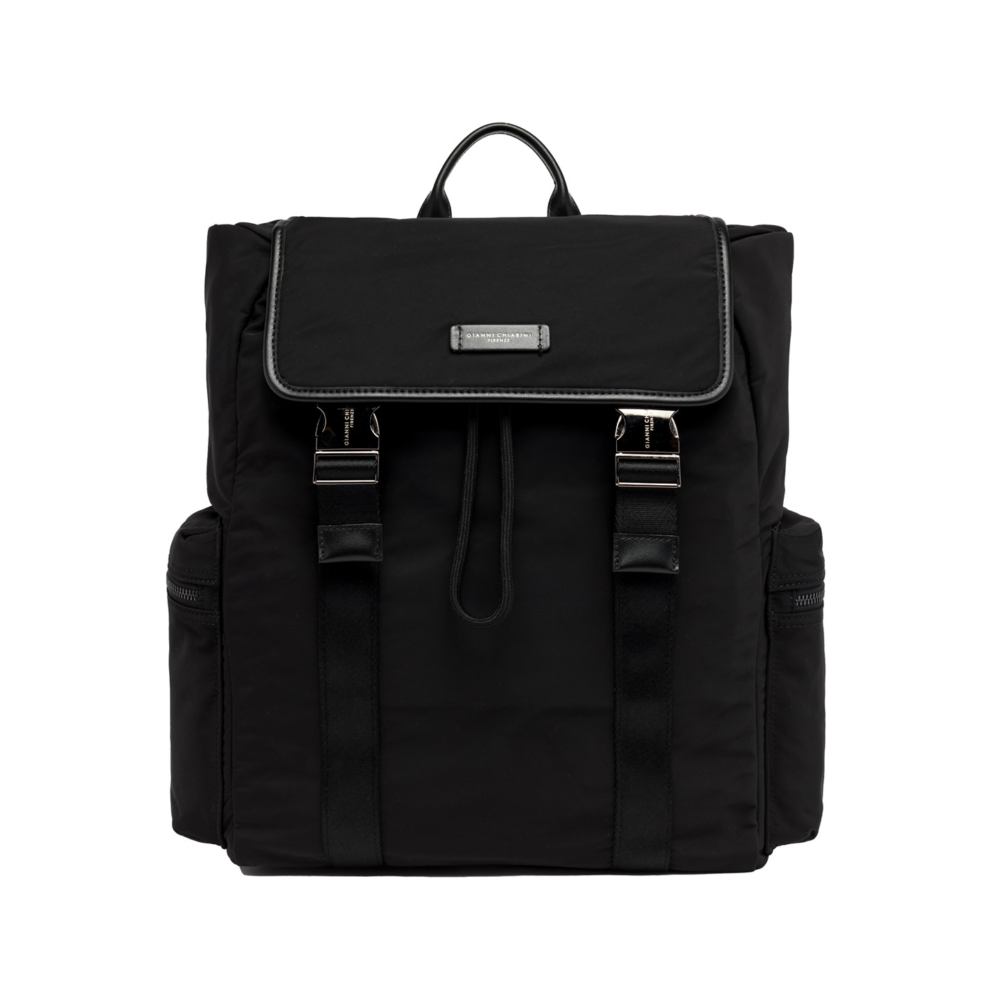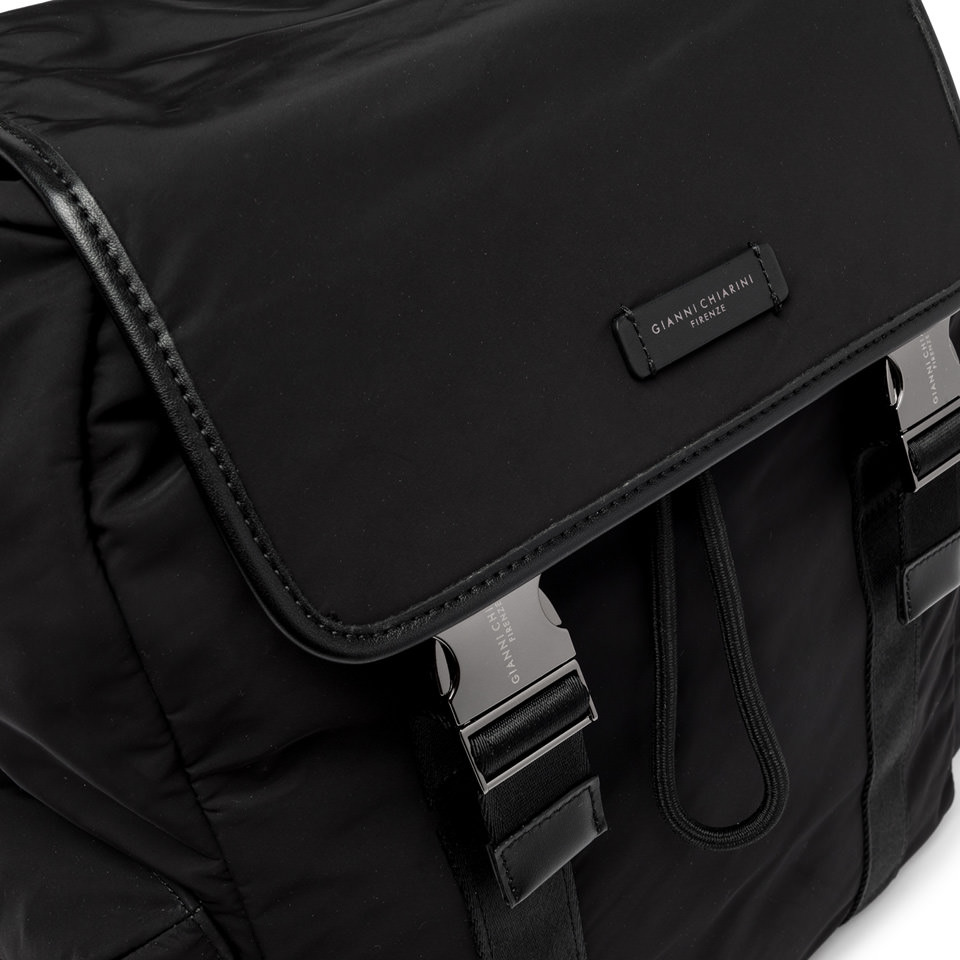 Oslo backpack by Gianni Chiarini Firenze in nylon with leather trimming features clean lines and a minimal design. Equipped with a main compartment with a drawstring and double metal snap hooks, it also offers two convenient side zip pockets. The matching fabric handles and shoulder straps make it a functional and stylish accessory. Size: 44x38x17 cm.