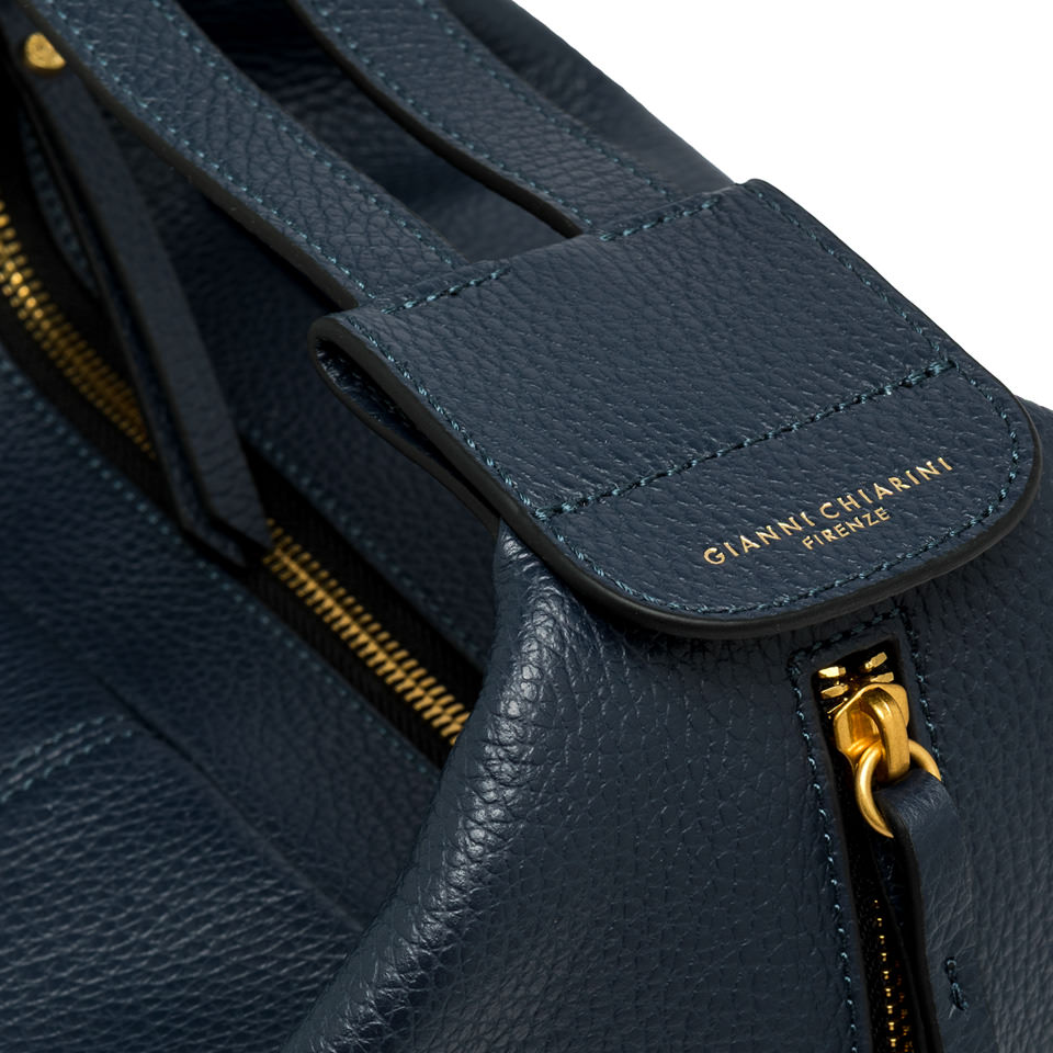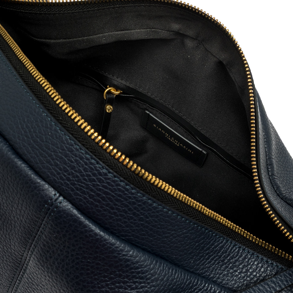 Guia is the new line by Gianni Chiarini Firenze, practical and essential, characterized by soft lines. Ideal for adding a sporty touch to everyday casual looks. Crafted in hammered leather and embellished with metallic elements that add a touch of brightness, it features a spacious compartment, two zip openings, and two adjustable shoulder straps. Size: 24x27x15 cm.