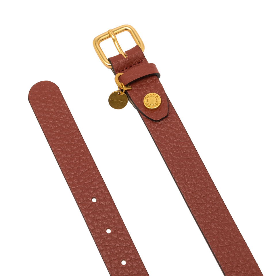 Flat belt with a simple, minimalist design, perfect for completing both casual and elegant looks. Made from maxi-grain leather, it stands out with a logoed buckle adorned with a small logoed pendant.