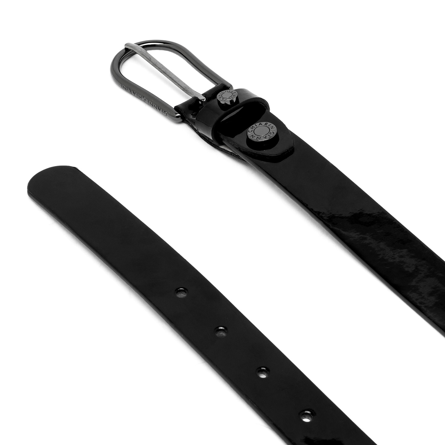 Belt with simple and minimal lines, ideal accessory to adapt to casual or elegant looks. Made of smooth patent leather with a shiny effect, this belt features a metal buckle with logo