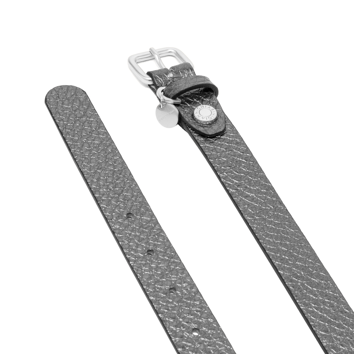Flat belt with a simple, minimalist design, perfect for completing both casual and elegant looks. Made from maxi-grain leather, it stands out with a logoed buckle adorned with a small logoed pendant.