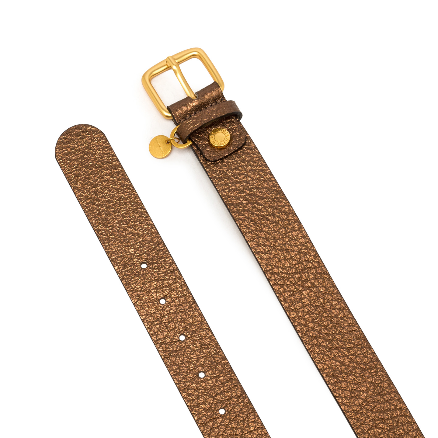 Flat belt with refined, minimalist lines, ideal for completing both casual and elegant outfits. Made from maxi-grain leather, it is enriched with a logoed buckle adorned with a charming logoed pendant.