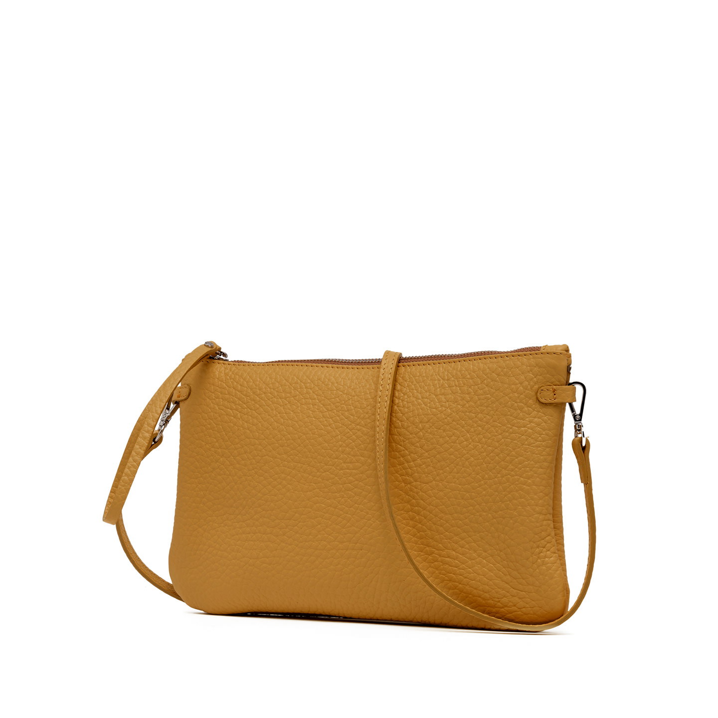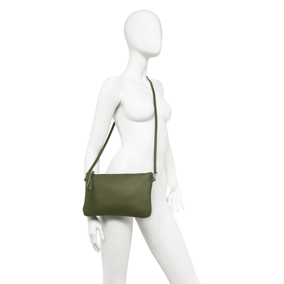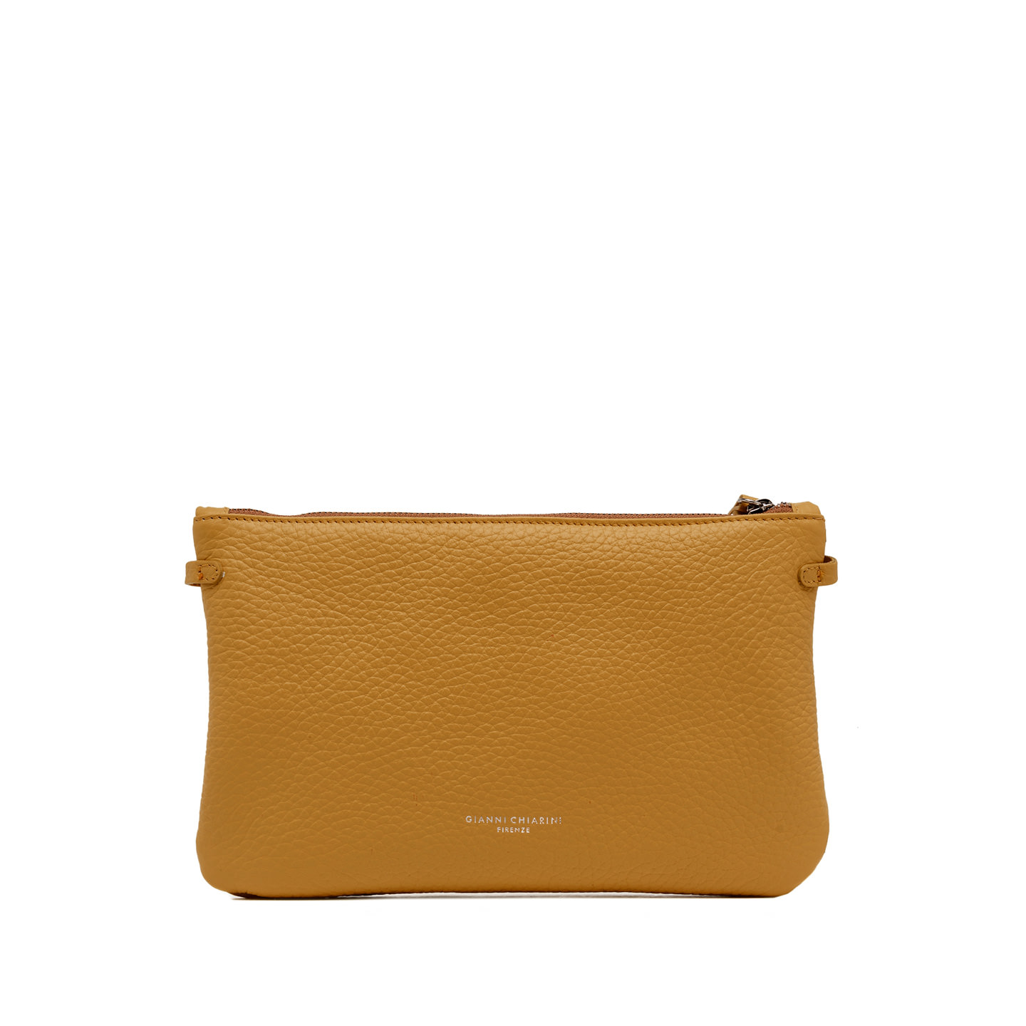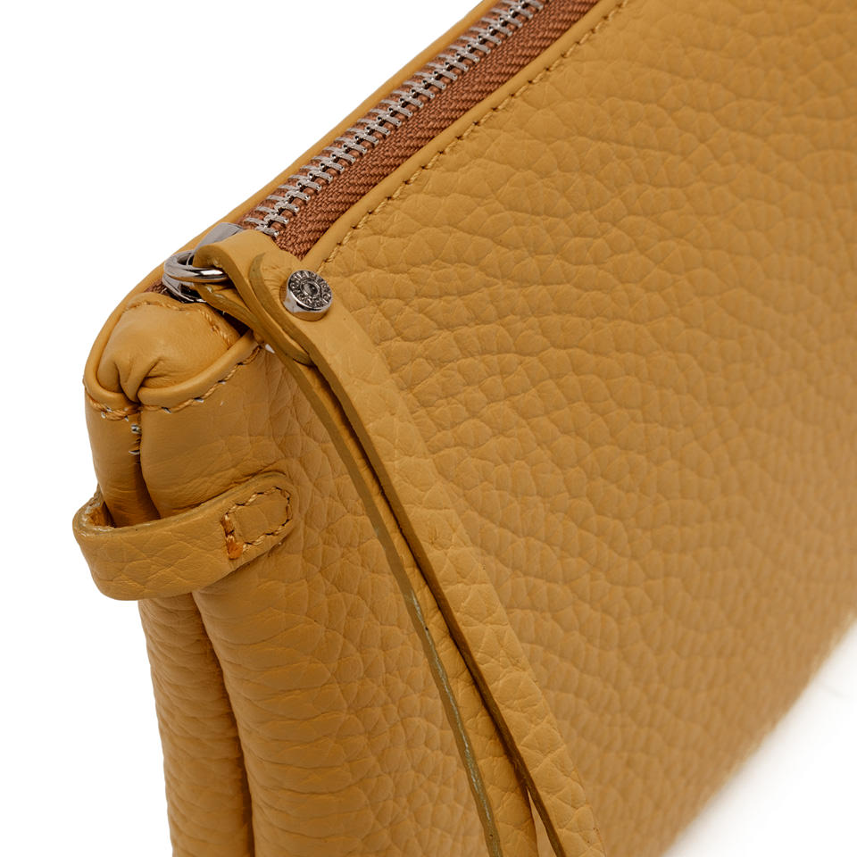 Wearable as a hand bag or at the wrist, Hermy Gianni Chiarini Firenze clutch comes in maxi-grain double leather. Young and playful, enriched with a contrast zip and a thin detachable cross-body strap. Perfect with casual outfits but also perfect to beautify a total black look on an elegant night out. Size: 28x18x2 cm.
