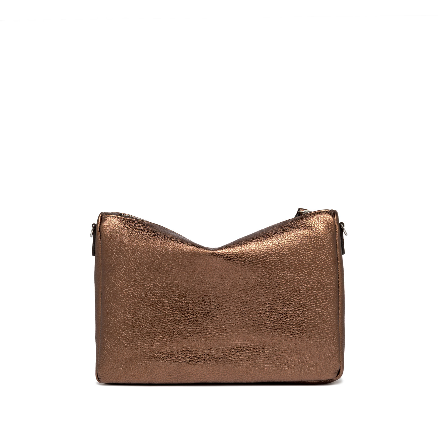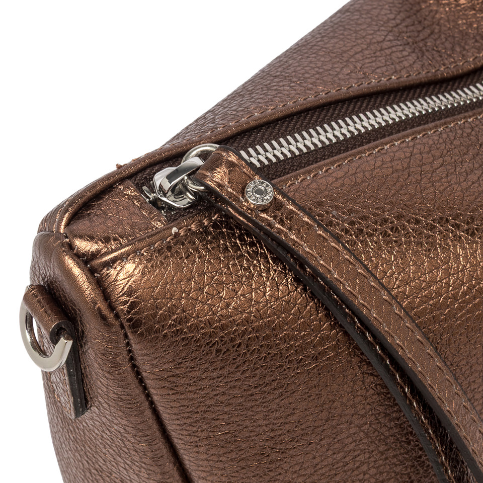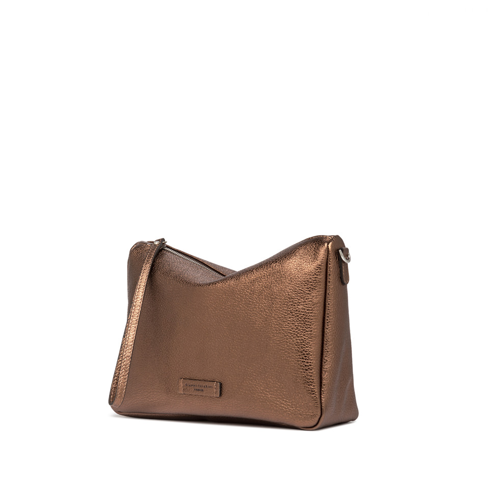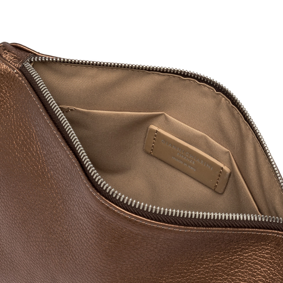 Nora Pouch by Gianni Chiarini Firenze is made of laminated hammered leather. It features a leather strap to wear it at the wrist, in addition to an adjustable and removable shoulder strap in leather. Zipper closure. Size: 28x21x9 cm.