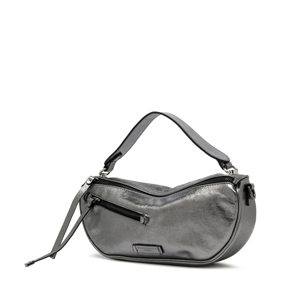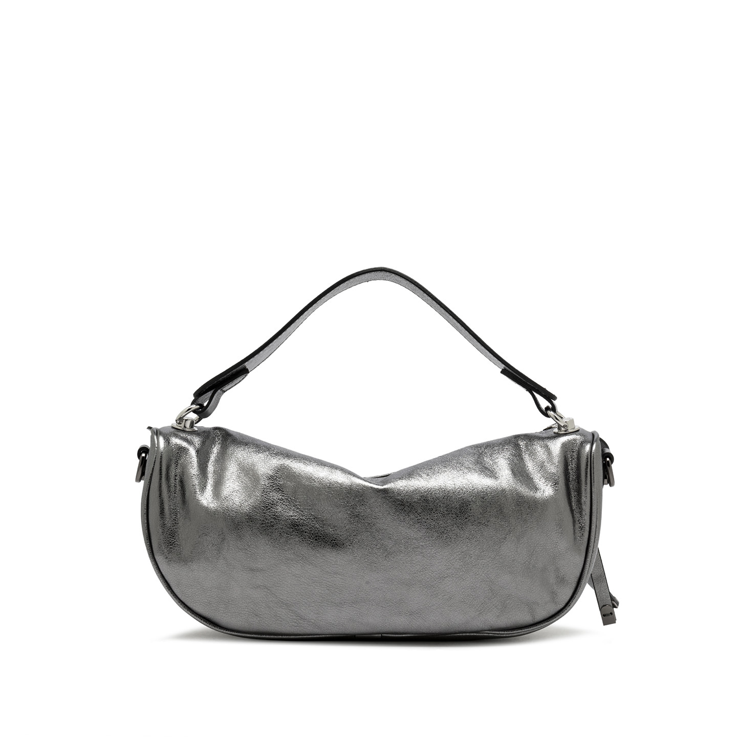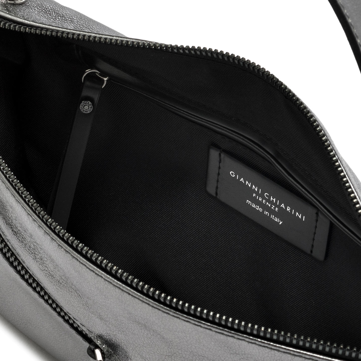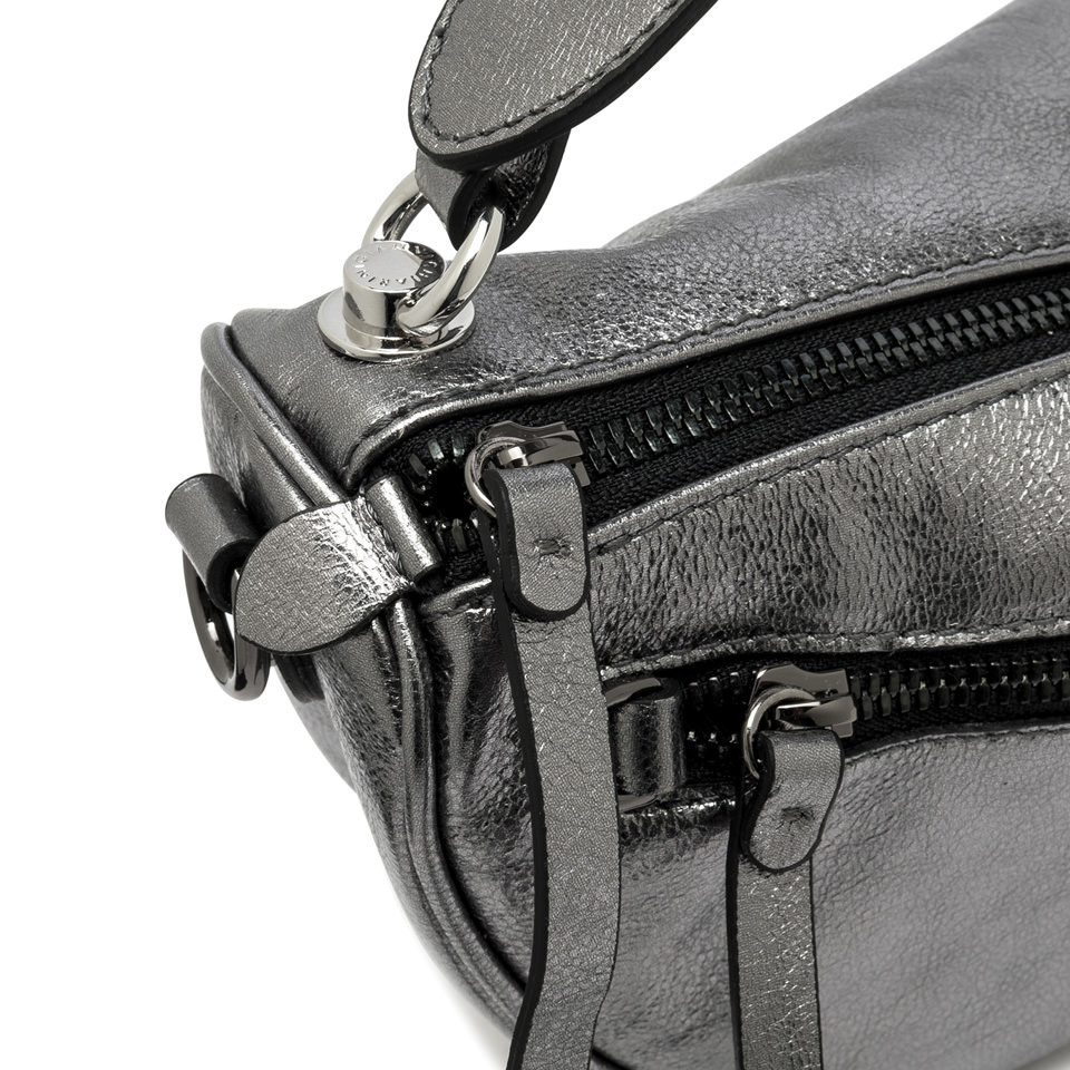 This new Cindy bag by Gianni Chiarini Firenze, made of leather with a textured and irregular effect, combines a rock and urban look with decorative zips and logoed details. It features a zip closure, a color matching handle to use it as a handbag and a front zipped pocket. Complete with a removable shoulder strap for cross-body use, it is perfect for those looking for a bold and refined style. Size: 30x16x8 cm.