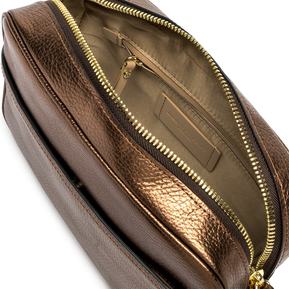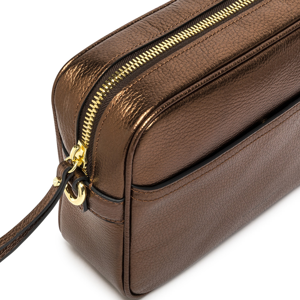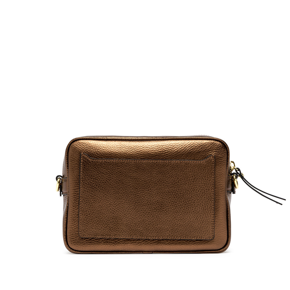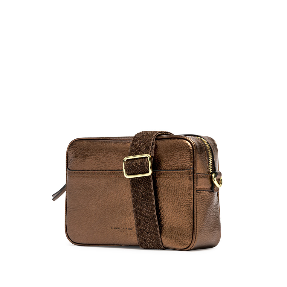 Nina by Gianni Chiarini Firenze is a practical laminated hammered leather shoulder bag, characterized by a square shape. It features a main compartment with zip closure and a flat pocket on the front. Equipped with an woven fabric shoulder strap for even more versatile use. Size: 25x19x8 cm.
