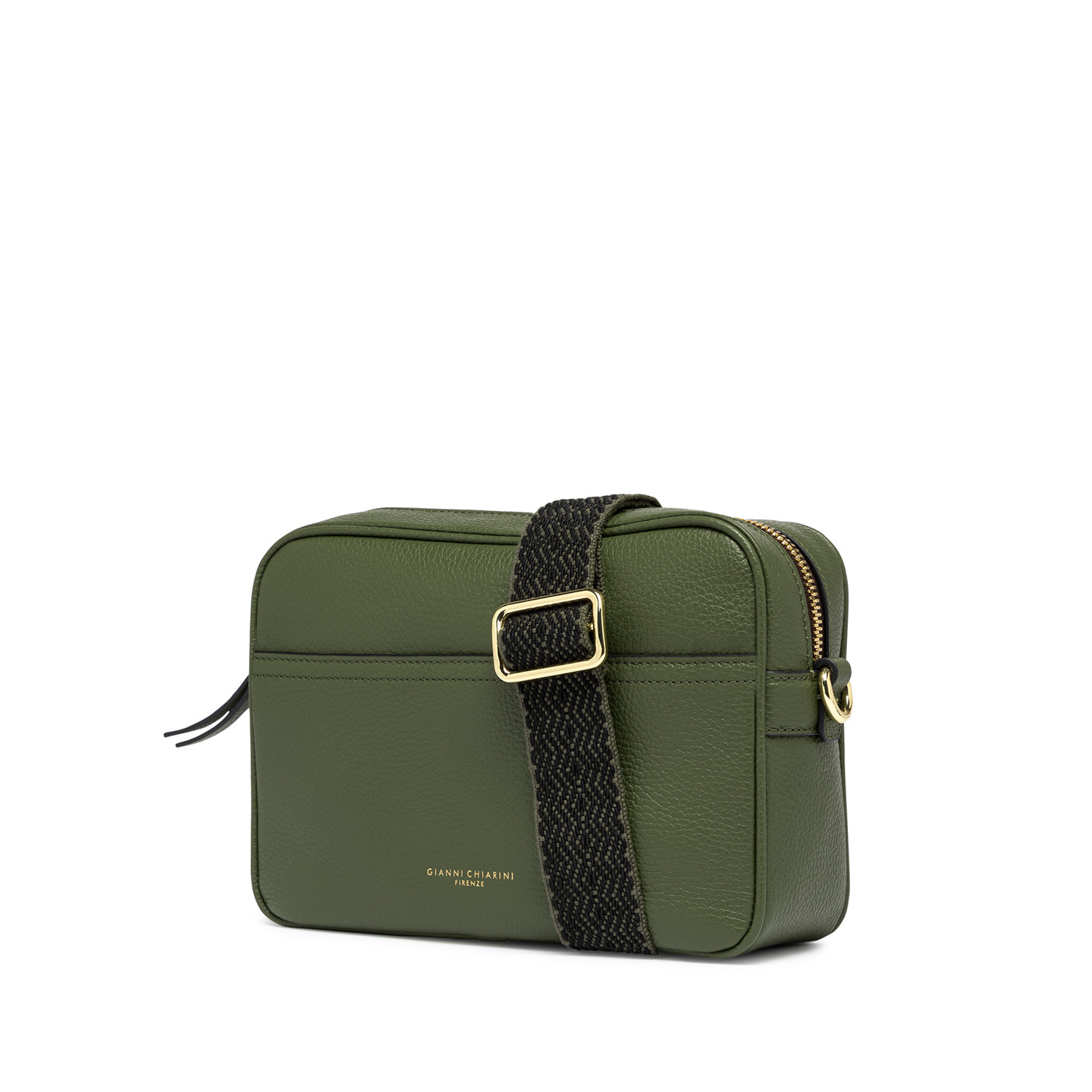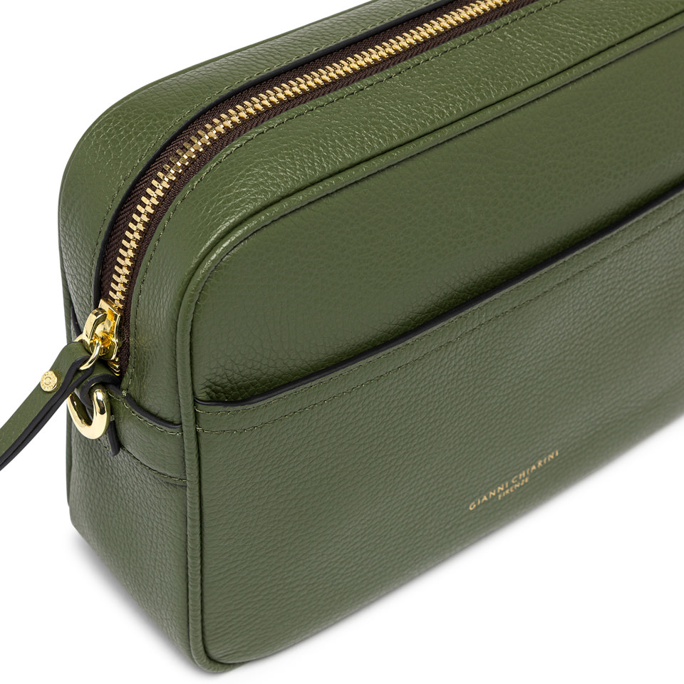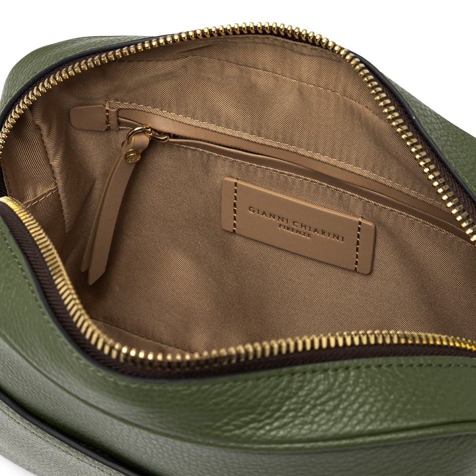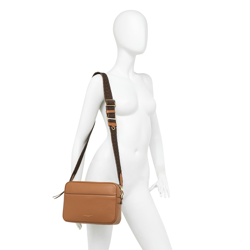 Nina by Gianni Chiarini Firenze is a practical hammered leather shoulder bag, characterized by a square shape. It features a main compartment with zip closure and a flat pocket on the front. Equipped with an woven fabric shoulder strap for even more versatile use. Size: 25x19x8 cm.