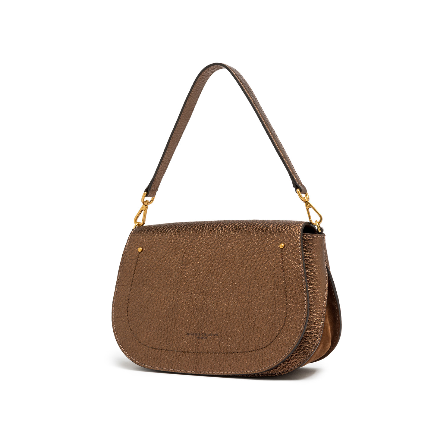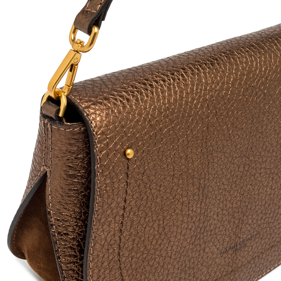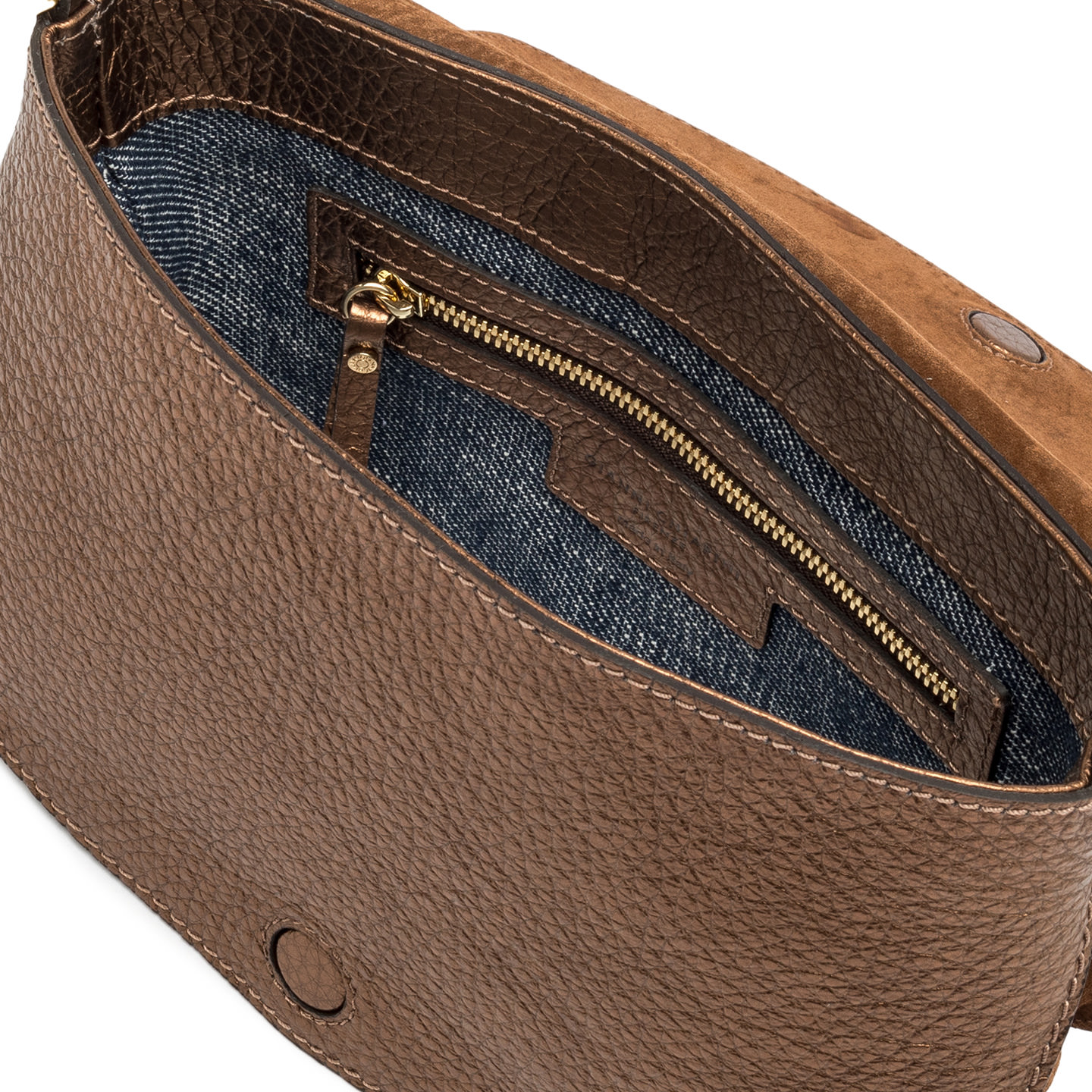 Olga is the a every-day bag by Gianni Chiarini Firenze, made in maxi-grain leather and perfect for any occasion. It features a tone-on-tone flap closure with magnetic clasp, denim lining and multi-purpose flat pocket. Equipped with a top handle and leather shoulder strap, both removable, it is practical and functional. Size: 29x18x12 cm.