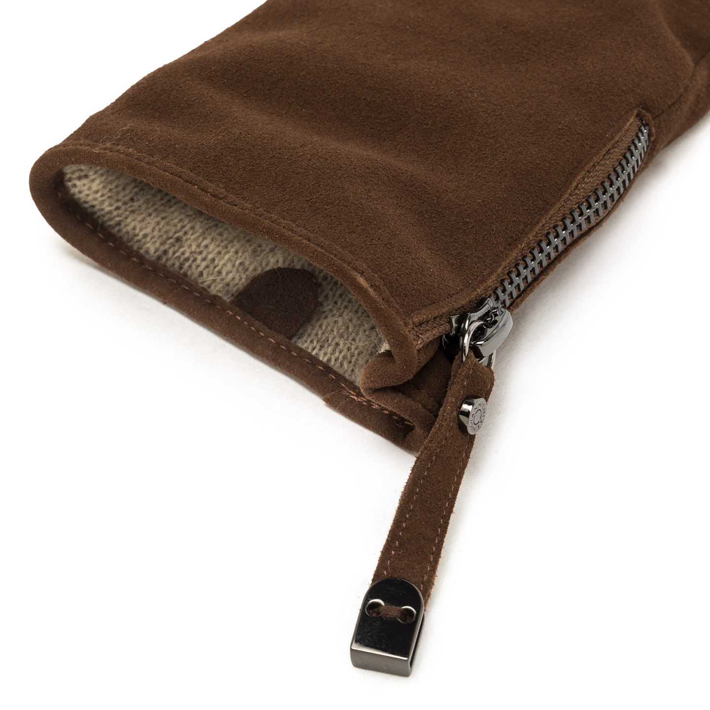 Gloves in soft chamois, lined with cozy wool for enveloping comfort. The half-zip at the bottom, gold-tone ring, and logo-embossed rivet enhance the design, adding timeless elegance. An accessory that embodies style and sophistication.