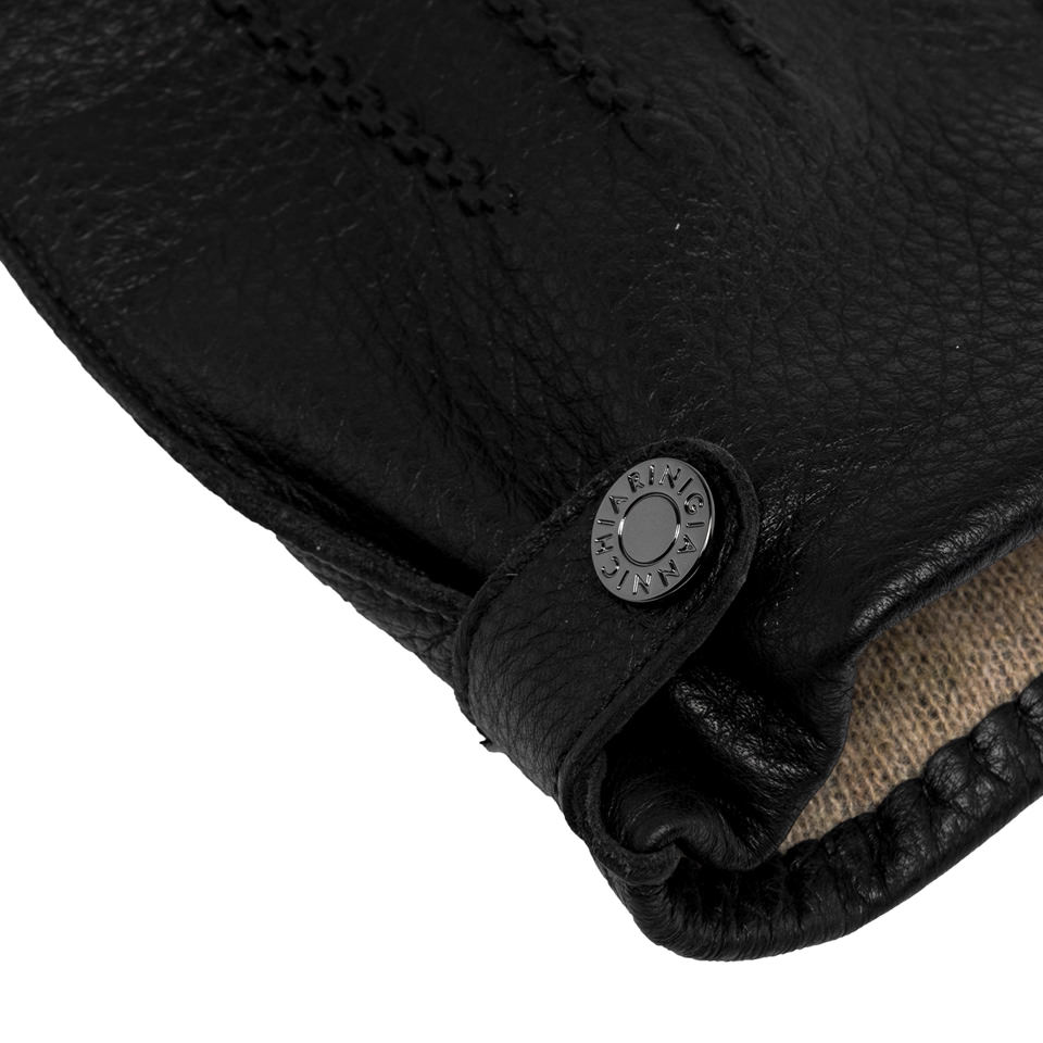 Premium leather gloves with warm wool lining. The stitching on the upper part and the wrist strap with a branded button give this accessory a refined and timeless touch. Perfect for completing any look with elegance and comfort.