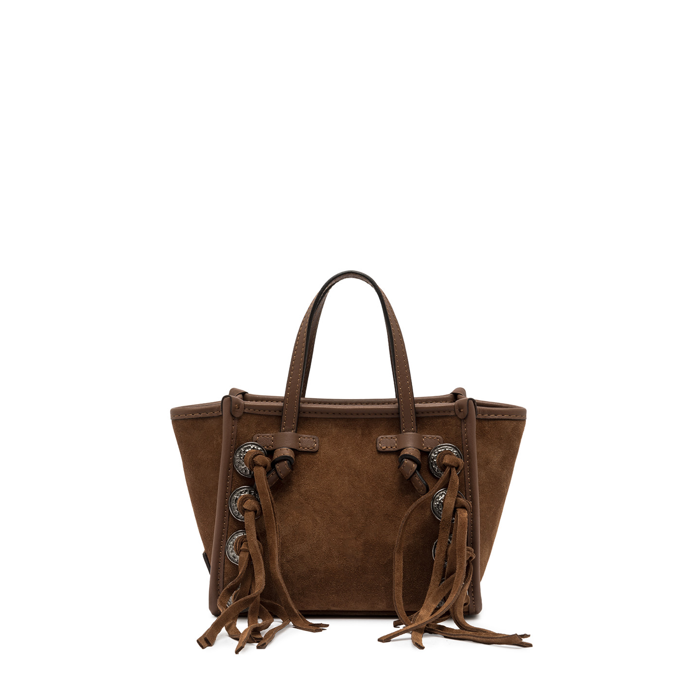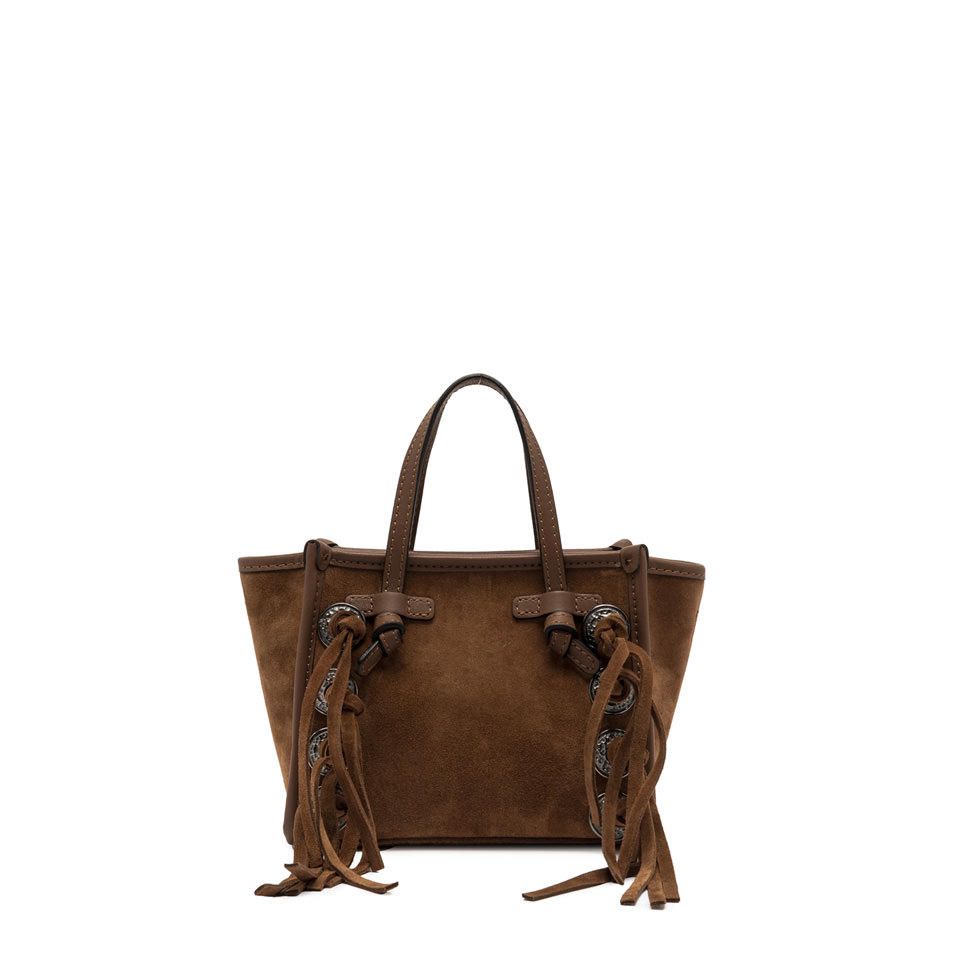 Miss Marcella bag by Gianni Chiarini Firenze is crafted from soft, silky suede leather, adorned with tone-on-tone leather fringes and studs. Enriched with leather trimmings, it features a convenient zip closure. It can be carried by hand or worn cross-body thanks to its slim, coordinated leather strap. Size: 19x15x10 cm.