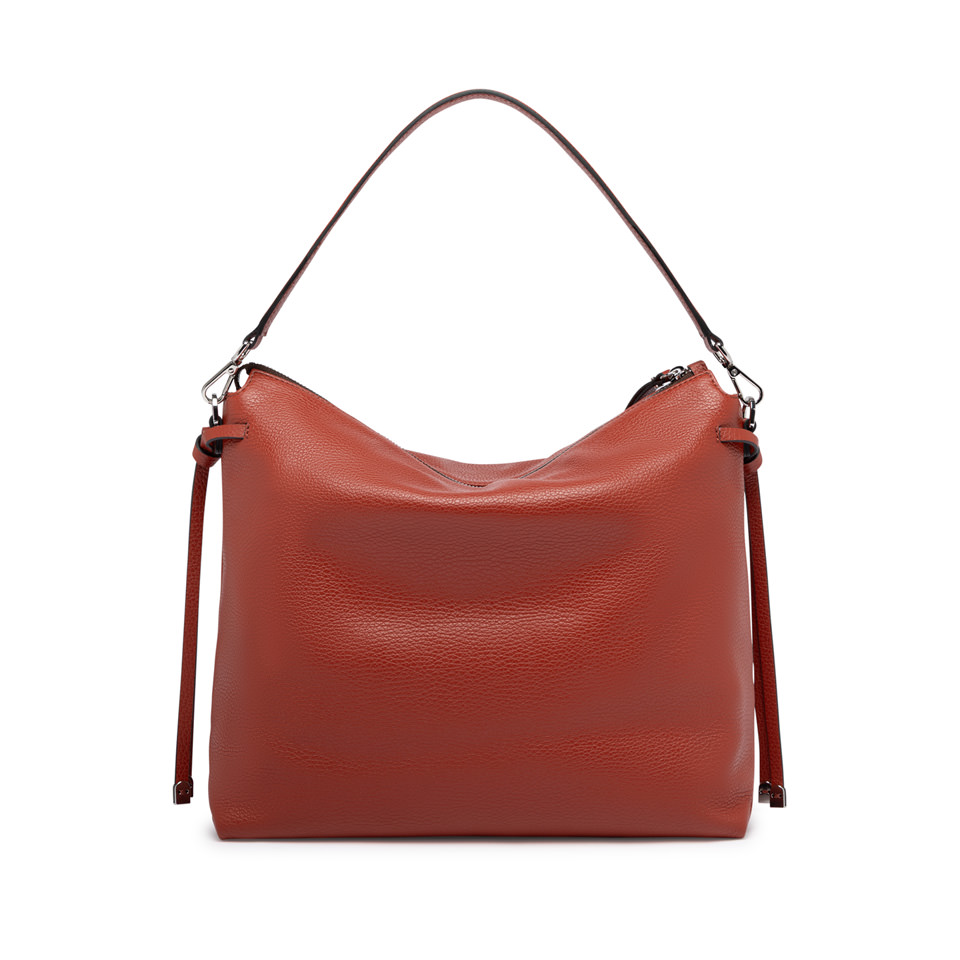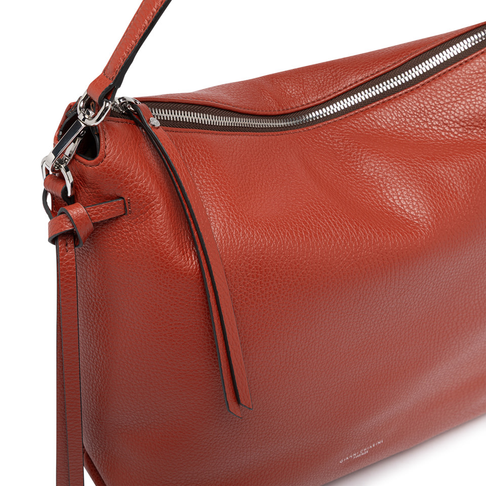 Brina by Gianni Chiarini Firenze is a hammered leather bag with minimal, squared lines. The knotted details and metal components add a touch of shine. It features a leather handle to be worn comfortably over the shoulder as well as an adjustable and removable shoulder strap for cross-body wear. The top zip closure ensures practicality and safety. Size: 32x28x11 cm.