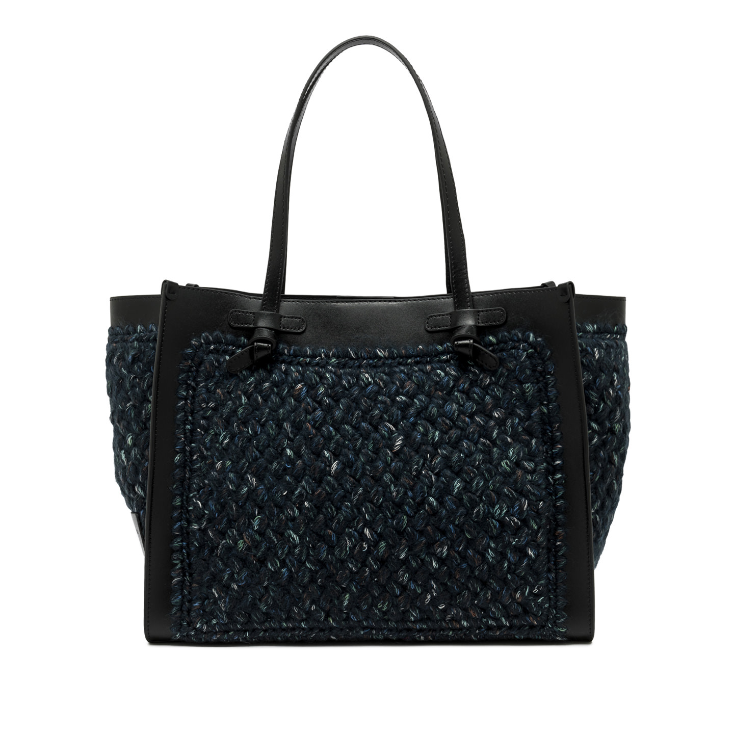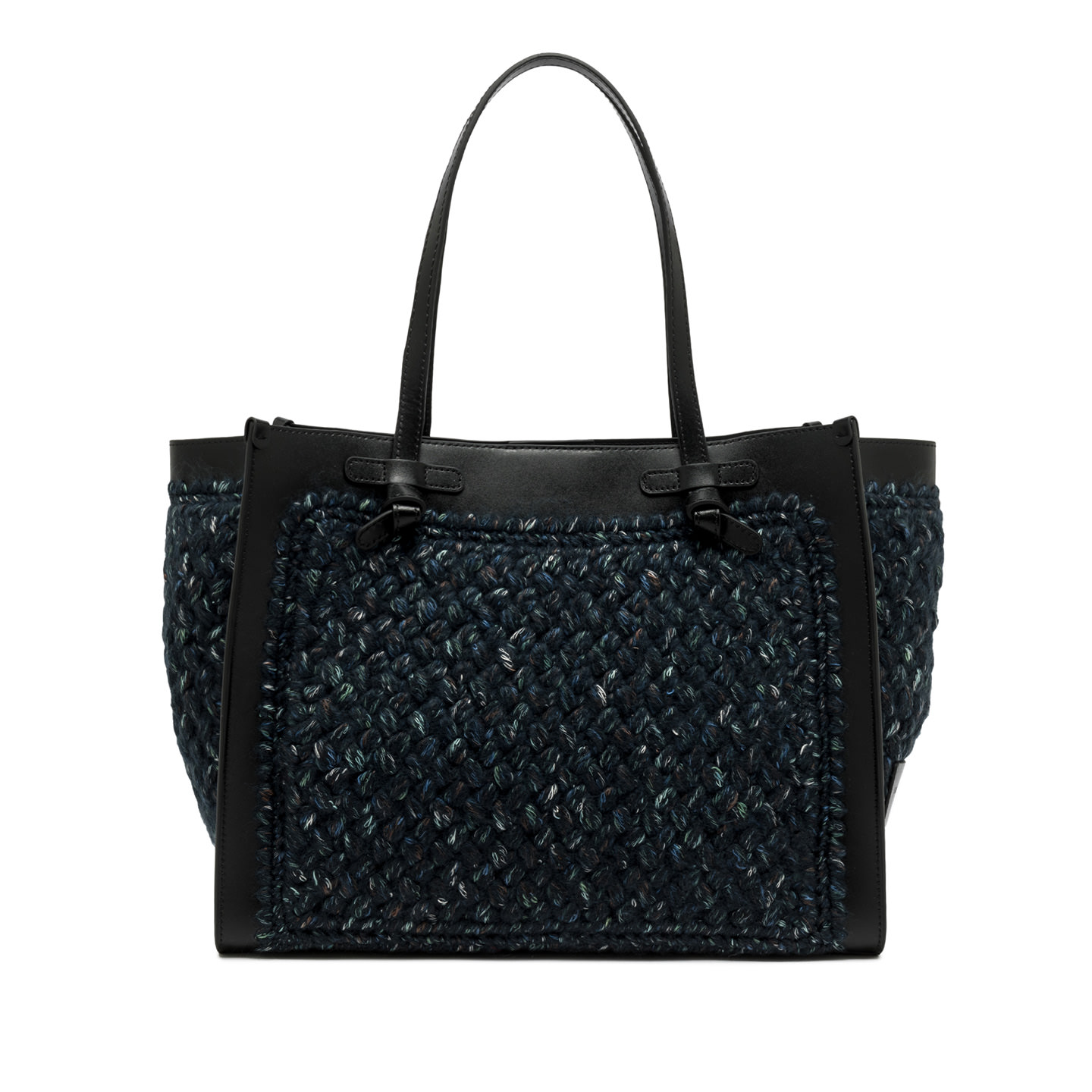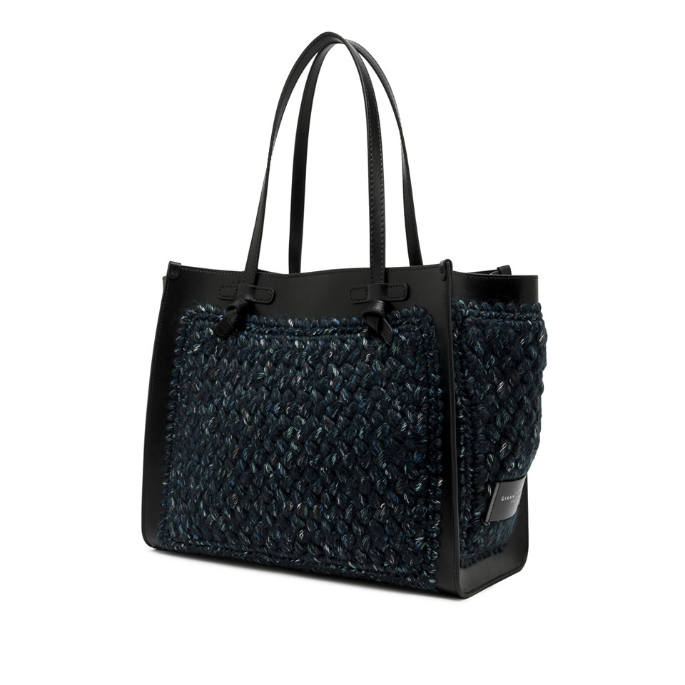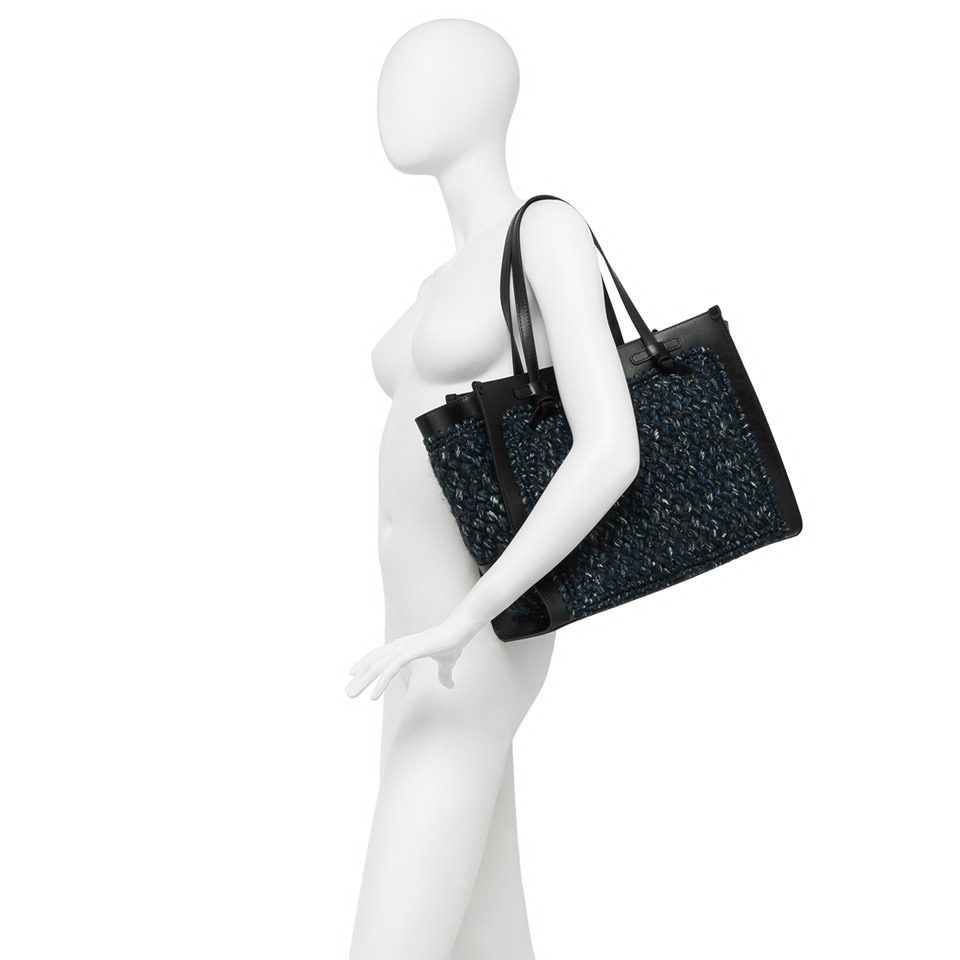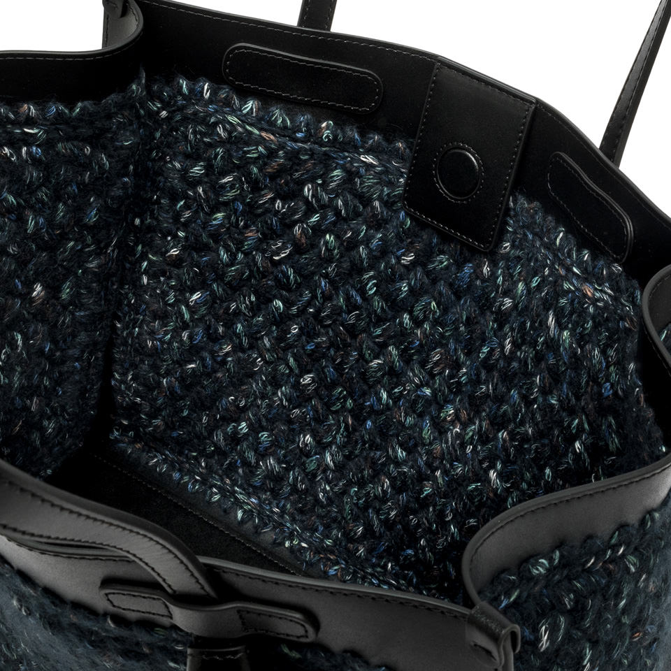 Marcella Gianni Chiarini shopping bag in wool print fabric. It comes with leather profiles, which give the bag a stylish look. Perfect for everyday use, it features leather handles and a convenient magnetic clasp closure. The leather clutch bag in the same color as the finishes make this bag unique in its kind. Size: 38x31x16 cm.